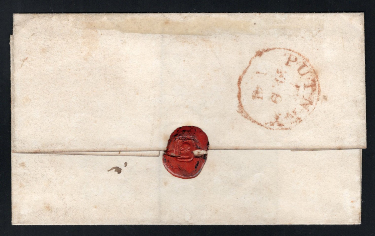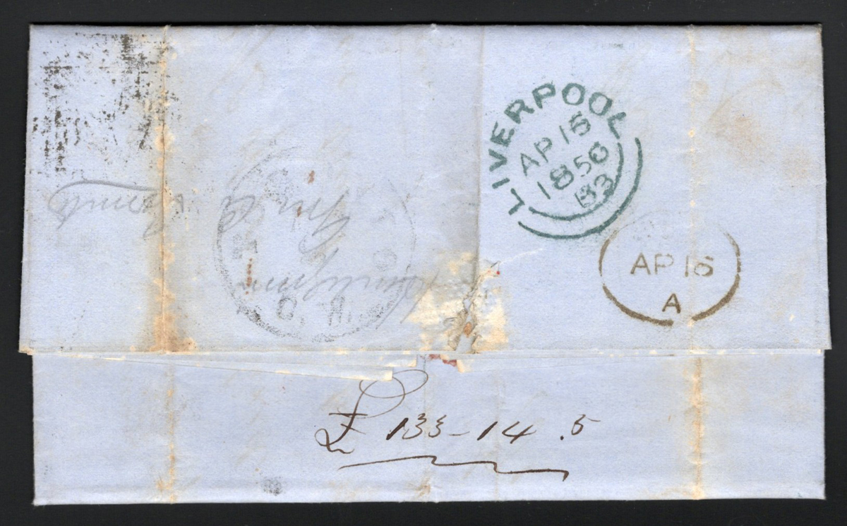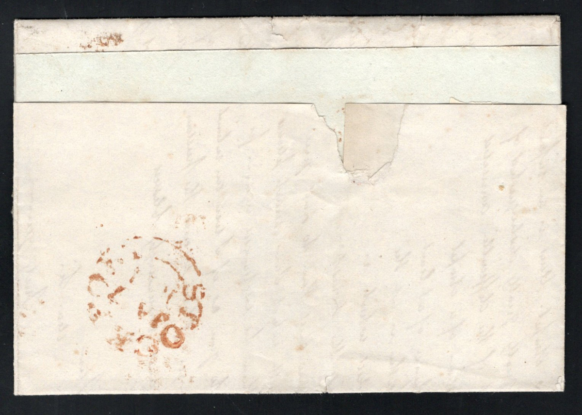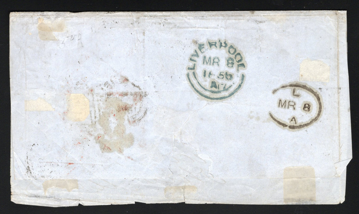 537 CVR 1 image1840 (Aug.12) Penny Black Folded Letter Mailed from Venezuela to England, mailed from Puerto Cabello, Venezuela on JUN.29.1840 (dateline inside) to Halifax, England and arrived in Liverpool on AUG.12.1840 (receiver in red) where it was taken over by a forwarding agent (boxed "FORWARDED BY / WM. ROSS & CO. / LIVERPOOL"), who added a 4-margin (close, to clear on one side) 1p black Queen Victoria imperforate adhesive (Plate 1b, position NH) tied by a red Maltese Cross cancel (same colour as the Liverpool receiver). A rare and desirable use of the Penny Black, in fact we have not found any similar examples except for one incoming from India which received similar treatment and was described at auction as one of three known (from India) and sold for U$9,300. This was the pride and joy of the owner, as it was given to him by a neighbour when he was a child. The neighbour had a family connection to the senders in Venezuela, and this is the first time it appears on the market.