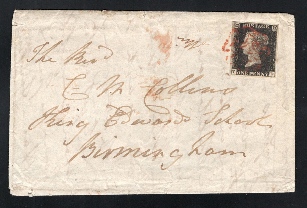 531 CVR 1 image1d Black Queen Victoria Imperforate on 1840 Folded Letter, mailed from St Columb on DEC.2.1840 (green despatch on back) to Birmingham (DEC.4.1840 receiver in red on back), franked with a 4-margin 1d black QV imperforate (pos. TD), tied by a Maltese Cross cancel in bright red. Overall fine. (Scan 1) (Scan 2) (All Scans) (All Images)