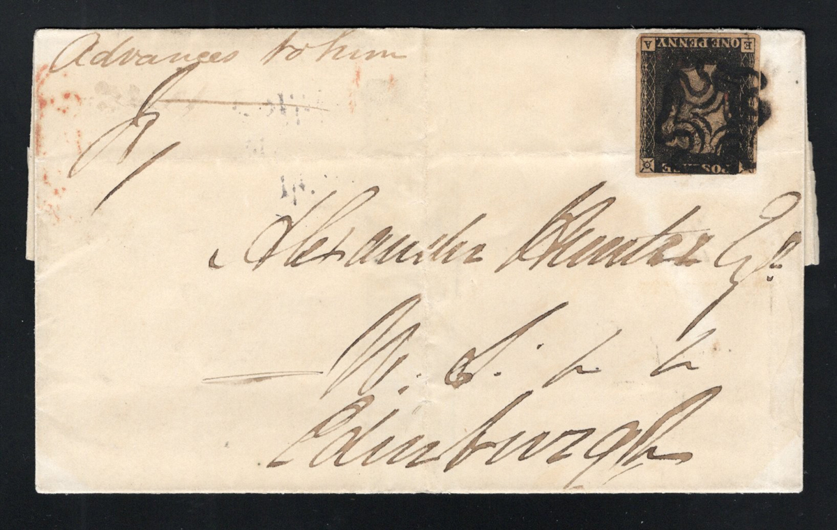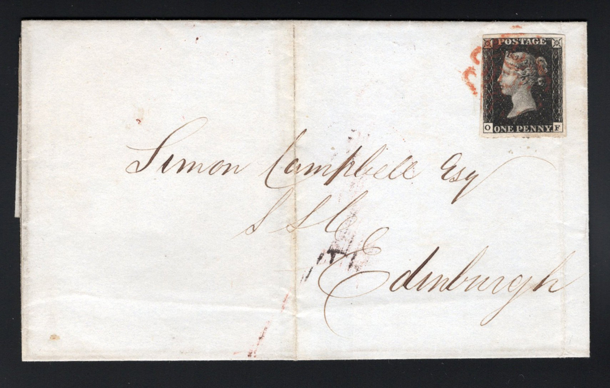 534 CVR 1 image1d Black Queen Victoria Imperforate on 1840 Folded Cover, mailed from Glasgow on AUG.7.1840 (red despatch on back) to Edinburgh (neat AUG.8.1840 receiver on back), franked with a 3½-margin 1d black QV imperforate (pos. OF, pencil notation "Pl.6"), tied by a Maltese Cross cancel in red. Overall fine. (Scan 1) (Scan 2) (All Scans) (All Images)