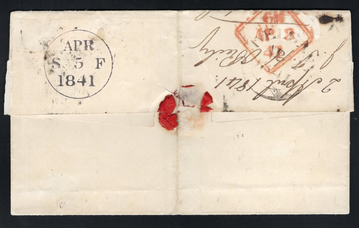 532 CVR 1 image1d Black Queen Victoria Imperforate on 1841 Folded Cover, mailed from "__ELSANY" on APR.2.1841 (part double circle datestamp on back) to Edinburgh (neat APR.5 receiver on back), through London (APR.3.1941 red diamond on back), franked with a 3-margin 1d black QV imperforate (pos. EA), tied by a Maltese Cross cancel in black. Light horizontal bend runs through the stamp, still overall fine. (Scan 1) (Scan 2) (All Scans) (All Images)