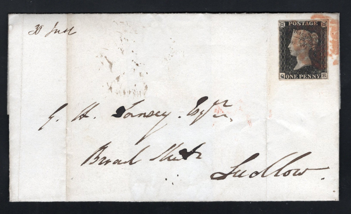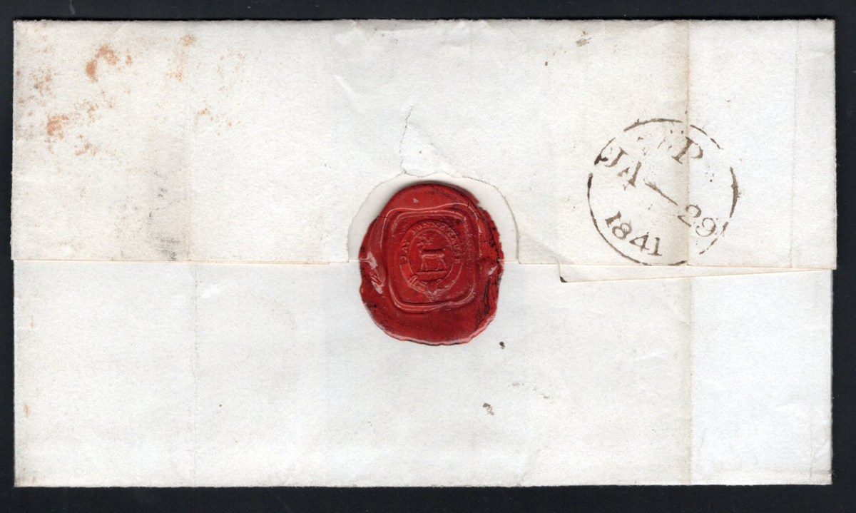 533 CVR 1 image1d Black Queen Victoria Imperforate on 1841 Folded Letter, mailed on JAN.29.1841 (black despatch on back, plus docketing) to Ludlow, franked with a 3-margin 1d black QV imperforate (pos. QH), tied by a Maltese Cross cancel in red. Neat wax seal in red shows a buck and reads "May Bonne Cause" in a belt-buckle, fine. (Scan 1) (Scan 2) (All Scans) (All Images)
