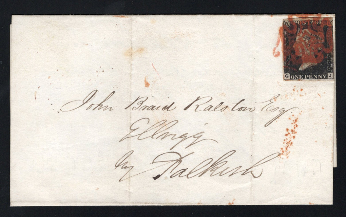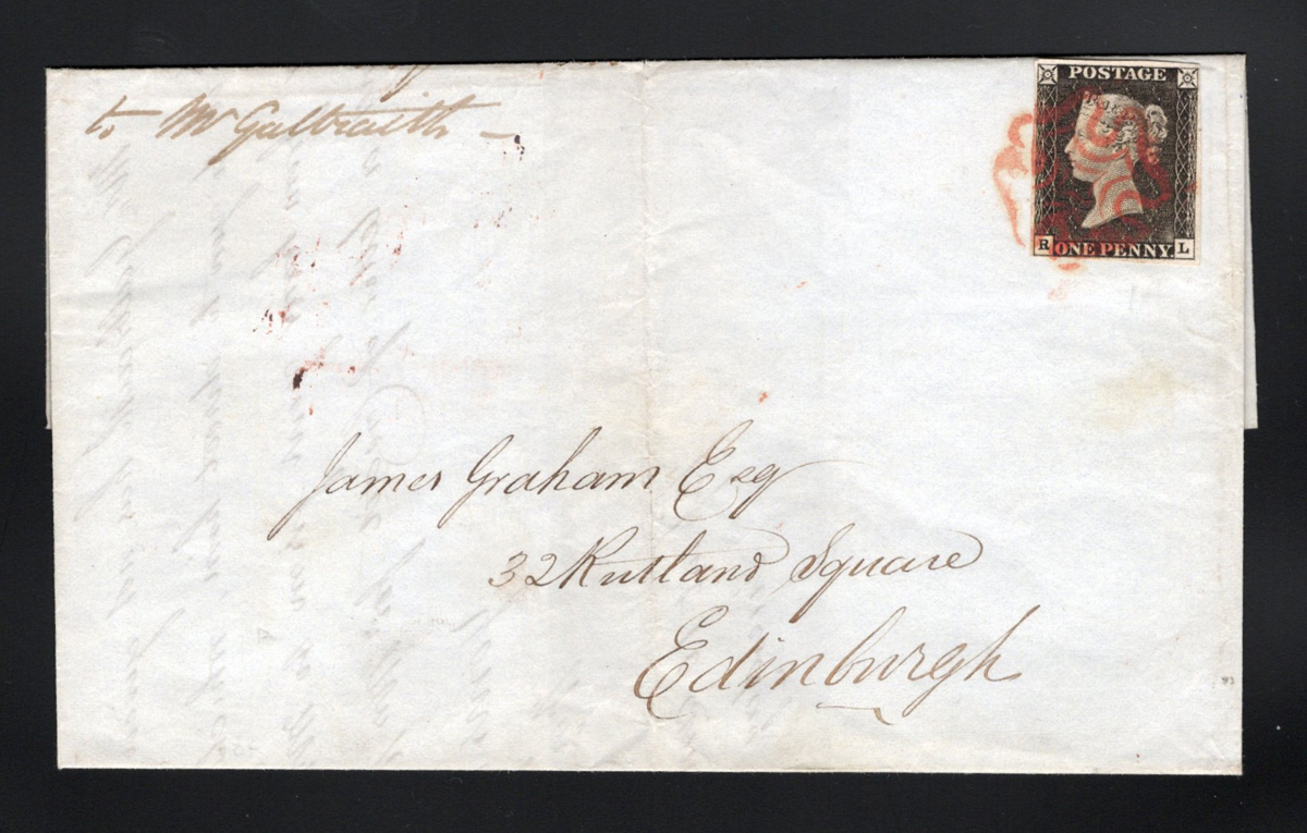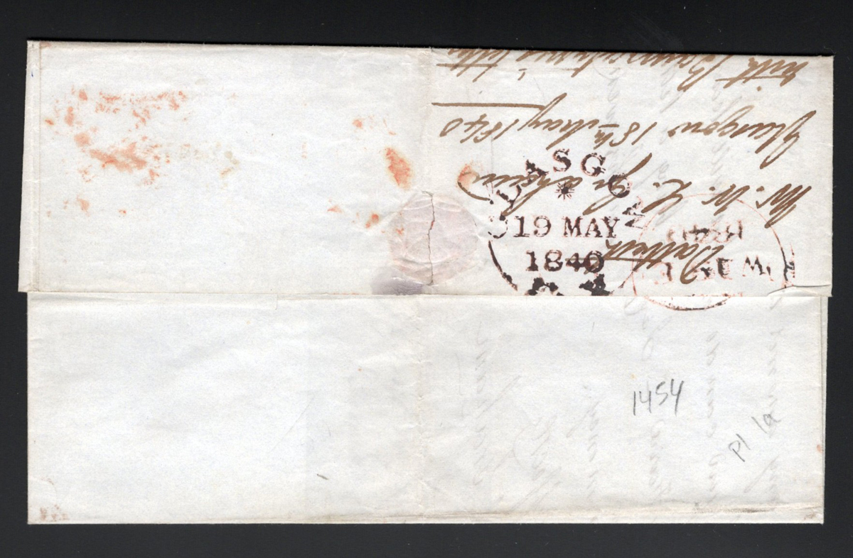 535 CVR 1 image1d Black Queen Victoria Imperforate on 1840 Folded Letter, mailed from Glasgow on MAY.19.1840 (red despatch on back) to Edinburgh (indistinct receiver on back), franked with a 4 close to well clear margin 1d black QV imperforate (pos. RL, pencil notation "Pl.1a"), tied by a Maltese Cross cancel in red. Overall fine. (Scan 1) (Scan 2) (All Scans) (All Images)