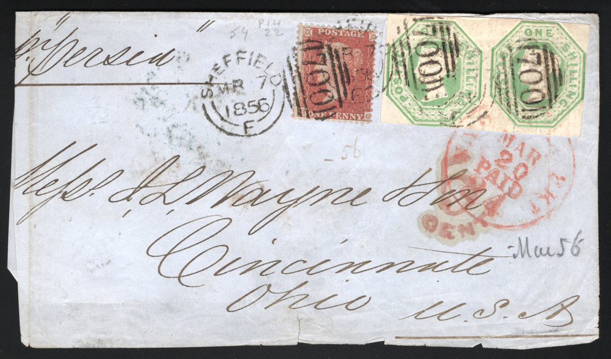 539 CVR 5 imagePair of 1sh QV Embossed on Cover to United States, mailed from Sheffield on MR.7.1856 (three duplex #700 strikes) to Cincinnati, Ohio, through Liverpool (MAR.8.1856 transit in green), endorsed "per Persia", with US packet MAR.20 receiver and "5 CENTS" handstamp. The folded cover is franked with a perforated Penny Red plus a very fine horizontal pair of the embossed 1sh green imperforates (Die 2), which each have 4 clear margins. The cover (no letter inside) has been reduced , still a scarce franking and lovely pair of the 1sh. Catalogue value for two 1sh singles is U$2,000 in Scott and £2,200 in S.G. alone. (Scan 1) (Scan 2) (All Scans) (All Images)