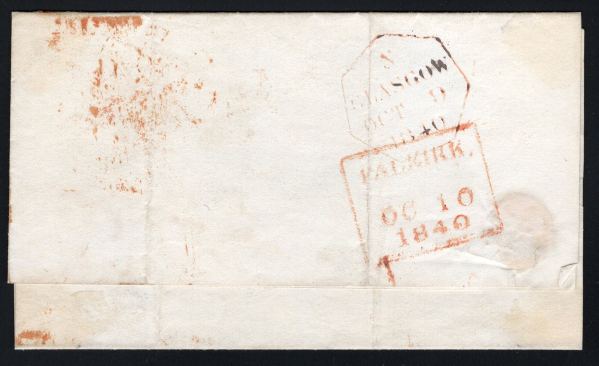 536 CVR 1 image1d Black Queen Victoria Imperforate on 1840 Folded Letter, mailed from Glasgow on AUG.9.1840 (red octagonal despatch on back) to Falkirk (OCT.10 boxed receiver in red on back), franked with a 3 margin (just clear at left) 1d black QV imperforate (pos. GJ), tied by a Maltese Cross cancels in bright red. Overall fine. (Scan 1) (Scan 2) (All Scans) (All Images)