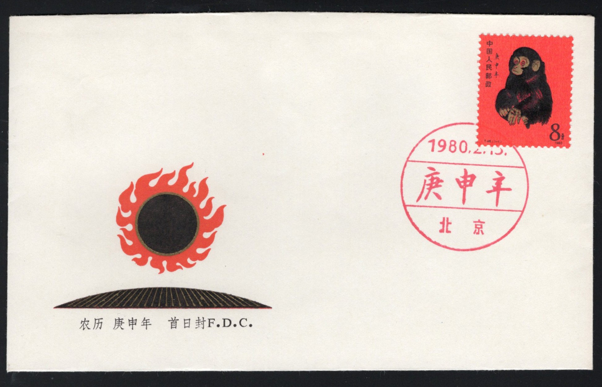 525 CVR 1586 image1980 8f New Year Monkey First Day Cover, a very fine stamp tied by a red FEB.15.1980 c.d.s., with cachet, very fine and rare. Scott catalogue value for the used stamp alone is U$675. (Scan 1) (Scan 2) (All Scans) (All Images)