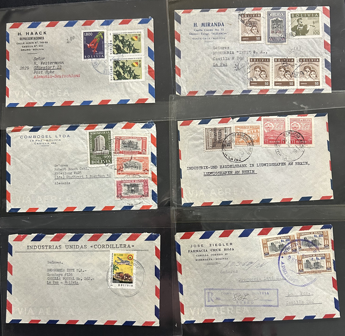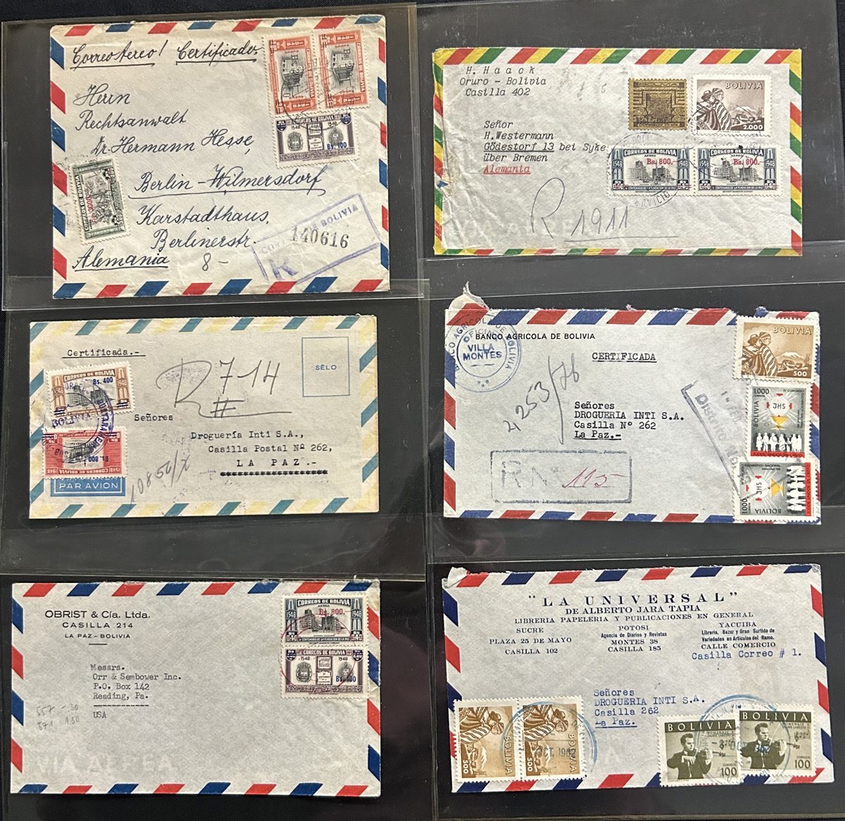 521 CVR   imageGroup of About 100 Interesting Bolivian Covers, 1939-1963, consisting of mostly airmail, but also domestic and registered usages with many having business corner cards. Most have high rate frankings and all covers are sleeved and very fine. Our pictures show an overview as well as some examples. (Scan 1) (Scan 2) (Scan 3) (All Scans) (All Images)