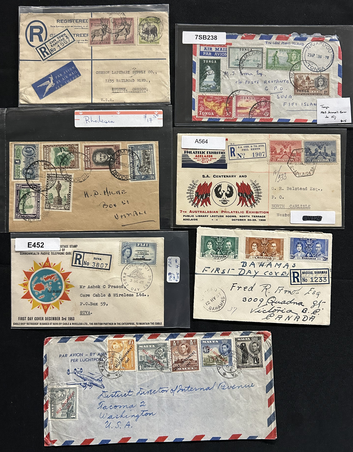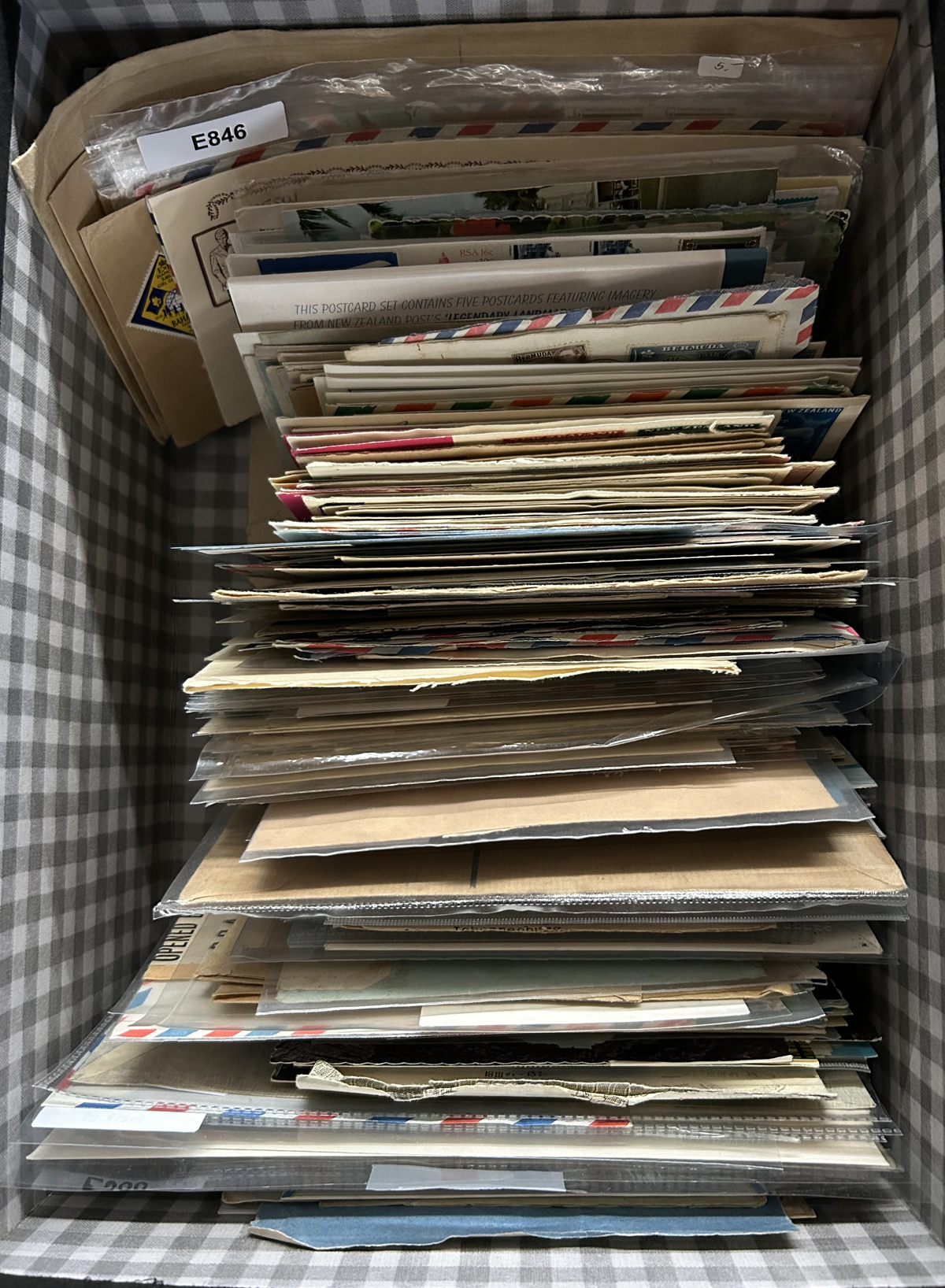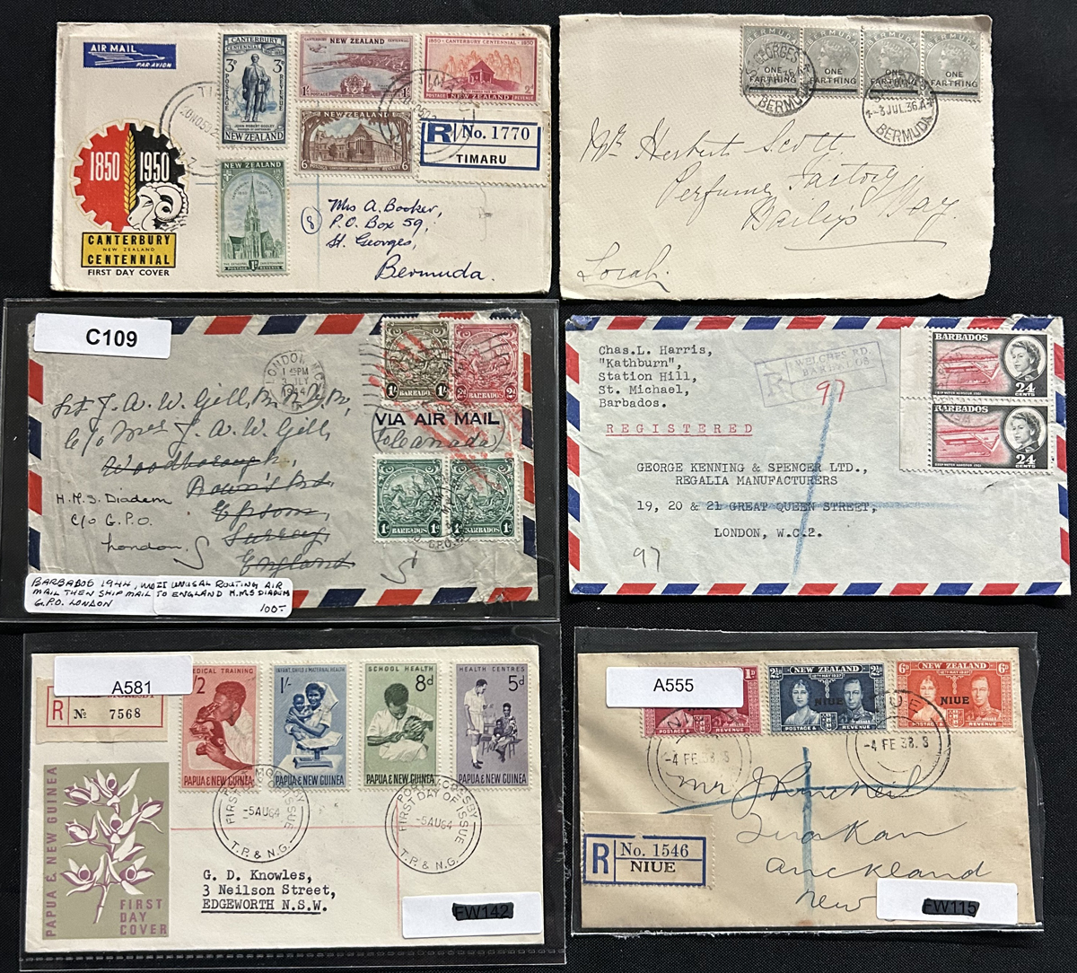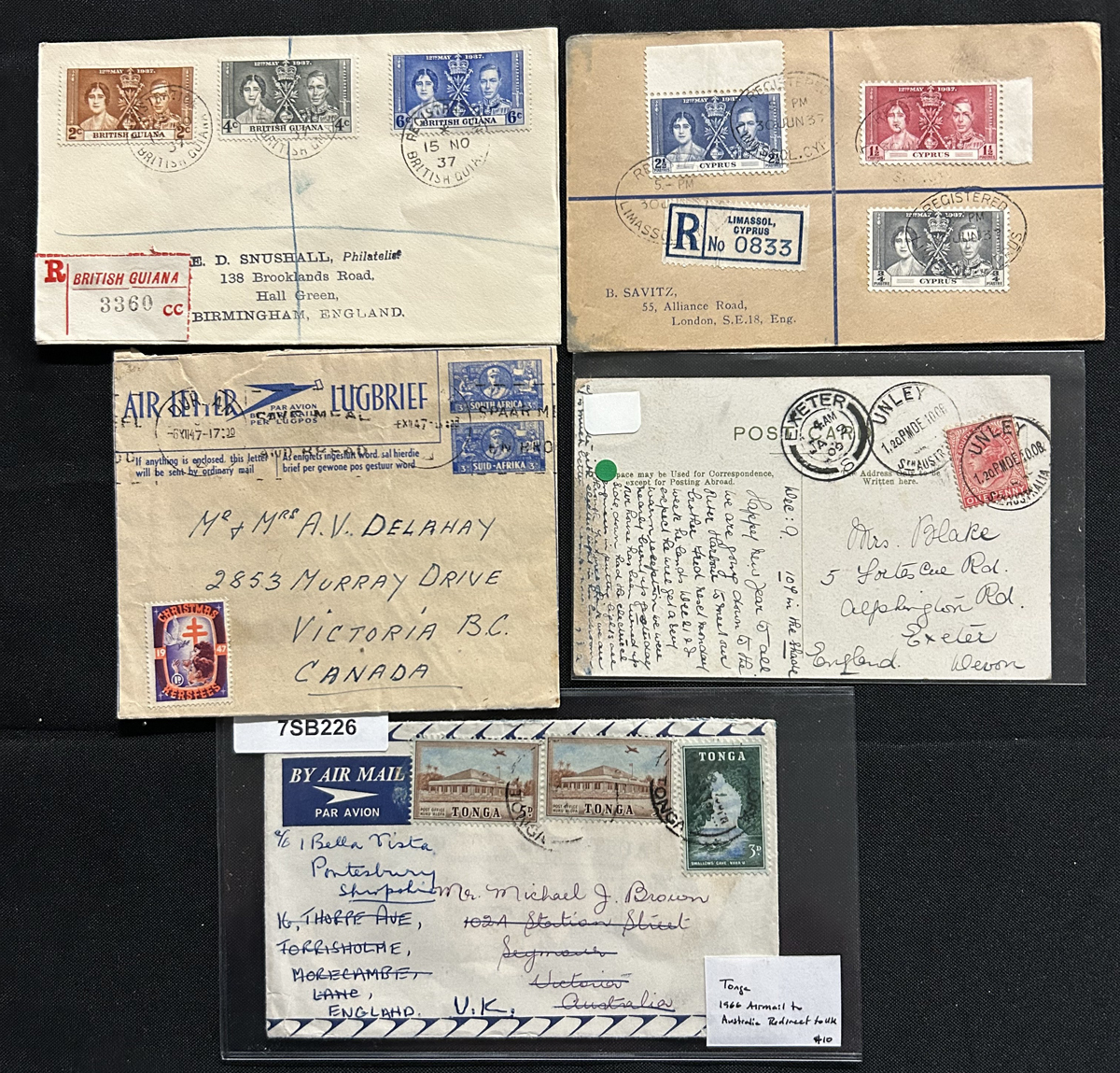 522 CVR/PC   imageGroup of About 550 British Commonwealth Country Covers and Cards, with a wide variety of material from Australia and States, New Zealand, Caribbean, Africa, Gibraltar, Hong Kong, Pacific islands, India, etc., with no Canada or GB. We note lots of airmail, registered, frankings, postmarks, censored, aerogrames, many 1937 first days, and much more, with many mailed to Canada. Some have faults, still overall fine with some better, see photos to get a good idea of the contents. (Scan 1) (Scan 2) (Scan 3) (Scan 4) (Scan 5) (Scan 6) (All Scans) (All Images)