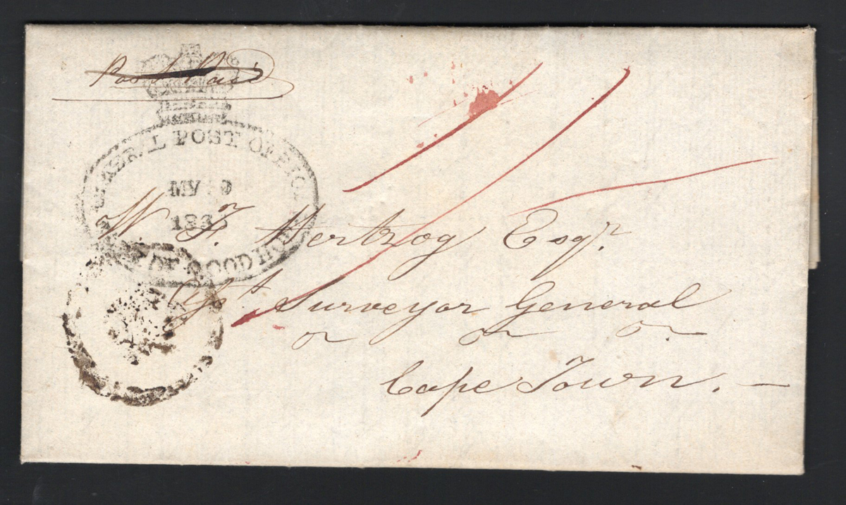 523 CVR   image1836 Stampless Folded Letter Balfour to Cape Town, a lengthy 4 page letter datelined Balfour 9th May 1836 and addressed to Hertzog, Surveyor General / Cape Town. Despatch is a blurry crowned Post Office Balfour handstamp (likely) alongside a crowned oval General Post Office / Cape of Good hope datestamp with MAY.9.1836 date, plus "1" manuscript rating in red. Very fine. (Scan 1) (Scan 2) (All Scans) (All Images)