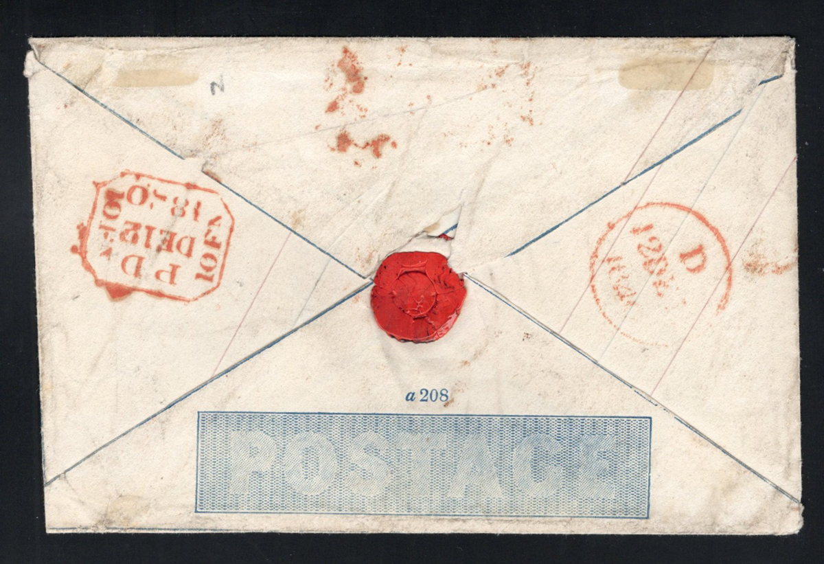 544 CVR U2 image1840 2d Blue Mulready Envelope, mailed on DEC.12.1840 to Cambridge Terrace near London, with a red Maltese Cross and a same day receiver in red on back, plus an indistinct (...SENDEN) town postmark on front. Stereo "a208", showing light overall aging, still scarce and fine. S.G. ME4, £2,500. (Scan 1) (Scan 2) (All Scans) (All Images)