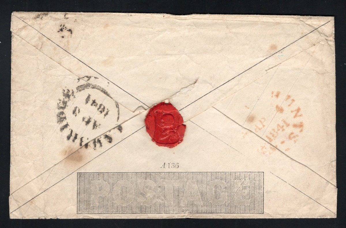 542 CVR U1 image1840 1d Black Mulready Envelope, mailed from Cambridge on APR.3.1841 to St Ives, with a black Maltese Cross and a next day receiver in red on back. Stereo "A136" (Forme 1), showing light overall aging, still fine. S.G. ME3, £550. (Scan 1) (Scan 2) (All Scans) (All Images)