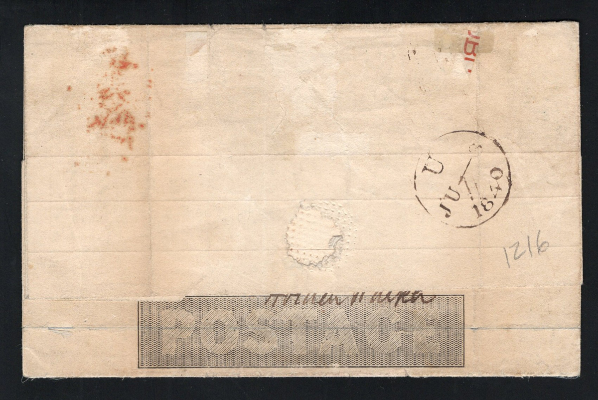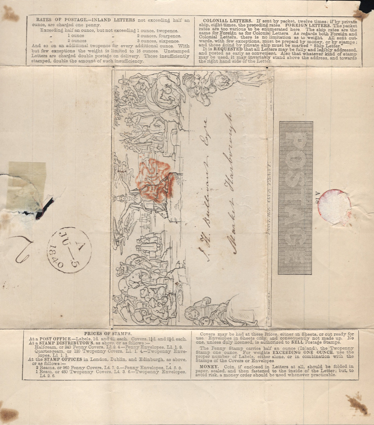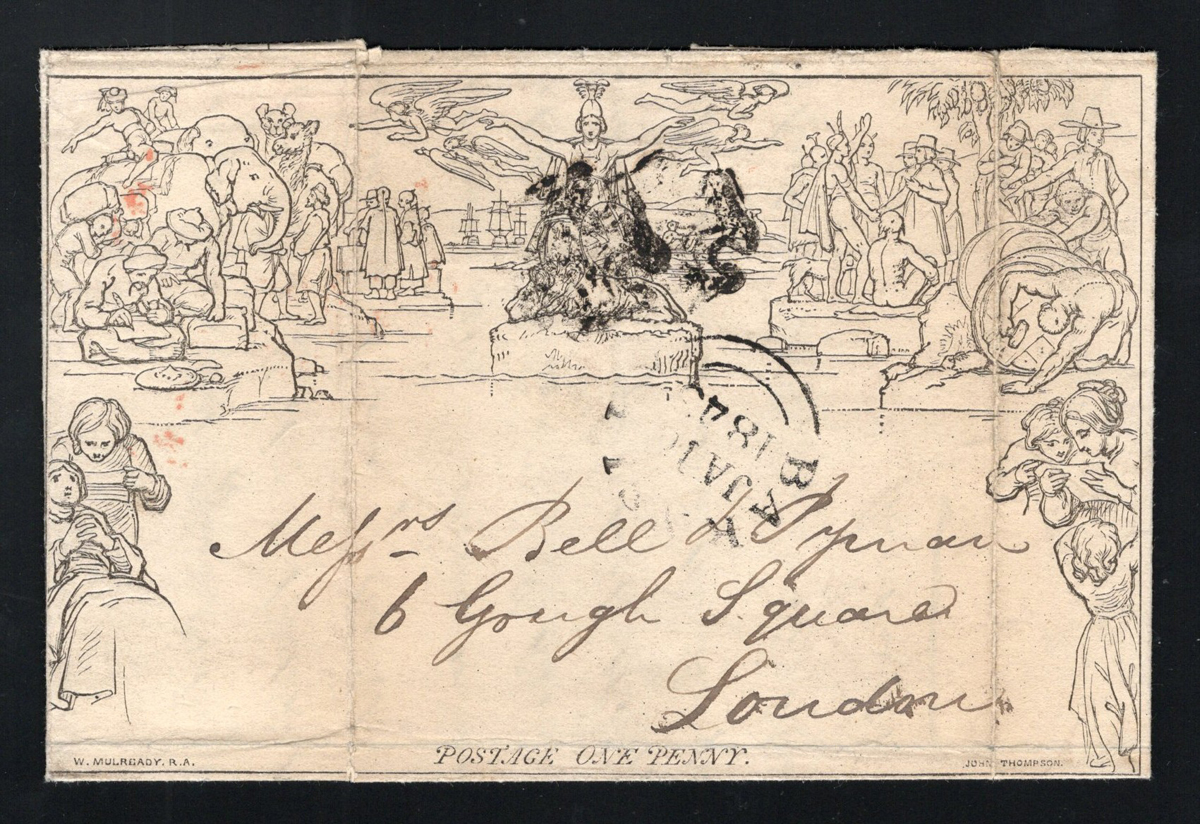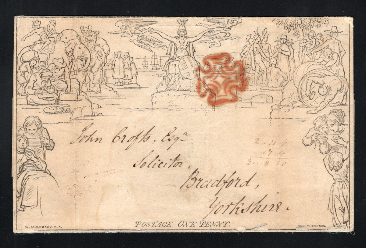 546 CVR U3 image1840 1d Black Mulready Letter Sheet, mailed on JUN.6.1840 to Bradford (there is a "JUN.3.1840" docketing inside), with a red Maltese Cross almost missing Britannia. Stereo "A1" (Forme 1), showing a few light creases and overall aging, still fine. S.G. ME1, £550. (Scan 1) (Scan 2) (All Scans) (All Images)