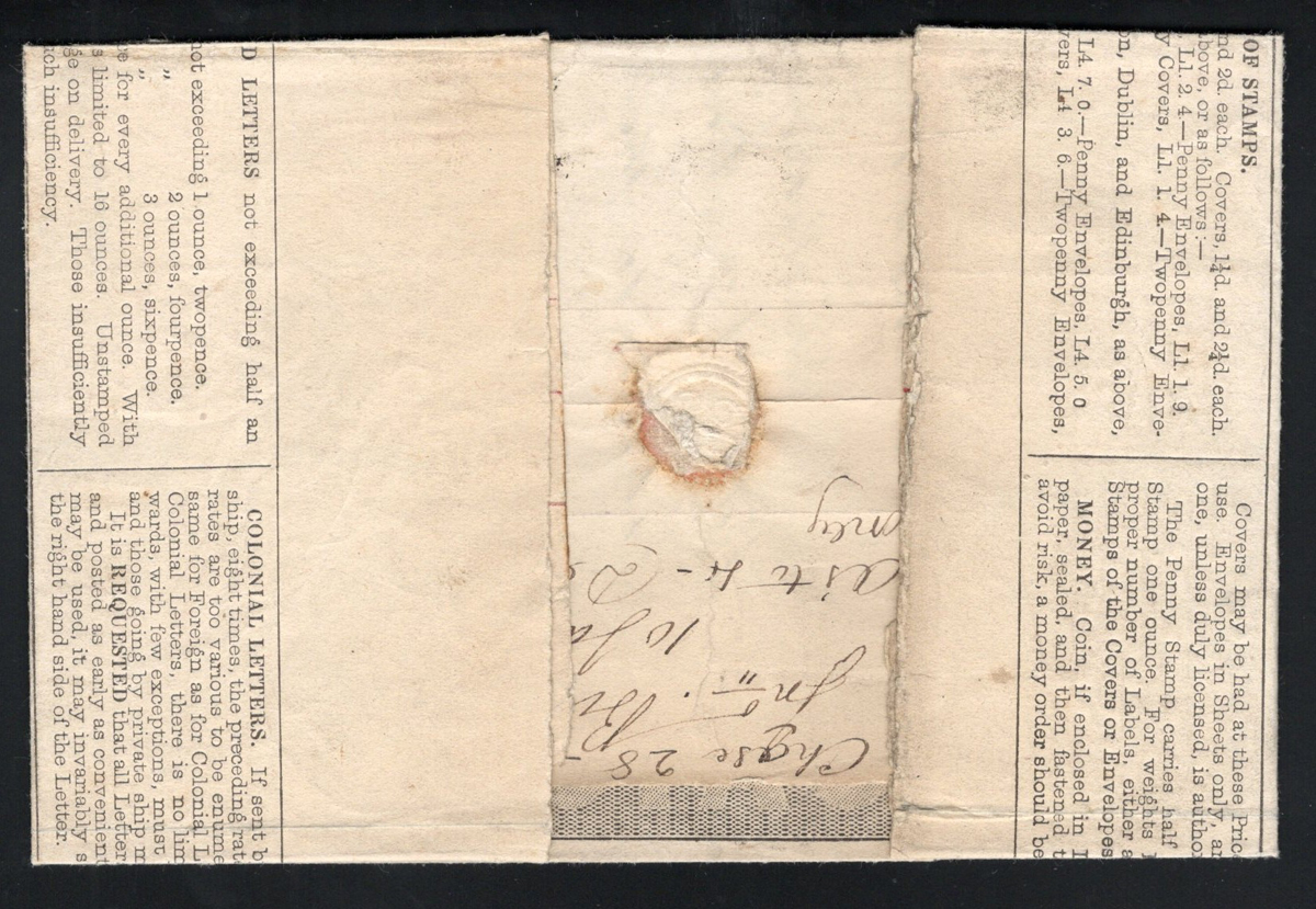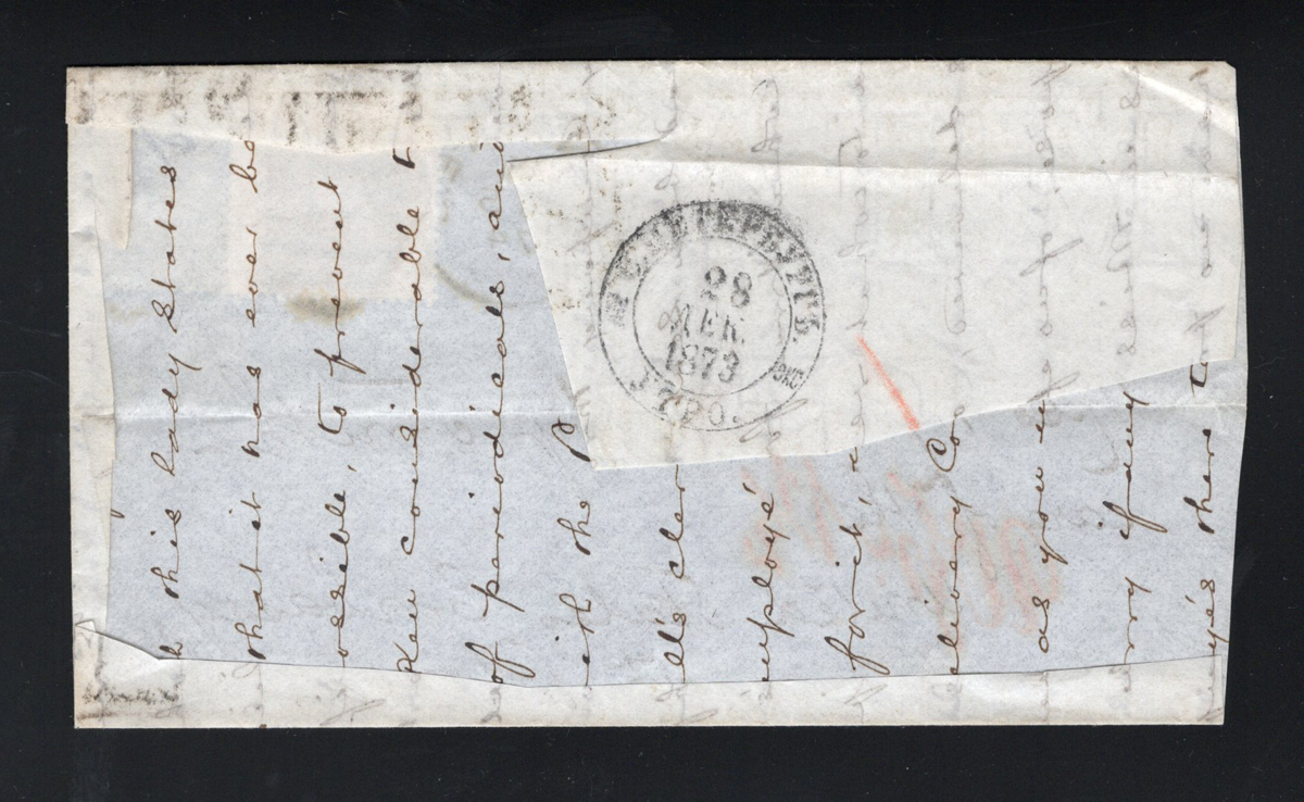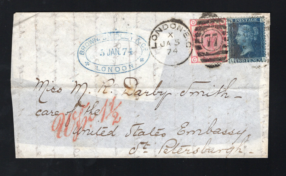 541 CVR 30, 61 image1874 Folded Cover Great Britain to Russia, mailed from the Brown Shipley & Co. in London on JAN.5.1874 ("77" duplex ties stamps) to the United States Embassy in St. Petersburg, Russia, with JAN.28.1873 (error in year) receiver on back. The folded cover (missing large part of the letter) is franked with Scott #s 30 (plate 14, $80 on cover) and 61 (plate 12, $140 on cover) paying 5d. There is a red-orange "W fr 1½" German handstamp at left indicating postage due on arrival. A fine cover. (Scan 1) (Scan 2) (All Scans) (All Images)