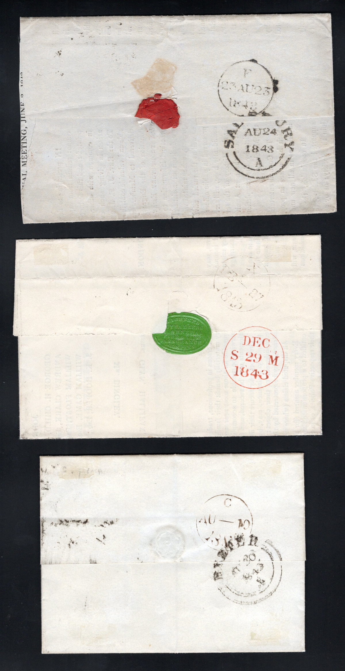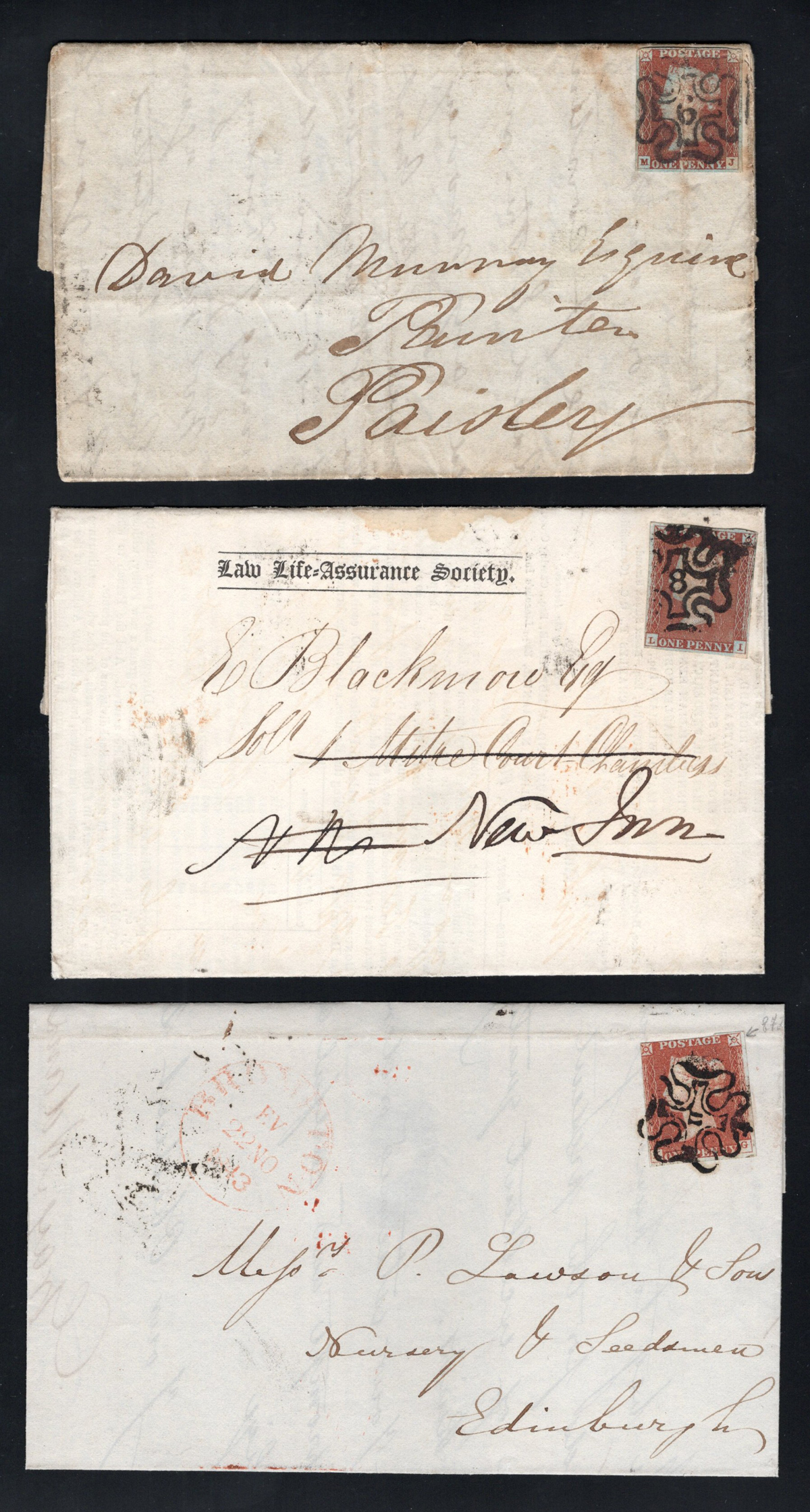549 CVR   imageGroup of 6 Penny Red Covers with Numbered Maltese Cross Cancels, with #s 6 (F, on cover to Paisley, with crease through stamp), 6 (F, on cover to Salisbury), 7 (VF on cover to Exeter), 8 (F, on local printed matter cover), 9 (F-VF on cover to Edinburgh), and 11 (F-VF on cover to Edinburgh). Both sides photographed to see back stamps, overall fine. Scott catalogue value is U$3,625. (Scan 1) (Scan 2) (Scan 3) (Scan 4) (All Scans) (All Images)