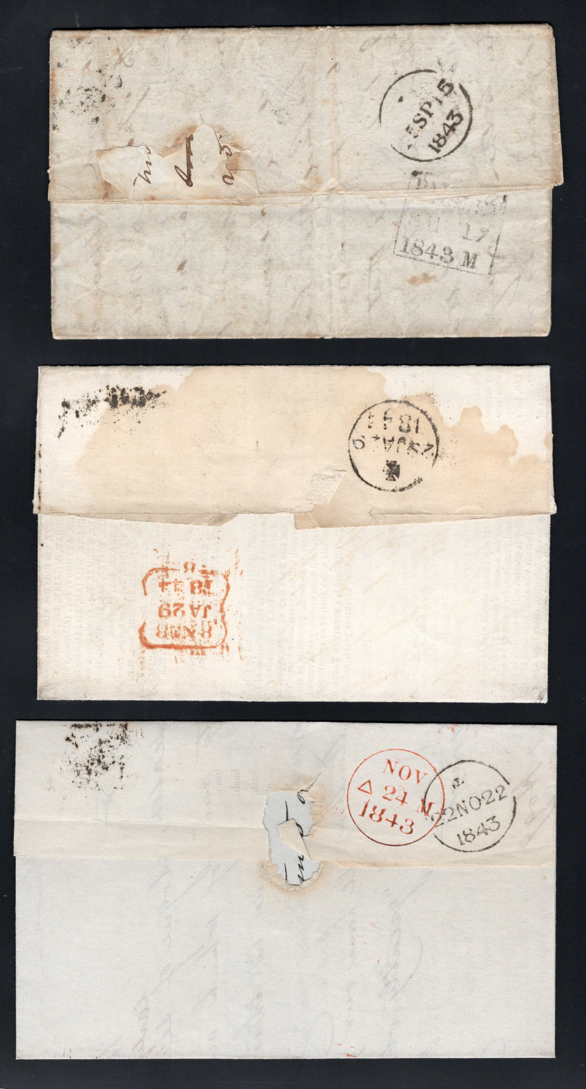 547 CVR U3 image1840 1d Black Mulready Letter Sheet, mailed from Barnsly on JAN.10.1843 (datestamp on front, plus dateline inside) to London, with two black Maltese Cross cancels. Stereo "A22" (Forme 2), showing a few creases and overall aging, still fine. S.G. ME1, £550. (Scan 1) (Scan 2) (All Scans) (All Images)