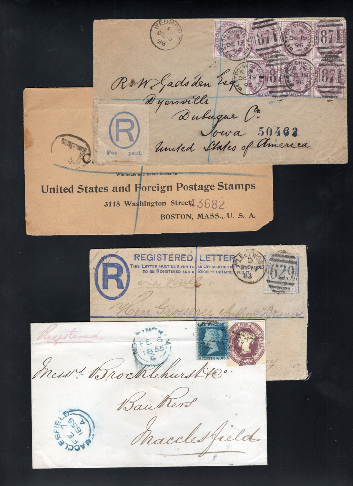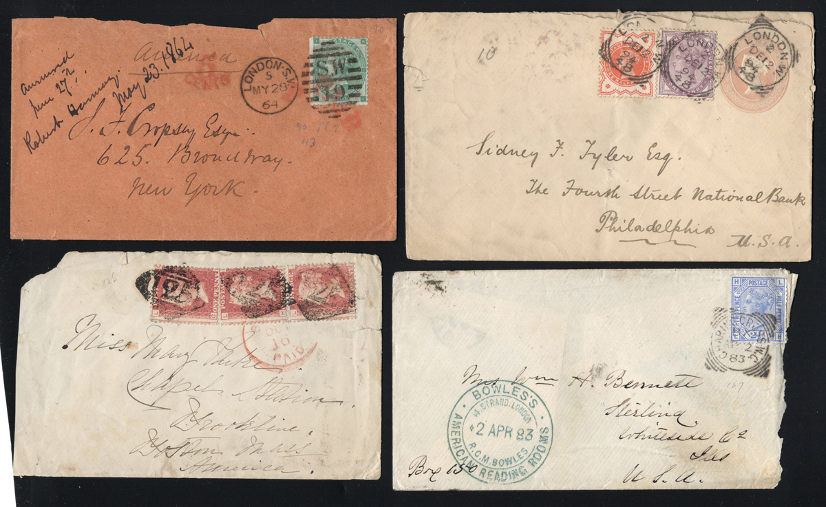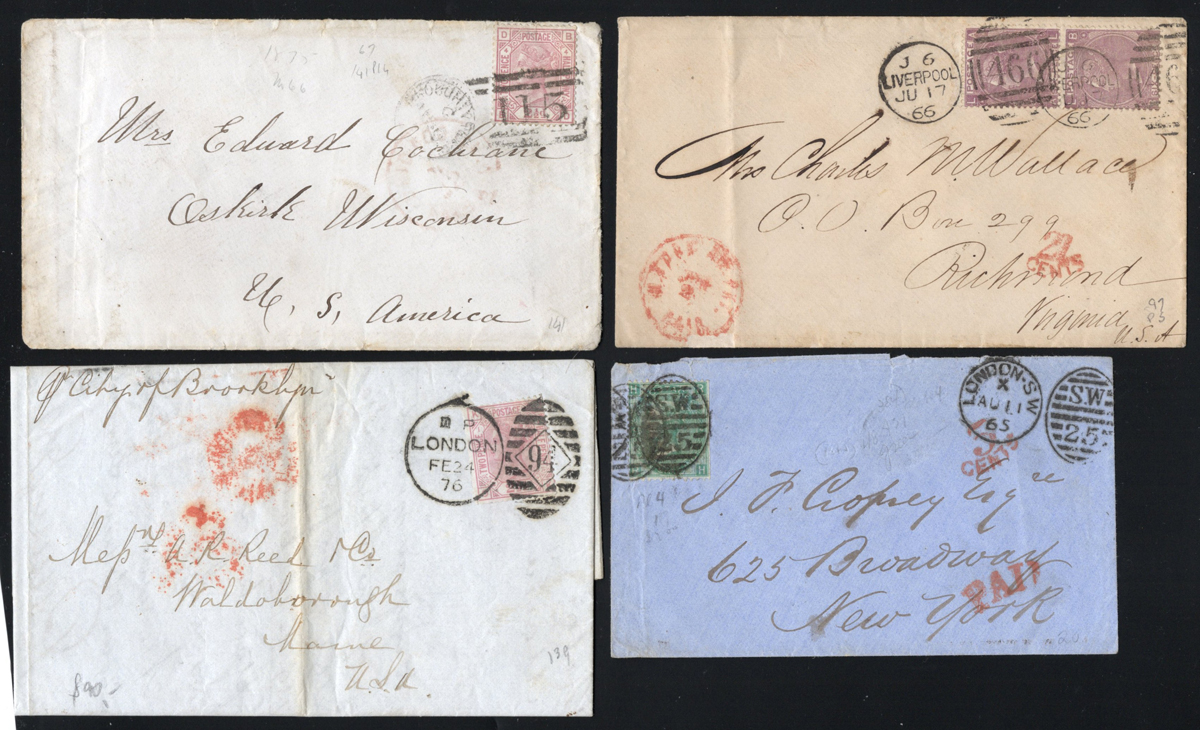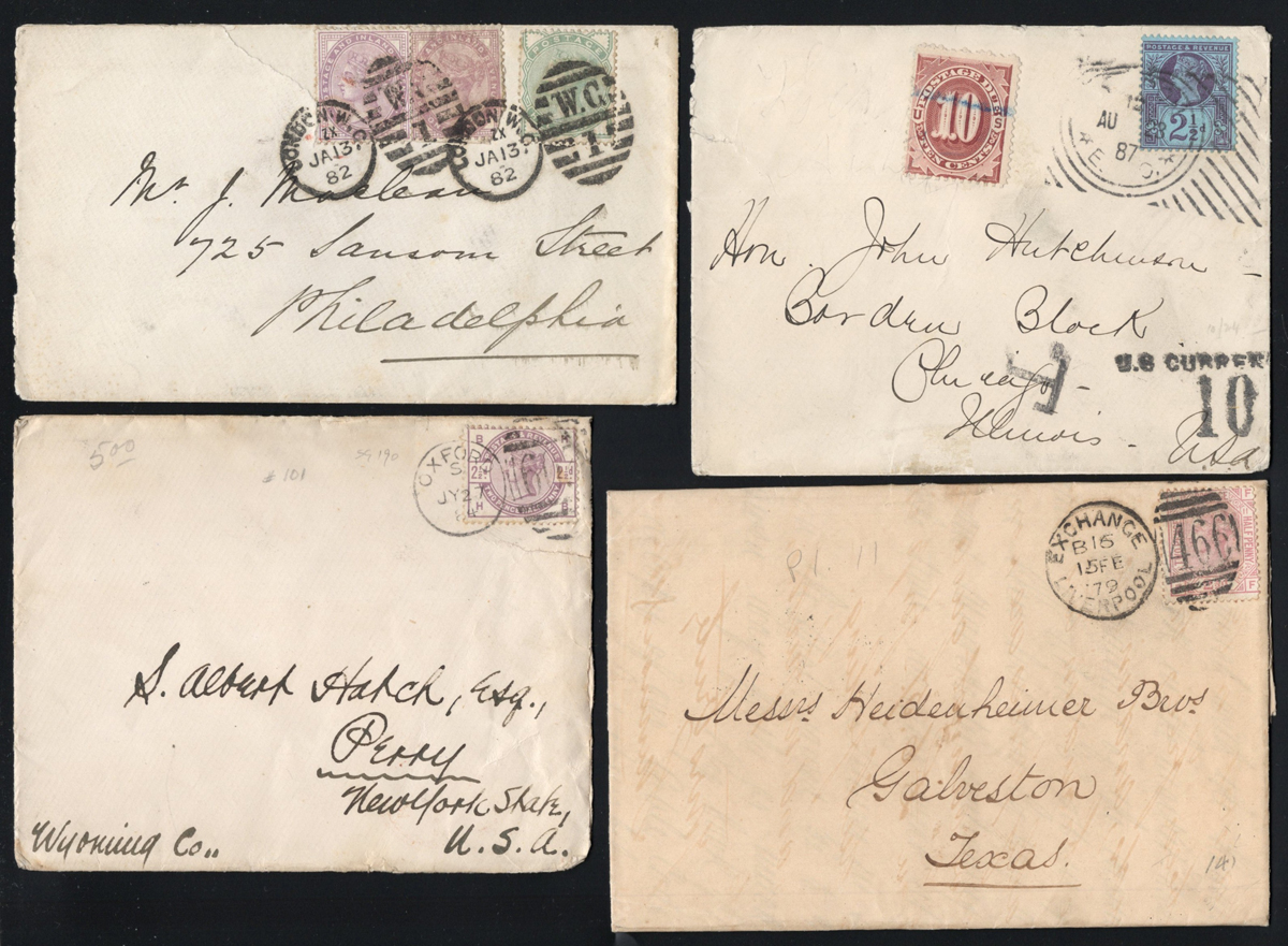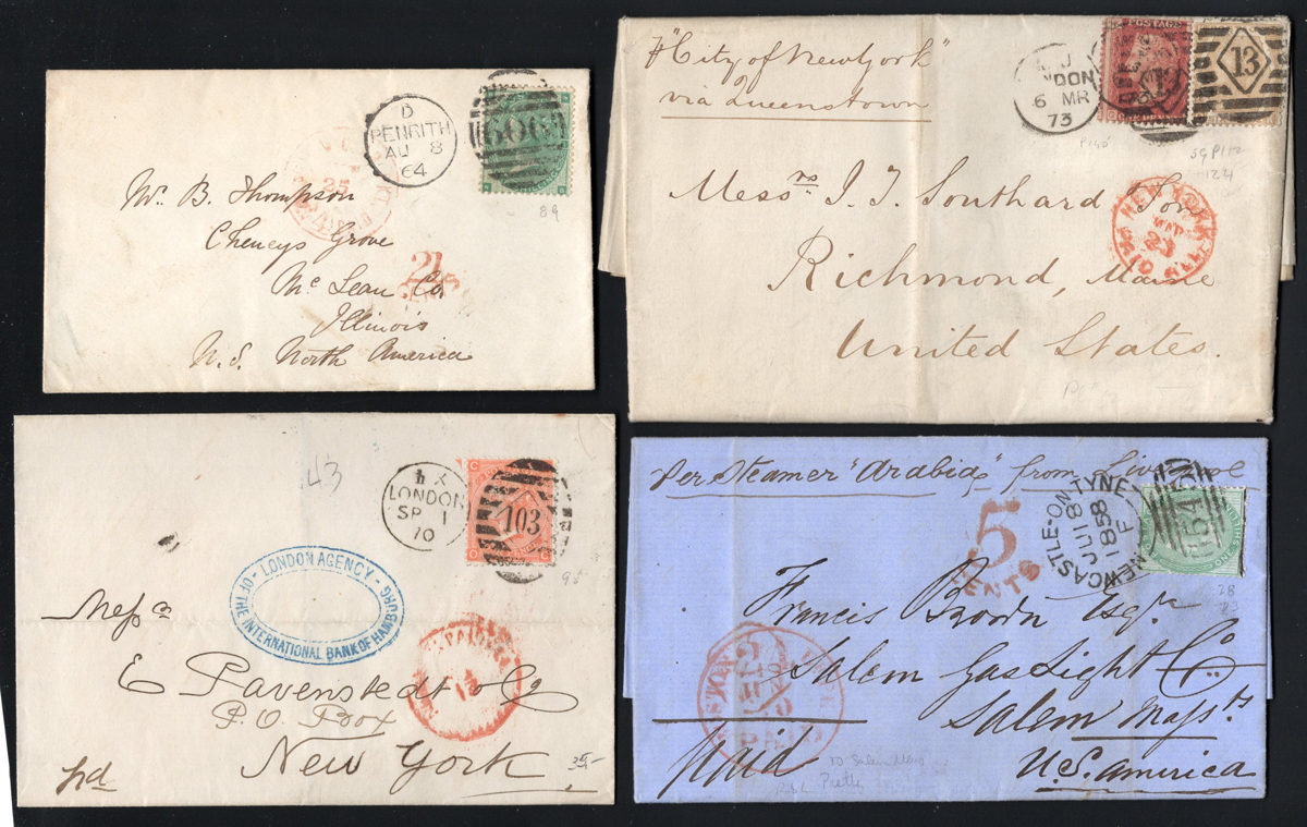 552 CVR   imageGroup of 19 Queen Victoria-Franked Covers Mailed from England to the United States, 1858 to 1894, noting a variety of postmarks, rates and frankings, including a lovely 1858 folded letter franked 1sh, an 1873 folded letter franked with Scott 59b (plate 12, U$725 on cover), an 1887 2½d franked cover with 10c Postage Due stamp on arrival, and other interesting items. Couple of opening faults, etc. still overall fine or better. (Scan 1) (Scan 2) (Scan 3) (Scan 4) (Scan 5) (All Scans) (All Images)