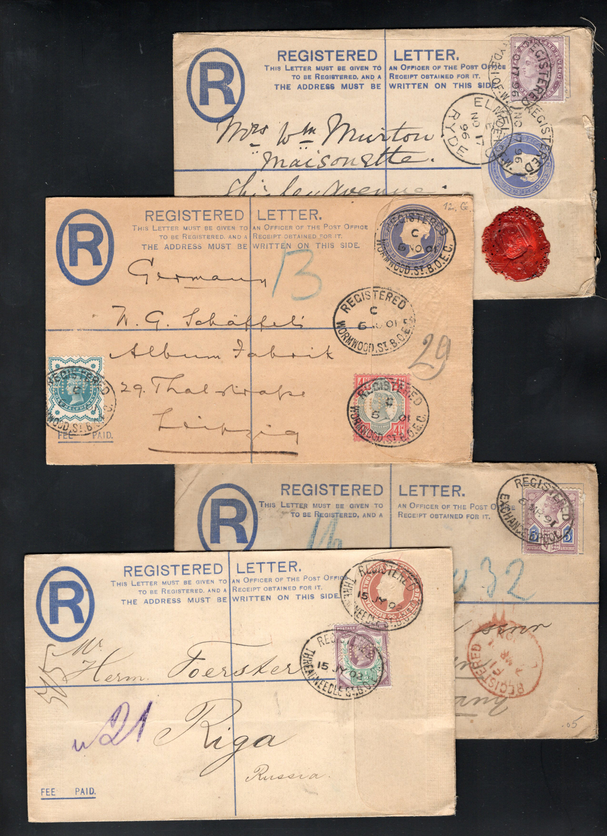 550 CVR   imageGroup of 16 Queen Victoria Registered Covers and Stationery, 10 of which are registered stationery envelopes with a variety of frankings and destinations (3 to Germany, one to Russia franked with perfined stamp, one to Norway and rest are domestic). Also 6 other covers with a variety of frankings and destinations such as United States, Germany and domestic. Of the frankings, we noted a Scott #7 (cut close), 22, 27, 94 (fine stamp on a faulty cover) and more. An interesting and useful group, overall fine or better. (Scan 1) (Scan 2) (Scan 3) (Scan 4) (All Scans) (All Images)