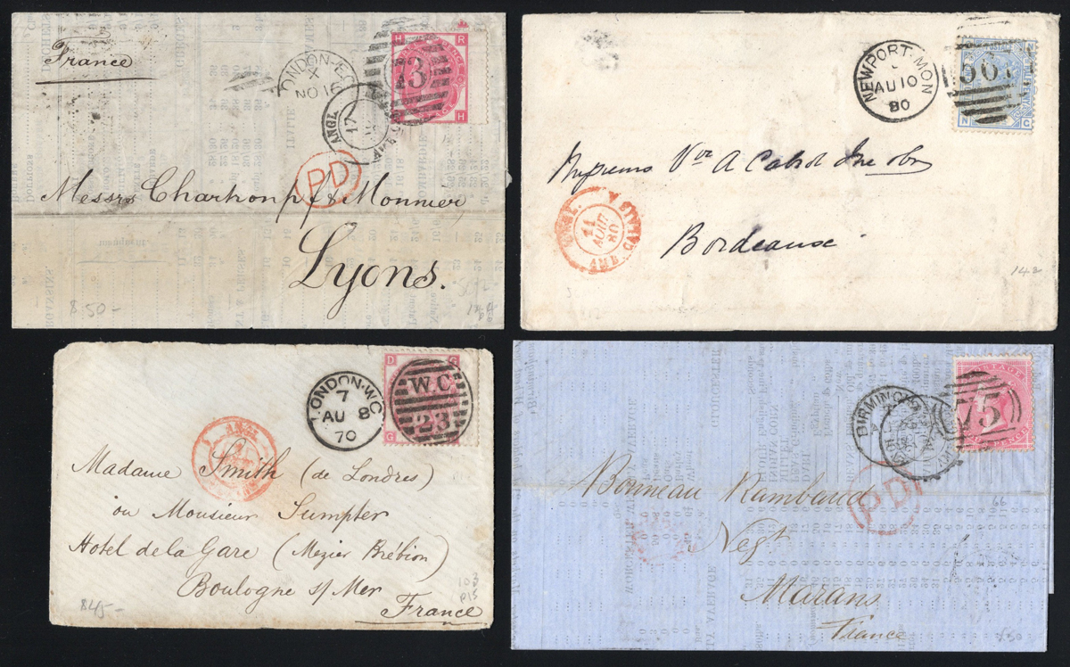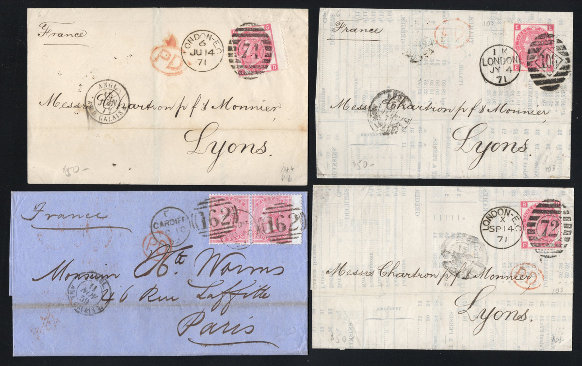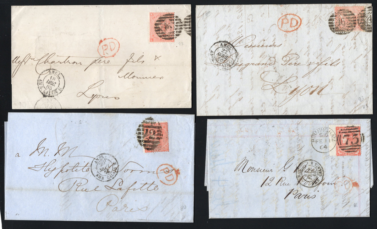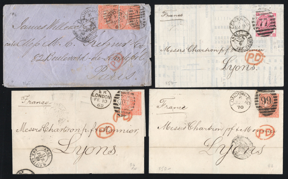553 CVR   imageGroup of 16 Queen Victoria-Franked Covers Mailed from England to France, 1858 to 1880, noting a variety of postmarks (incl. despatch, transit and receivers), rates and frankings, including 6 covers franked with Scott # 49 (one plate 5, rest plate 6), two covers franked with #26, (a single and a pair), a #68 (plate 18) on cover, two covers franked with #34 (U$345 each), 5 covers franked with #43 (plates 7, 9, 10, 11). An overall fine or better group. (Scan 1) (Scan 2) (Scan 3) (Scan 4) (All Scans) (All Images)