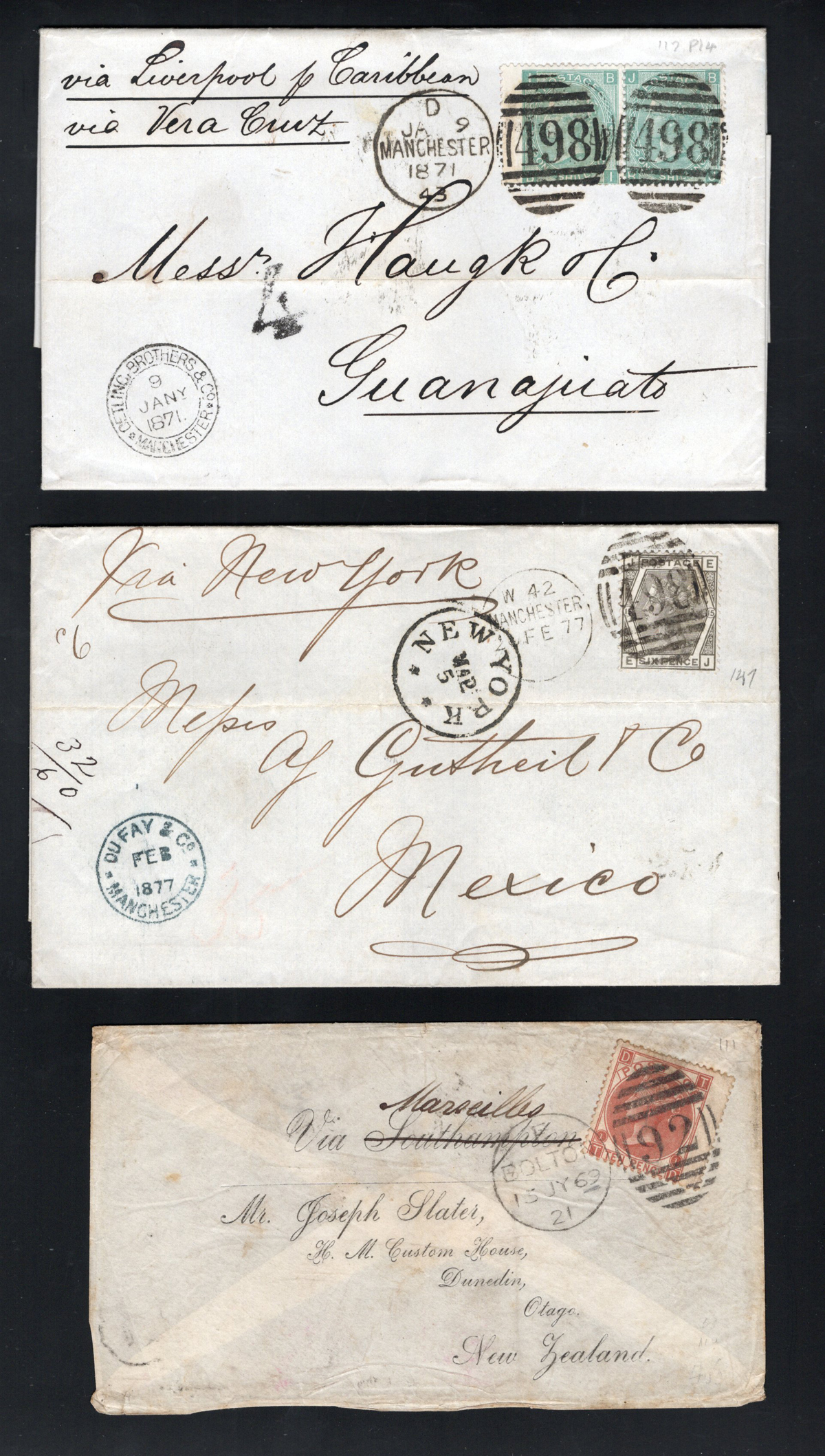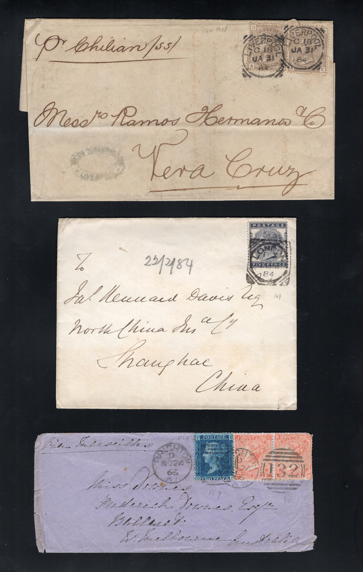 554 CVR   imageGroup of 6 Queen Victoria-Franked Covers Mailed from England to Foreign Destinations, 1866 to 1884, with 1884 5d cover to China (#85, U$375 on cover), 1869 10d cover to New Zealand (#53, U$975 on cover), 1866 10d cover to Australia, 1884 8d folded letter to Mexico (pair of #84, plate 18), 1877 6d (plate 15) folded cover to Mexico, 1871 2sh (pair of #48, plate 4) on folded letter to Mexico. A few faults here and there, still a fine or better group. (Scan 1) (Scan 2) (All Scans) (All Images)