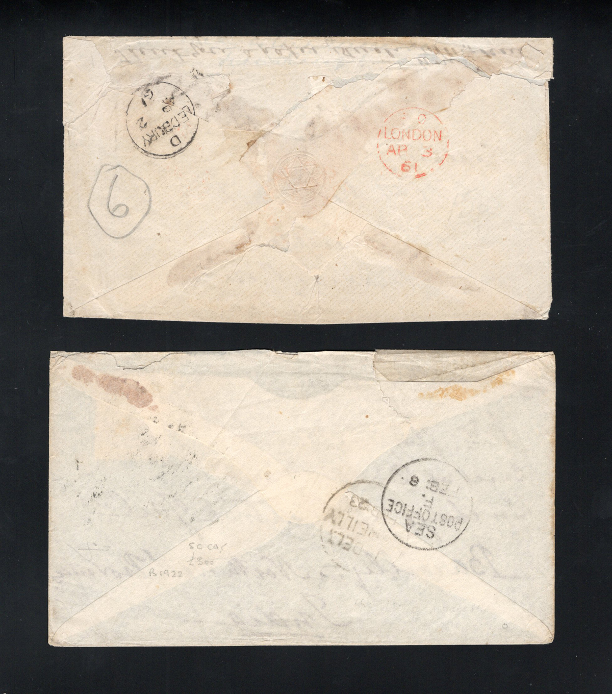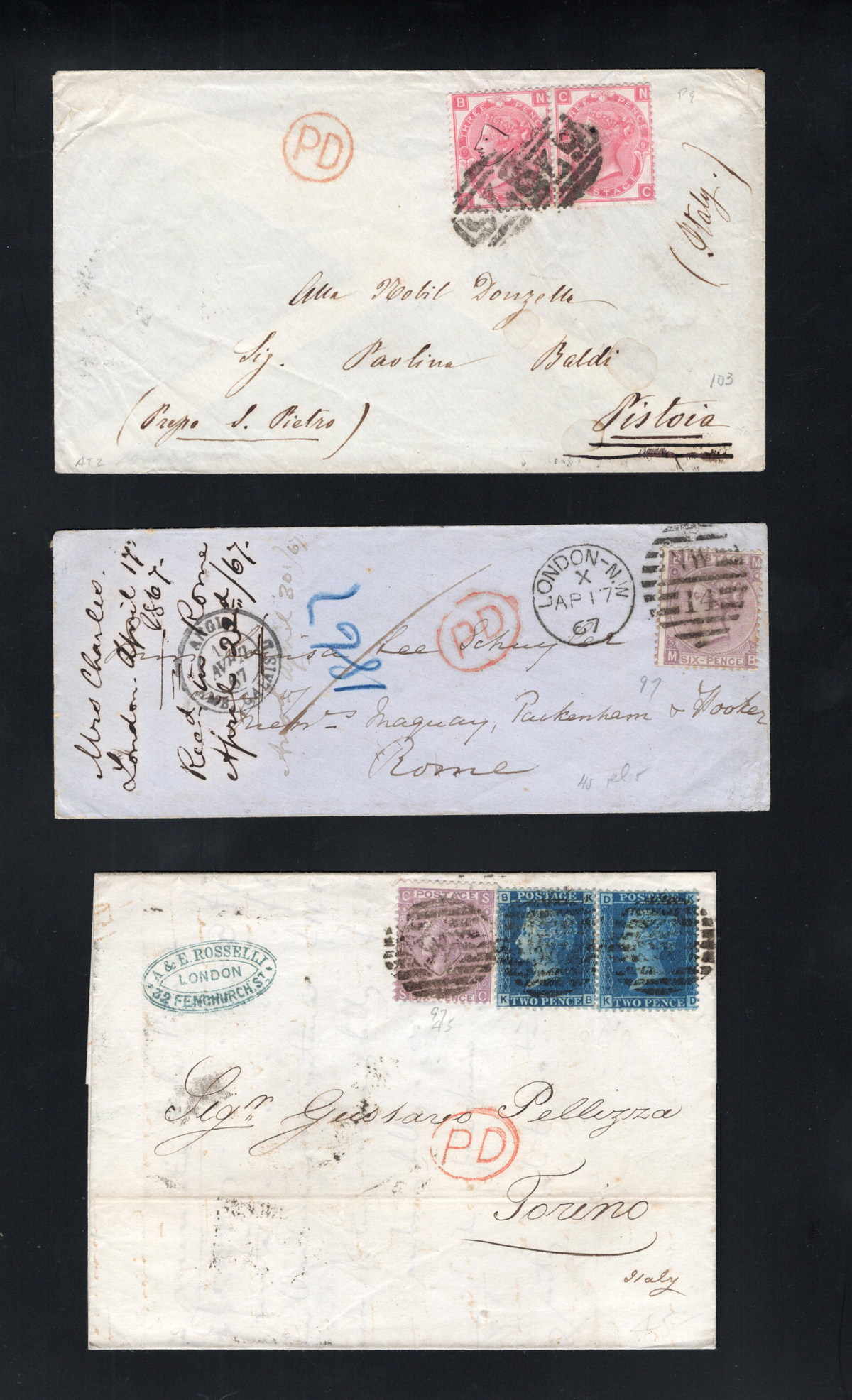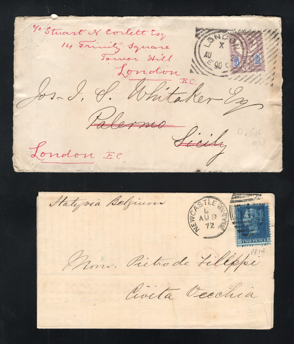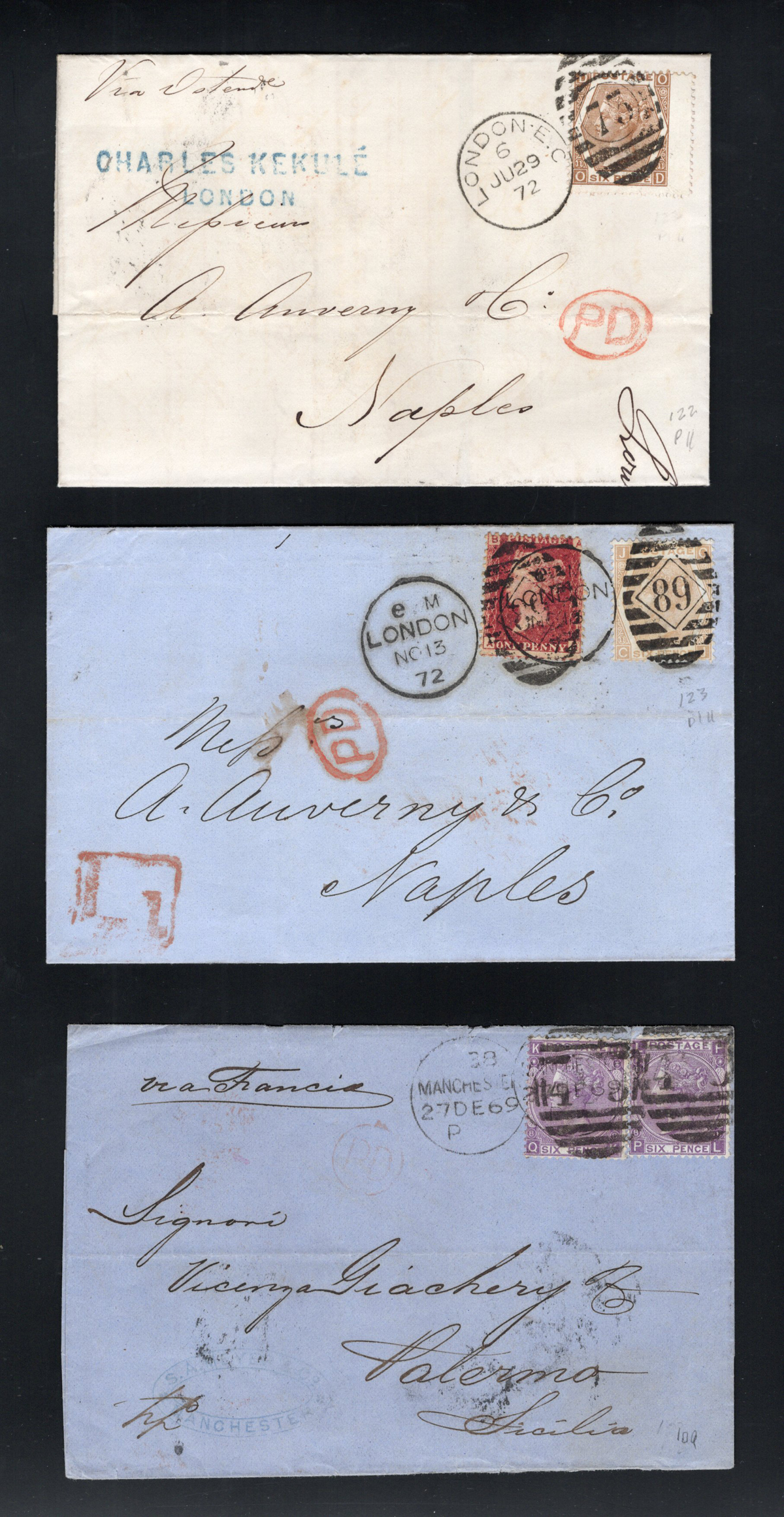 557 CVR   imageGroup of 8 Queen Victoria-Franked Covers Mailed to Italy, 1866 to 1890, 1869 12d (two 6d Scott #51a, plate 8) folded cover to Palermo, 1872 7d (1d plus 6d #59, plate 11) folded cover to Naples, 1872 6d (#59a, plate 11) folded letter to Naples, 1873 6d (pair of #49a, plate 9) cover to Pistoria, 1867 6d (#45, plate 5) cover to Rome, 1866 10d (two 2d plus a 6d #45, plate 5) folded cover to Turin, 1872 2d folded printed letter to Civitavecchia, 1890 5d (#118) cover to Sicily, re-directed. A few have faults, still an overall fine or better group. (Scan 1) (Scan 2) (Scan 3) (Scan 4) (All Scans) (All Images)