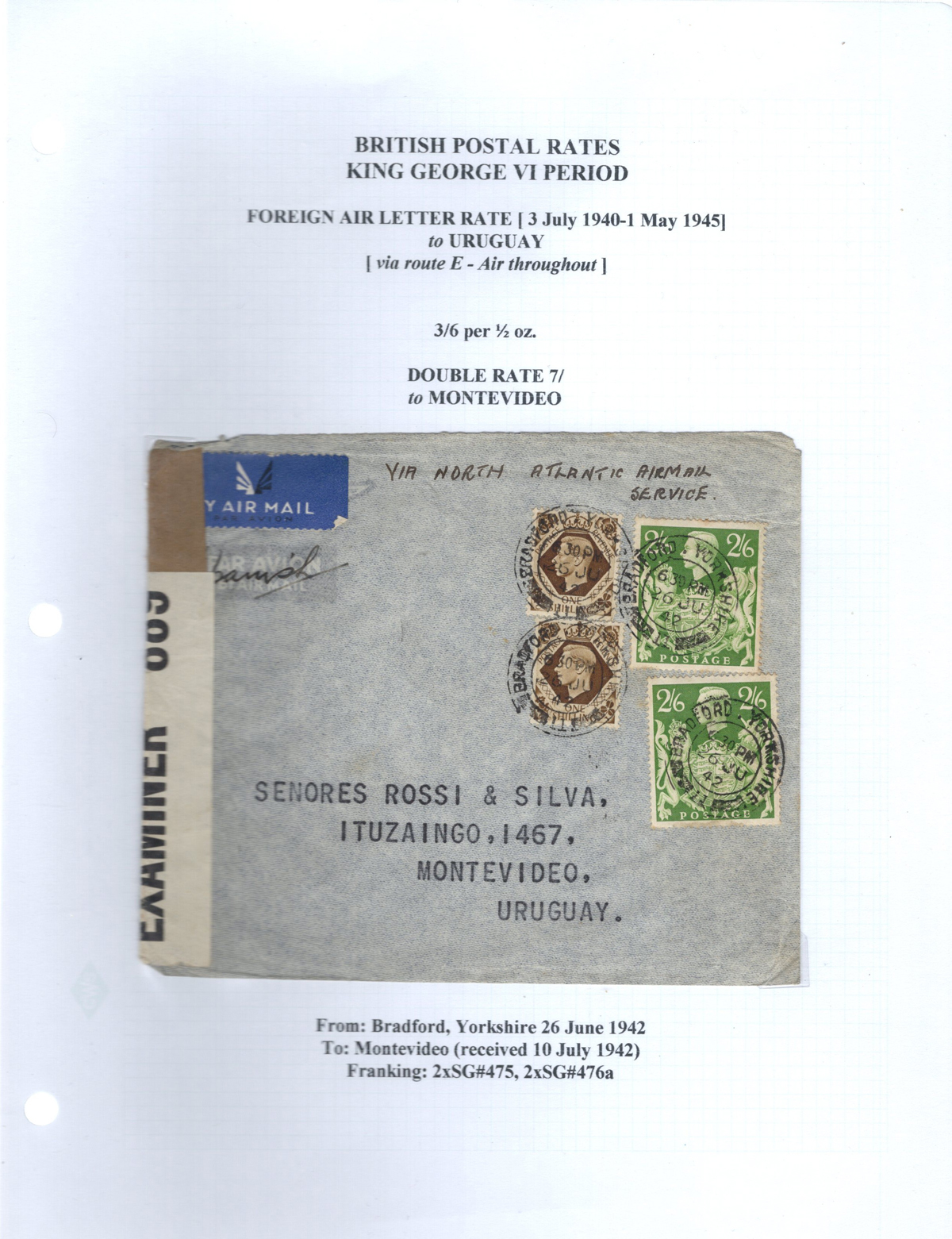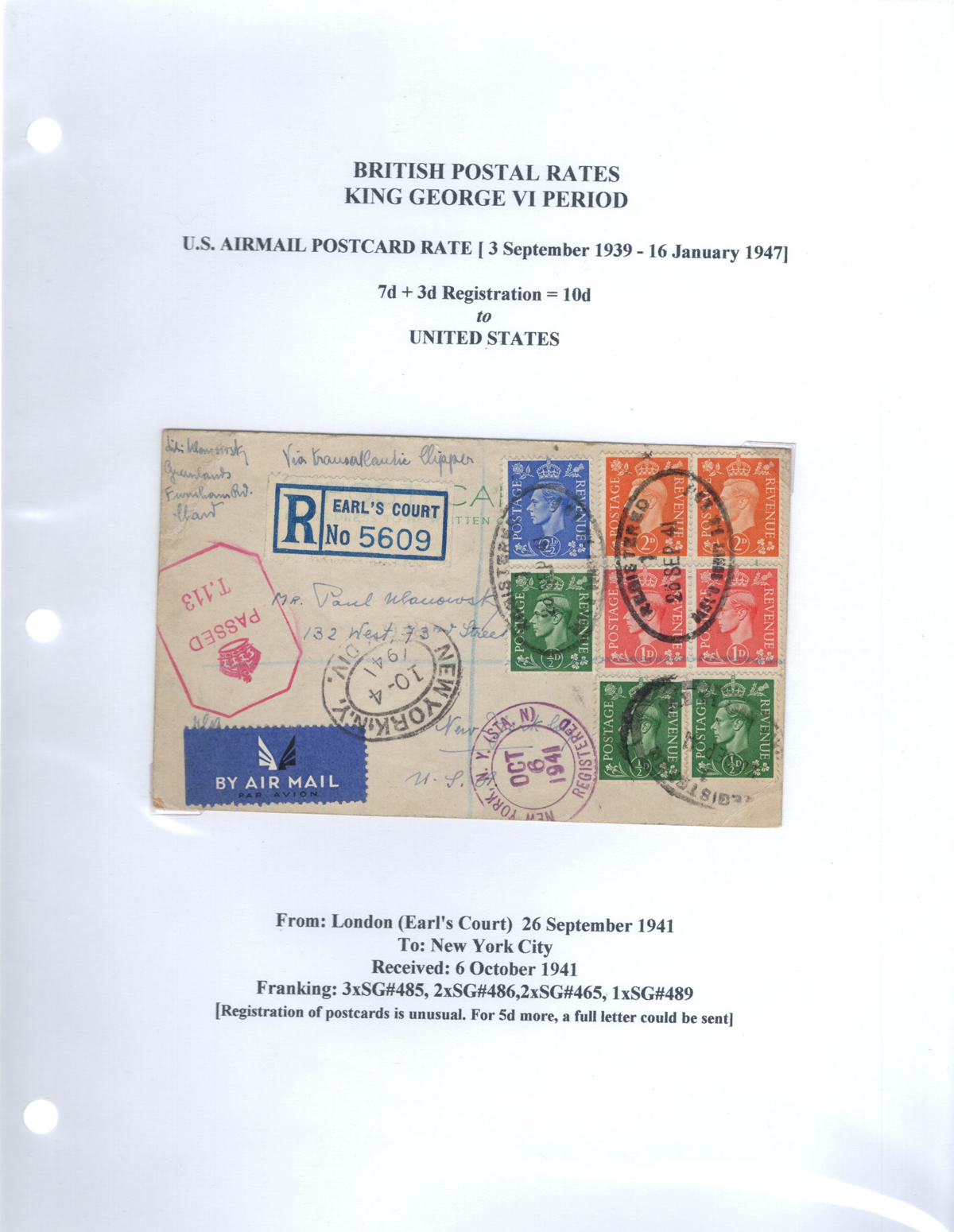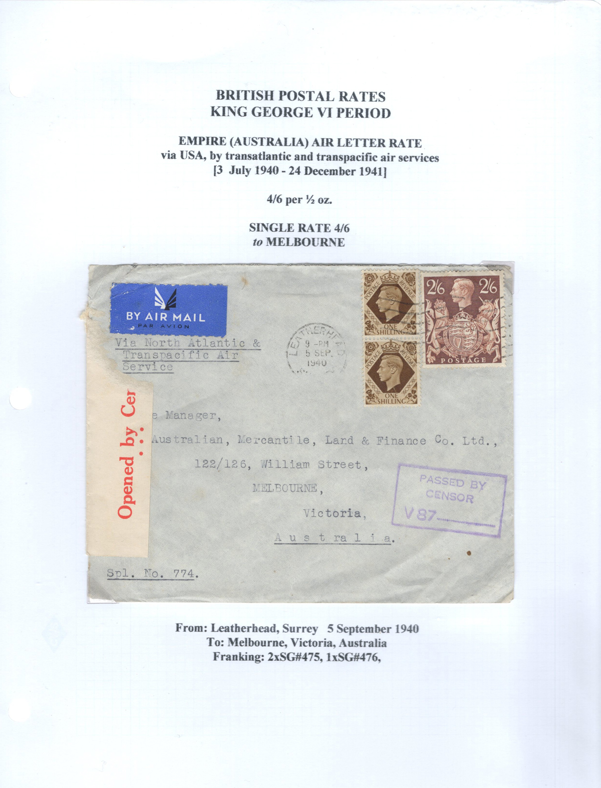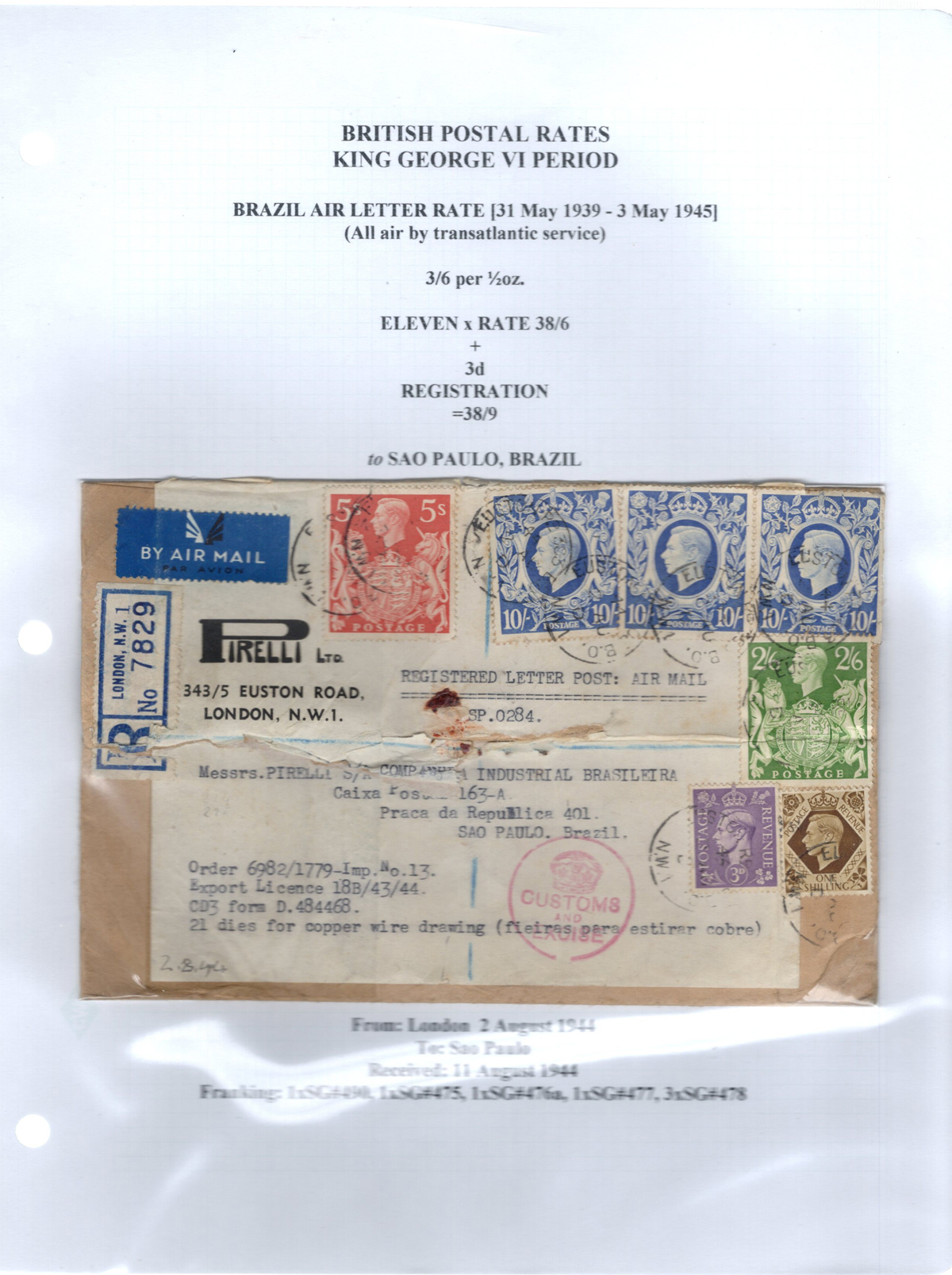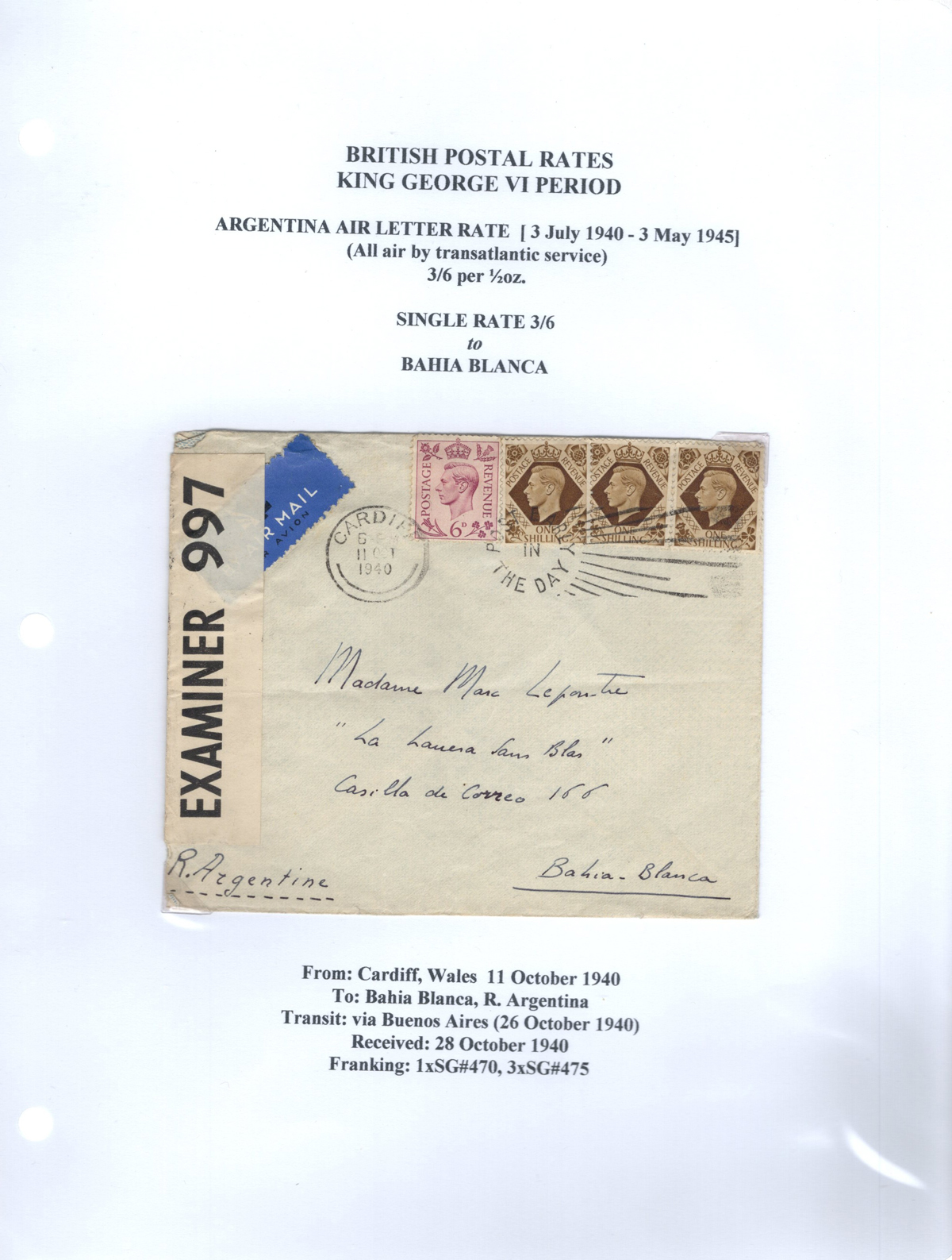 559 CVR/PC   imageAdvanced Collection of 86 G.B. Covers and Cards Showing Airmail Rates to Foreign Destinations, Plus Some Empire Airmail Scheme Covers, 1937-1947, all neatly displayed and written-up on album pages in three binders, includes mail to USA, Canada, Mauritius, South Africa, Ceylon, Palestine, Malaya, Australia, New Zealand, India, Japan, Iraq, Argentina, Bolivia, Brazil, China, Costa Rica, Ecuador, Egypt, Iran, Jamaica, Saudi Arabia, Southern Rhodesia, Uruguay and more. Note censored mail, registered covers and a great selection of rates including an 11 times 38/9 registered airmail rate to Brazil. We saw a number of oversize covers, most with normal edge faults, still a very nice collection and overall very fine. (Scan 1) (Scan 2) (Scan 3) (Scan 4) (Scan 5) (Scan 6) (Scan 7) (Scan 8) (Scan 9) (Scan 10) (Scan 11) (Scan 12) (Scan 13) (Scan 14) (Scan 15) (Scan 16) (Scan 17) (Scan 18) (Scan 19) (Scan 20) (All Scans) (All Images)