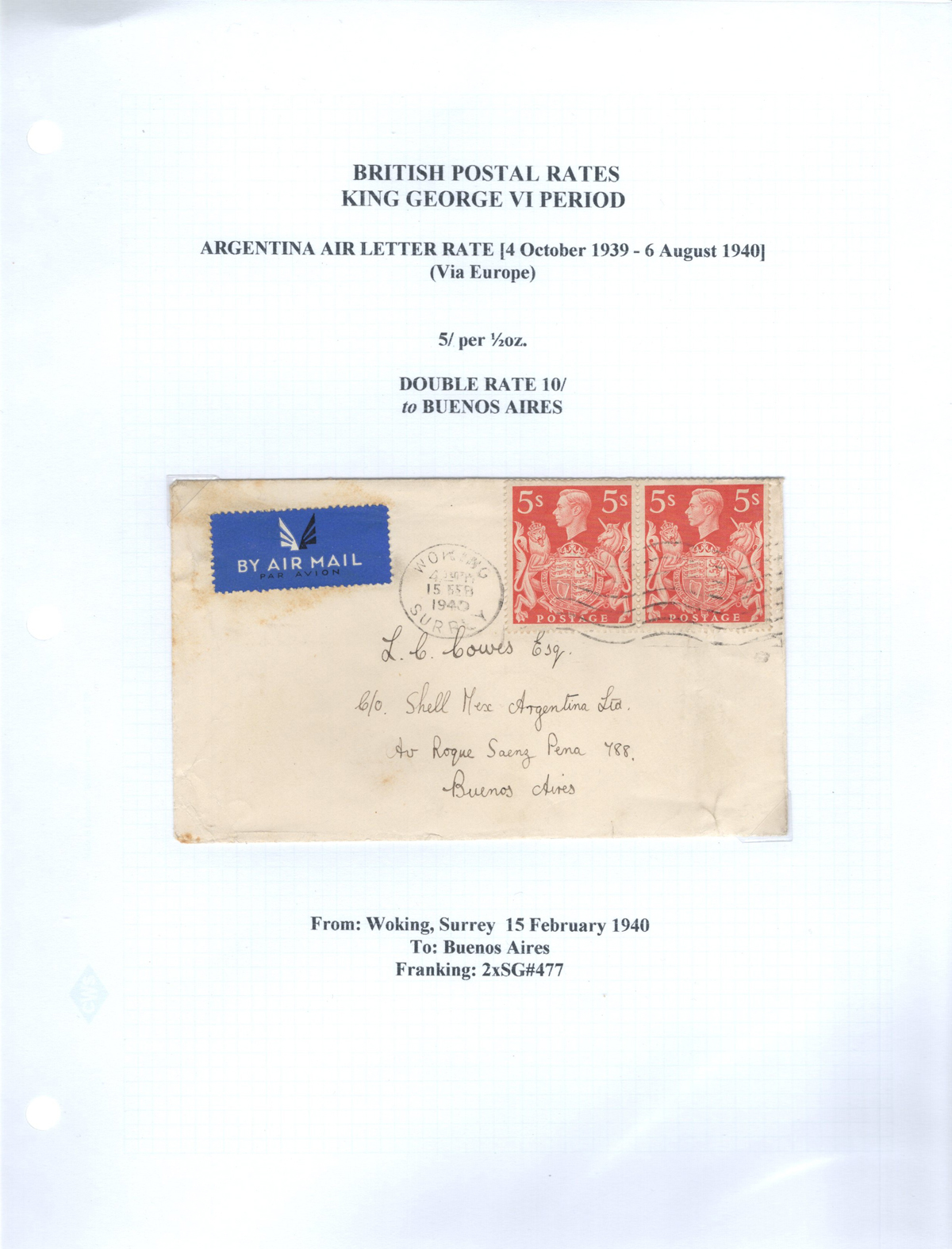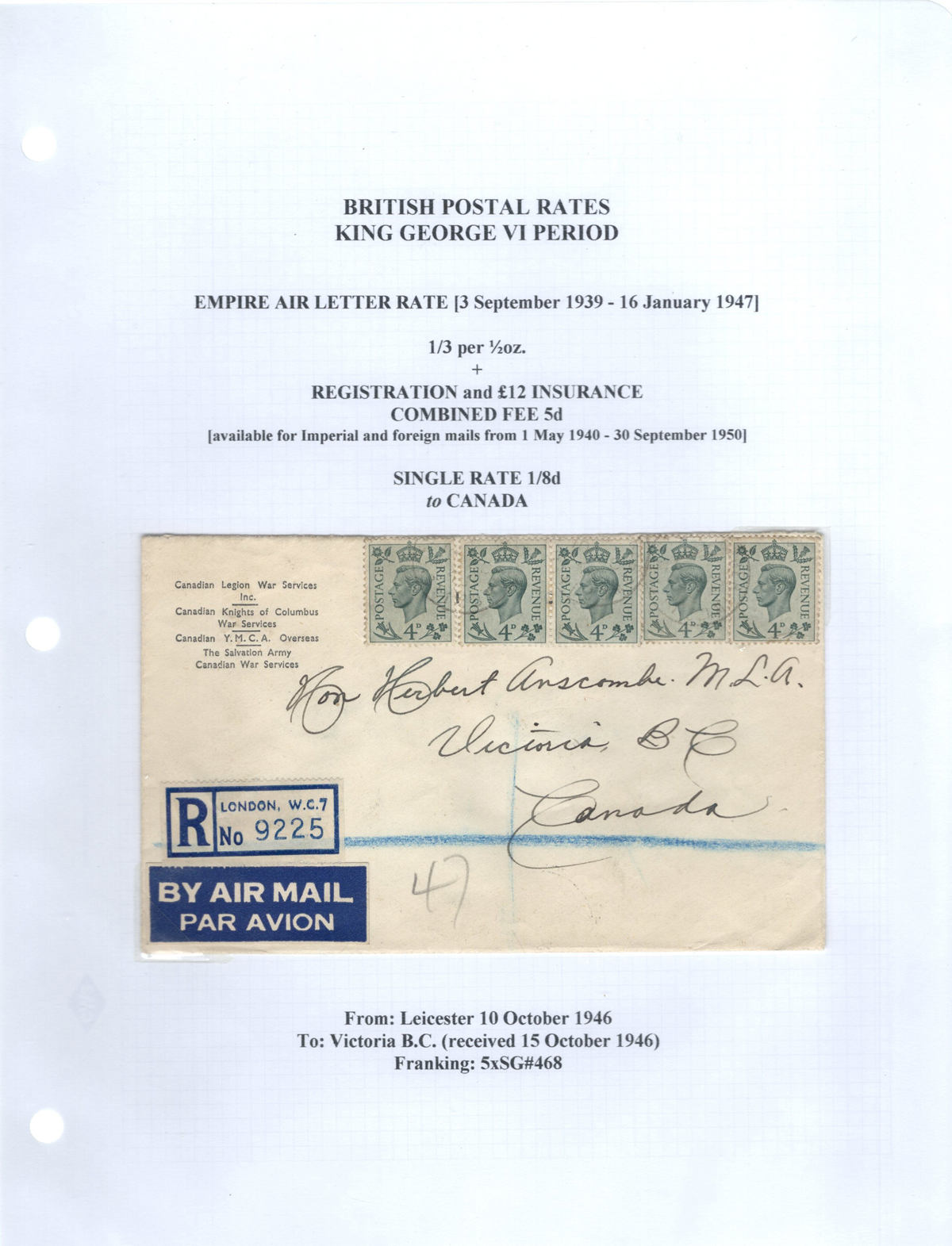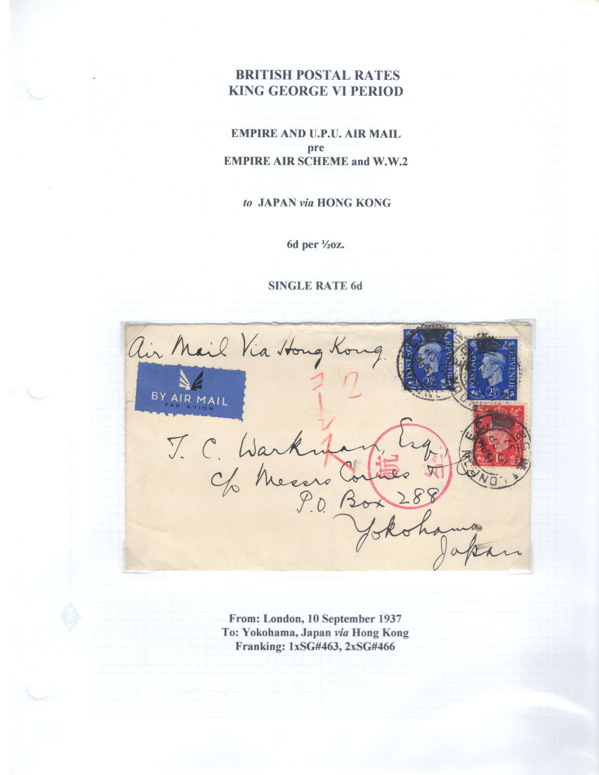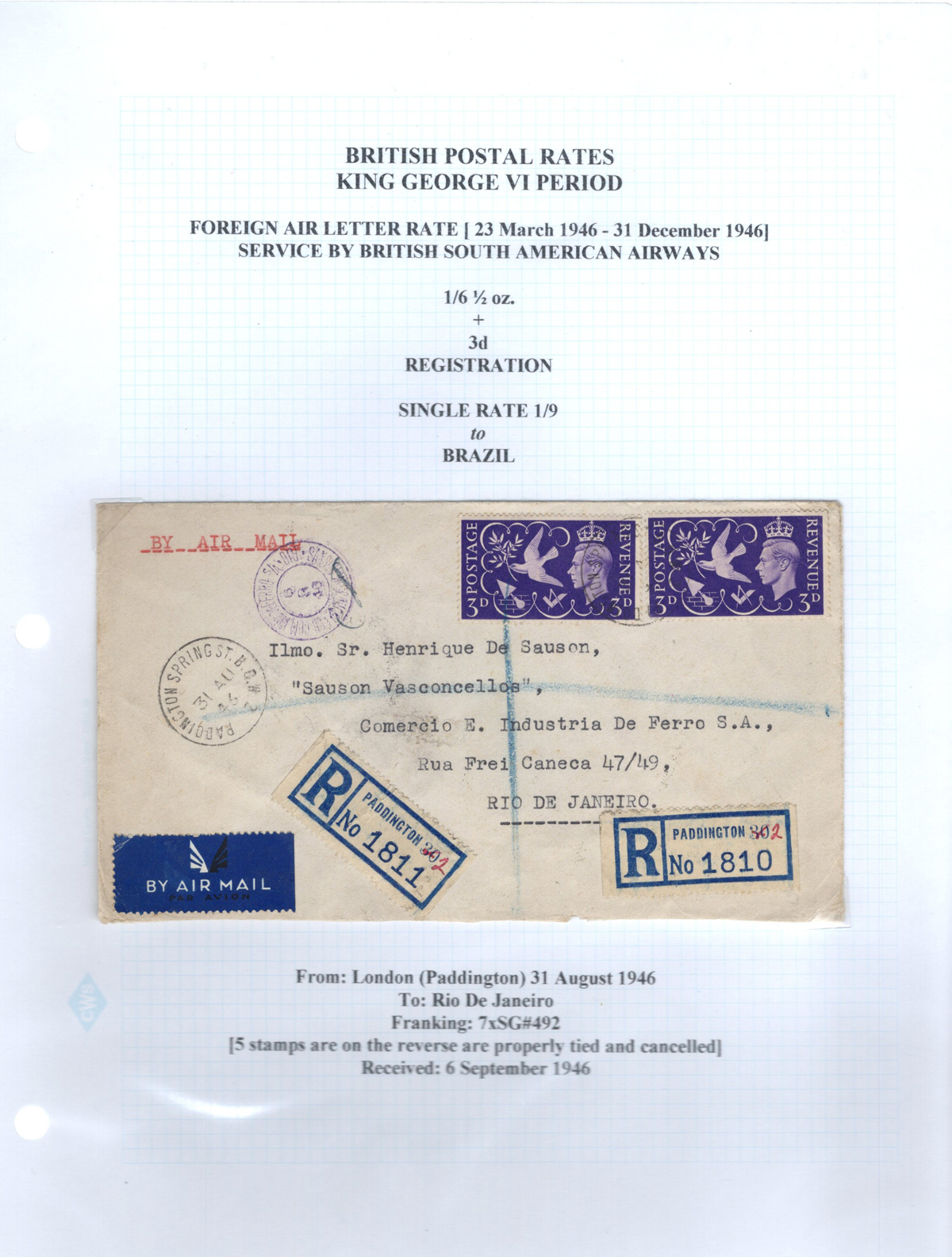 559 CVR/PC   imageAdvanced Collection of 86 G.B. Covers and Cards Showing Airmail Rates to Foreign Destinations, Plus Some Empire Airmail Scheme Covers, 1937-1947, all neatly displayed and written-up on album pages in three binders, includes mail to USA, Canada, Mauritius, South Africa, Ceylon, Palestine, Malaya, Australia, New Zealand, India, Japan, Iraq, Argentina, Bolivia, Brazil, China, Costa Rica, Ecuador, Egypt, Iran, Jamaica, Saudi Arabia, Southern Rhodesia, Uruguay and more. Note censored mail, registered covers and a great selection of rates including an 11 times 38/9 registered airmail rate to Brazil. We saw a number of oversize covers, most with normal edge faults, still a very nice collection and overall very fine. (Scan 1) (Scan 2) (Scan 3) (Scan 4) (Scan 5) (Scan 6) (Scan 7) (Scan 8) (Scan 9) (Scan 10) (Scan 11) (Scan 12) (Scan 13) (Scan 14) (Scan 15) (Scan 16) (Scan 17) (Scan 18) (Scan 19) (Scan 20) (All Scans) (All Images)