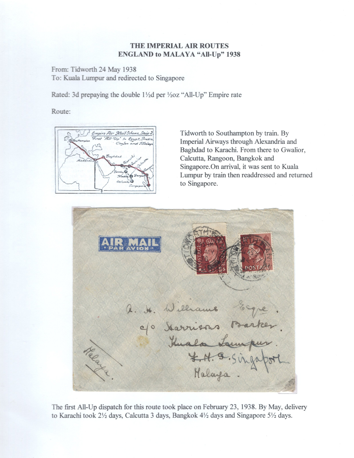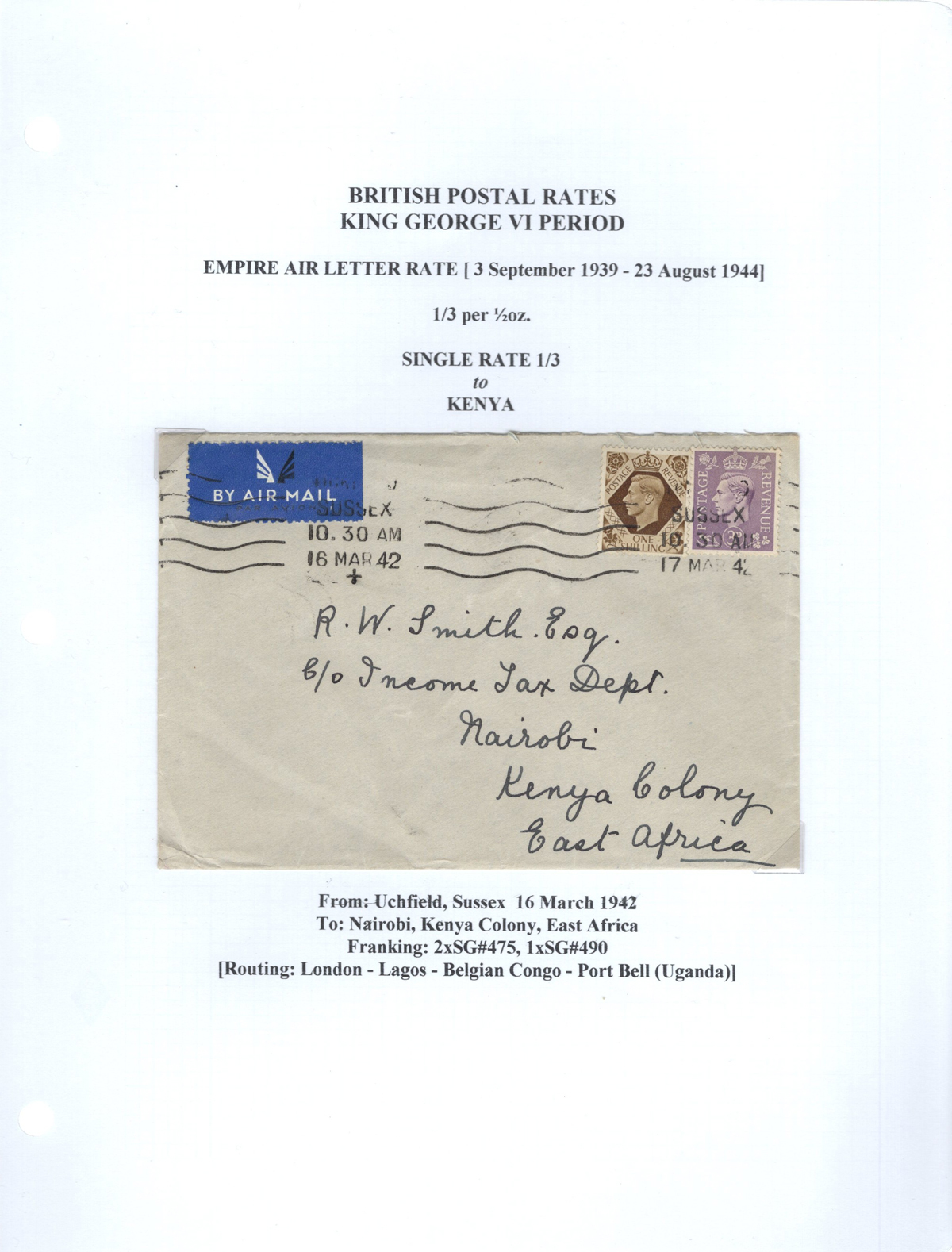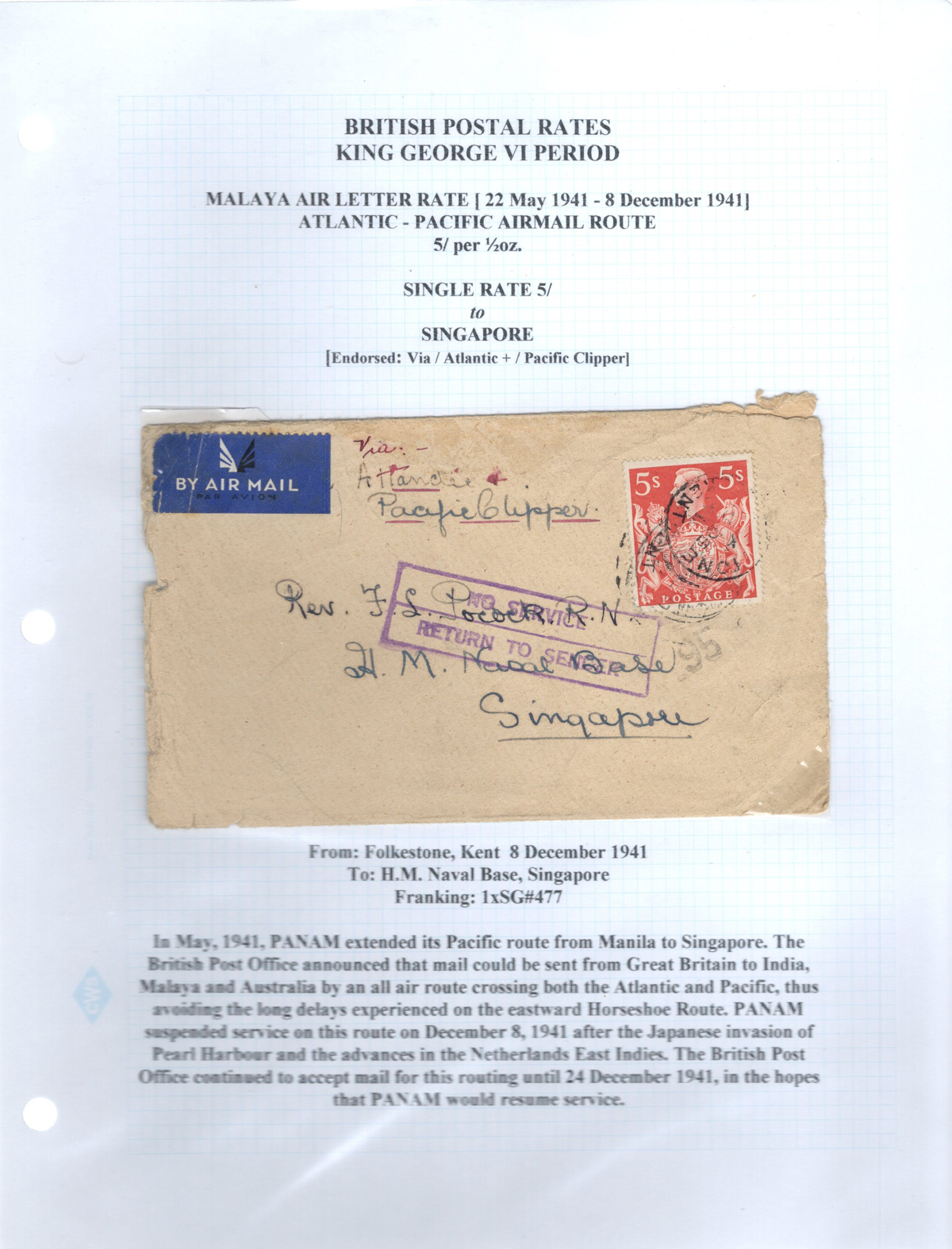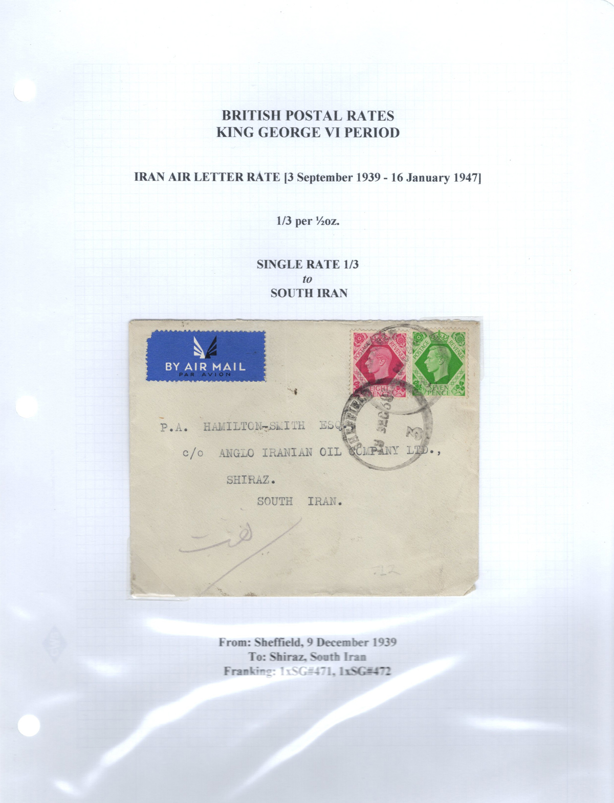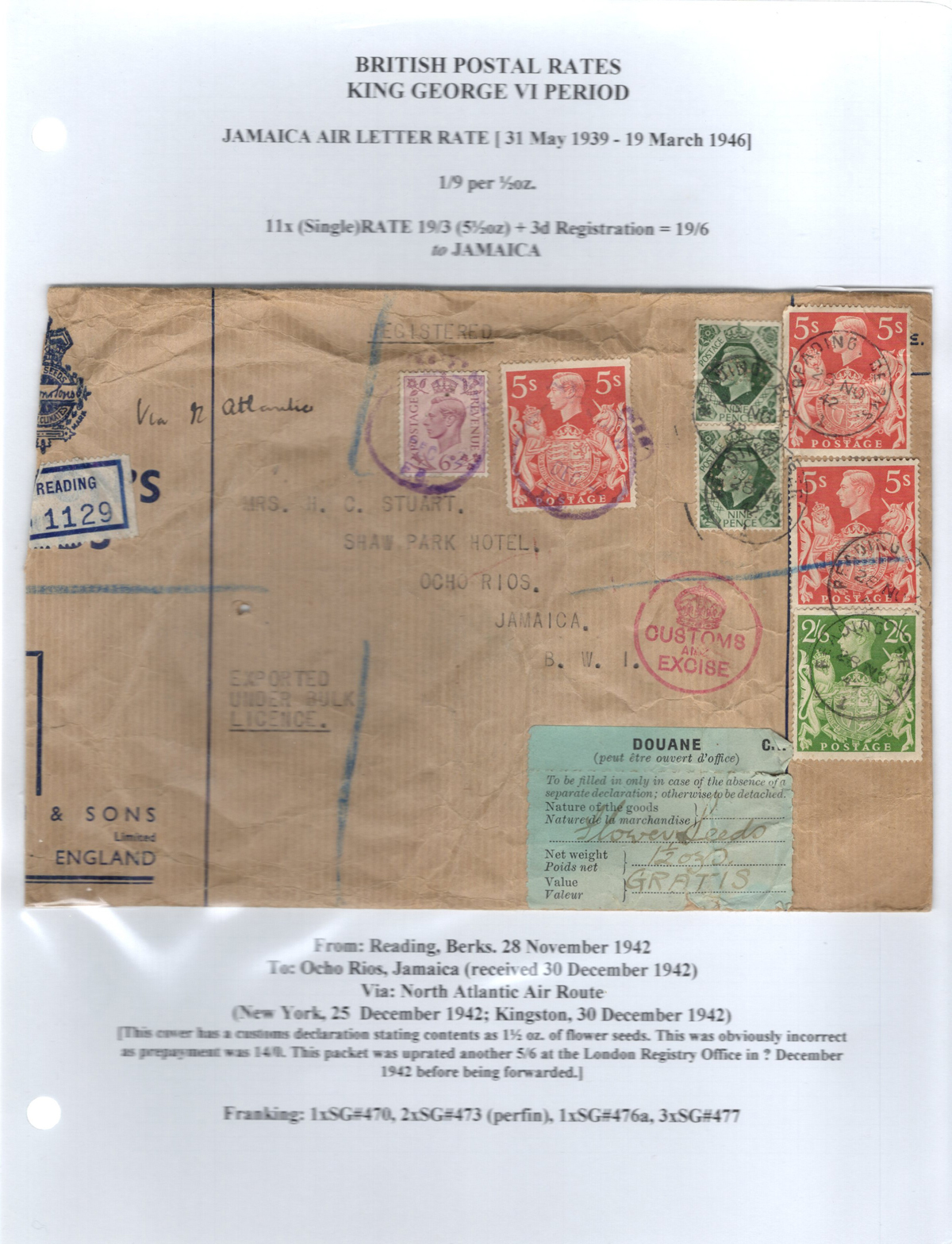 559 CVR/PC   imageAdvanced Collection of 86 G.B. Covers and Cards Showing Airmail Rates to Foreign Destinations, Plus Some Empire Airmail Scheme Covers, 1937-1947, all neatly displayed and written-up on album pages in three binders, includes mail to USA, Canada, Mauritius, South Africa, Ceylon, Palestine, Malaya, Australia, New Zealand, India, Japan, Iraq, Argentina, Bolivia, Brazil, China, Costa Rica, Ecuador, Egypt, Iran, Jamaica, Saudi Arabia, Southern Rhodesia, Uruguay and more. Note censored mail, registered covers and a great selection of rates including an 11 times 38/9 registered airmail rate to Brazil. We saw a number of oversize covers, most with normal edge faults, still a very nice collection and overall very fine. (Scan 1) (Scan 2) (Scan 3) (Scan 4) (Scan 5) (Scan 6) (Scan 7) (Scan 8) (Scan 9) (Scan 10) (Scan 11) (Scan 12) (Scan 13) (Scan 14) (Scan 15) (Scan 16) (Scan 17) (Scan 18) (Scan 19) (Scan 20) (All Scans) (All Images)