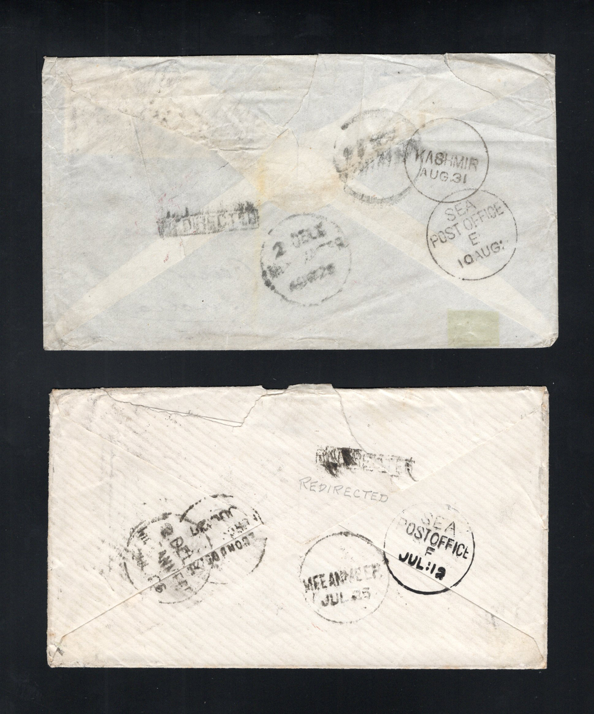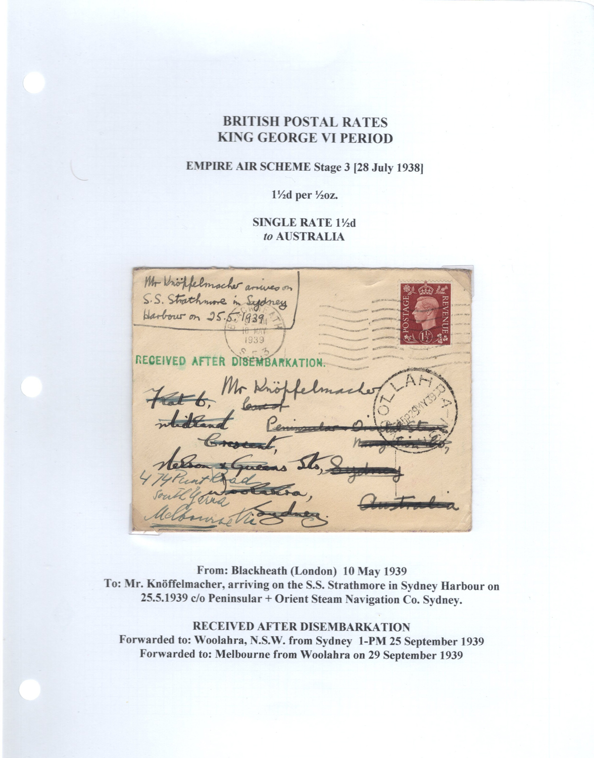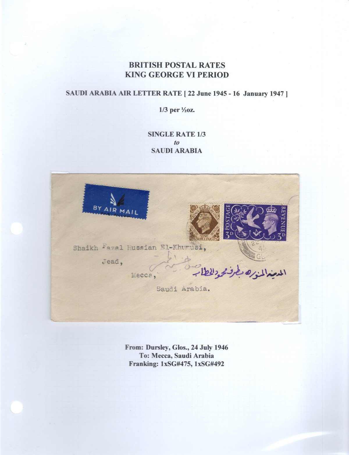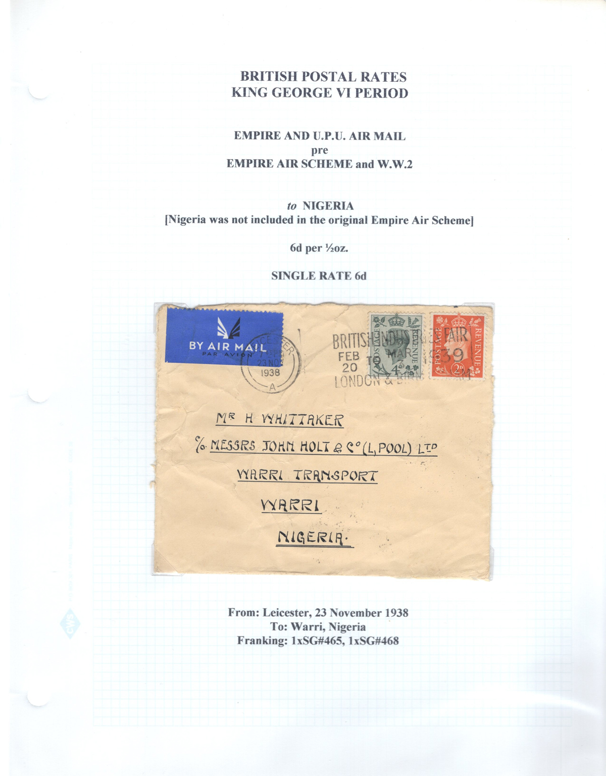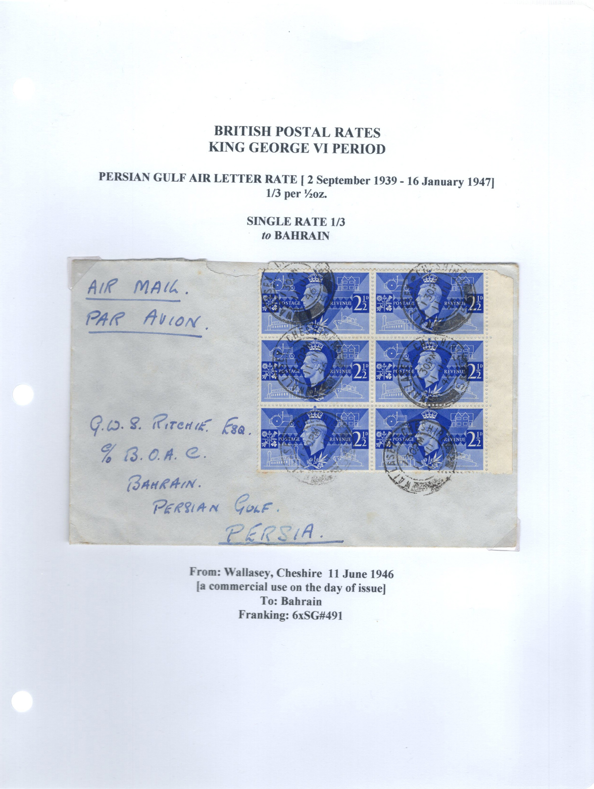 559 CVR/PC   imageAdvanced Collection of 86 G.B. Covers and Cards Showing Airmail Rates to Foreign Destinations, Plus Some Empire Airmail Scheme Covers, 1937-1947, all neatly displayed and written-up on album pages in three binders, includes mail to USA, Canada, Mauritius, South Africa, Ceylon, Palestine, Malaya, Australia, New Zealand, India, Japan, Iraq, Argentina, Bolivia, Brazil, China, Costa Rica, Ecuador, Egypt, Iran, Jamaica, Saudi Arabia, Southern Rhodesia, Uruguay and more. Note censored mail, registered covers and a great selection of rates including an 11 times 38/9 registered airmail rate to Brazil. We saw a number of oversize covers, most with normal edge faults, still a very nice collection and overall very fine. (Scan 1) (Scan 2) (Scan 3) (Scan 4) (Scan 5) (Scan 6) (Scan 7) (Scan 8) (Scan 9) (Scan 10) (Scan 11) (Scan 12) (Scan 13) (Scan 14) (Scan 15) (Scan 16) (Scan 17) (Scan 18) (Scan 19) (Scan 20) (All Scans) (All Images)
