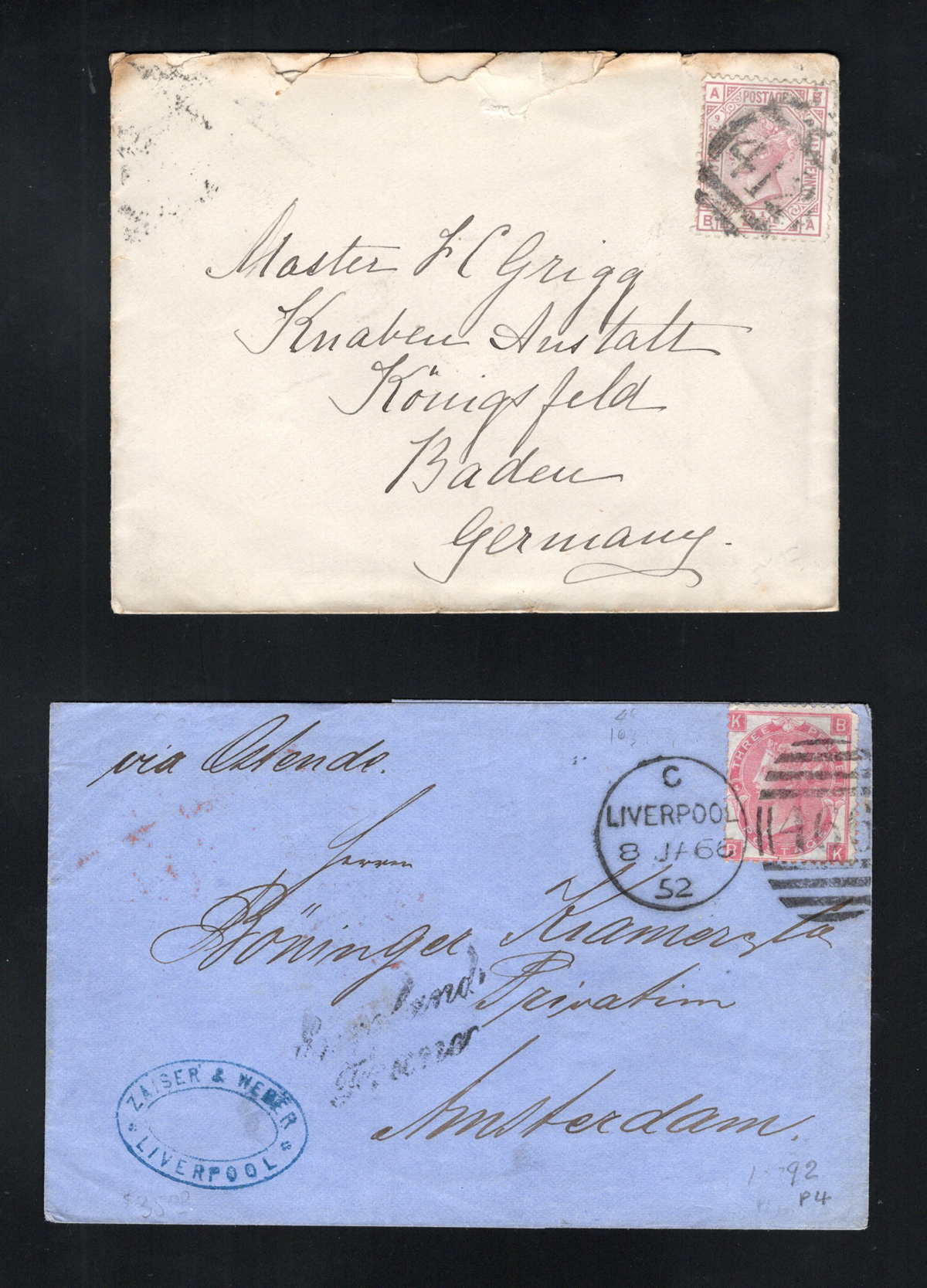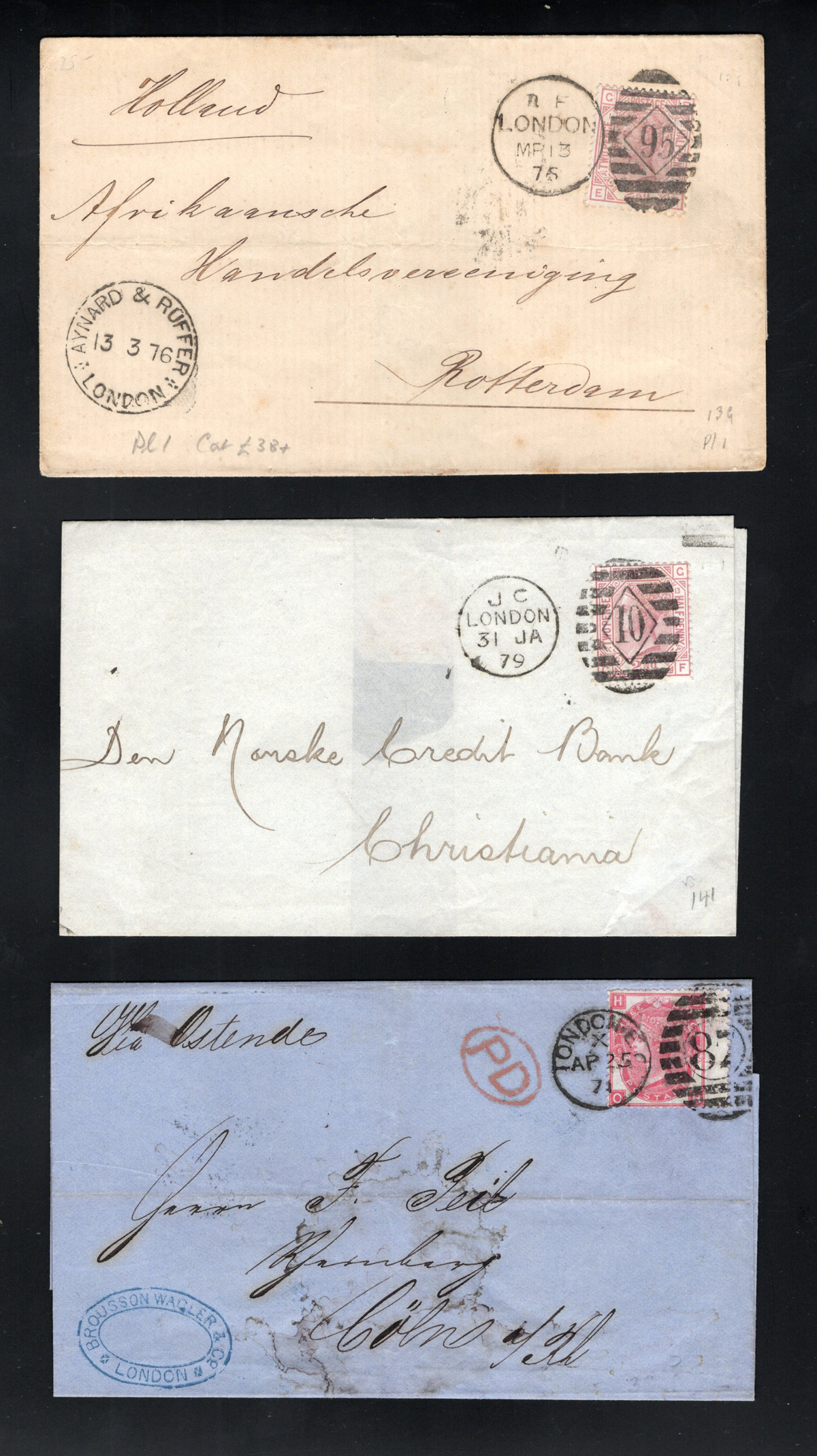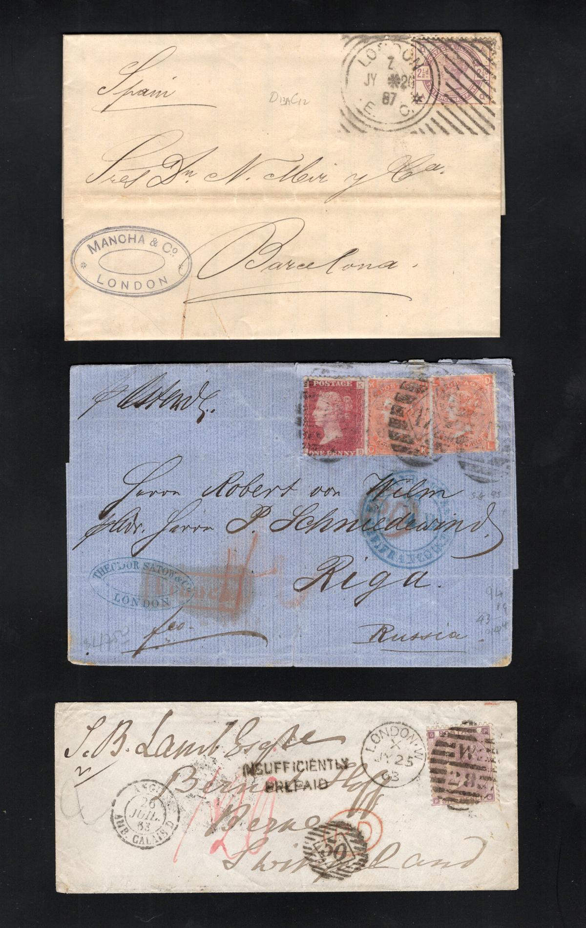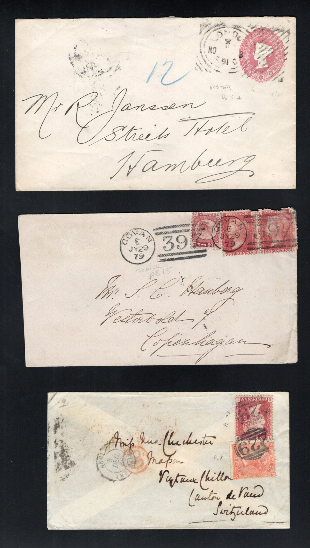 556 CVR   imageGroup of 11 Queen Victoria-Franked Covers Mailed to European Destinations, 1863 to 1891, 1876 2½d folded cover to Holland, 1866 3d (Scott #44, plate 4) cover to Holland, 1879 2½d (#67) folded cover to Denmark, 1879 2½d (2x 1d and ½d plate 15) cover to Denmark, 1887 2½d (#101) folded letter to Spain, 1871 3d (#49a, plate 6) folded cover to Germany, 1878 2½d (#67, plate 9) on cover to Germany, 1891 2½d embossed stationery cover to Germany, 1868 9d (2x 4d #43 and 1d) folded cover to Russia, 1863 6d (#39) cover to Switzerland (insufficiently prepaid, via Calais) and 1866 5d (1d and 4d) cover to Switzerland. A few with faults, else overall fine or better. (Scan 1) (Scan 2) (Scan 3) (Scan 4) (All Scans) (All Images)
