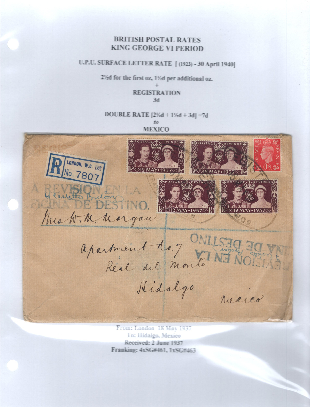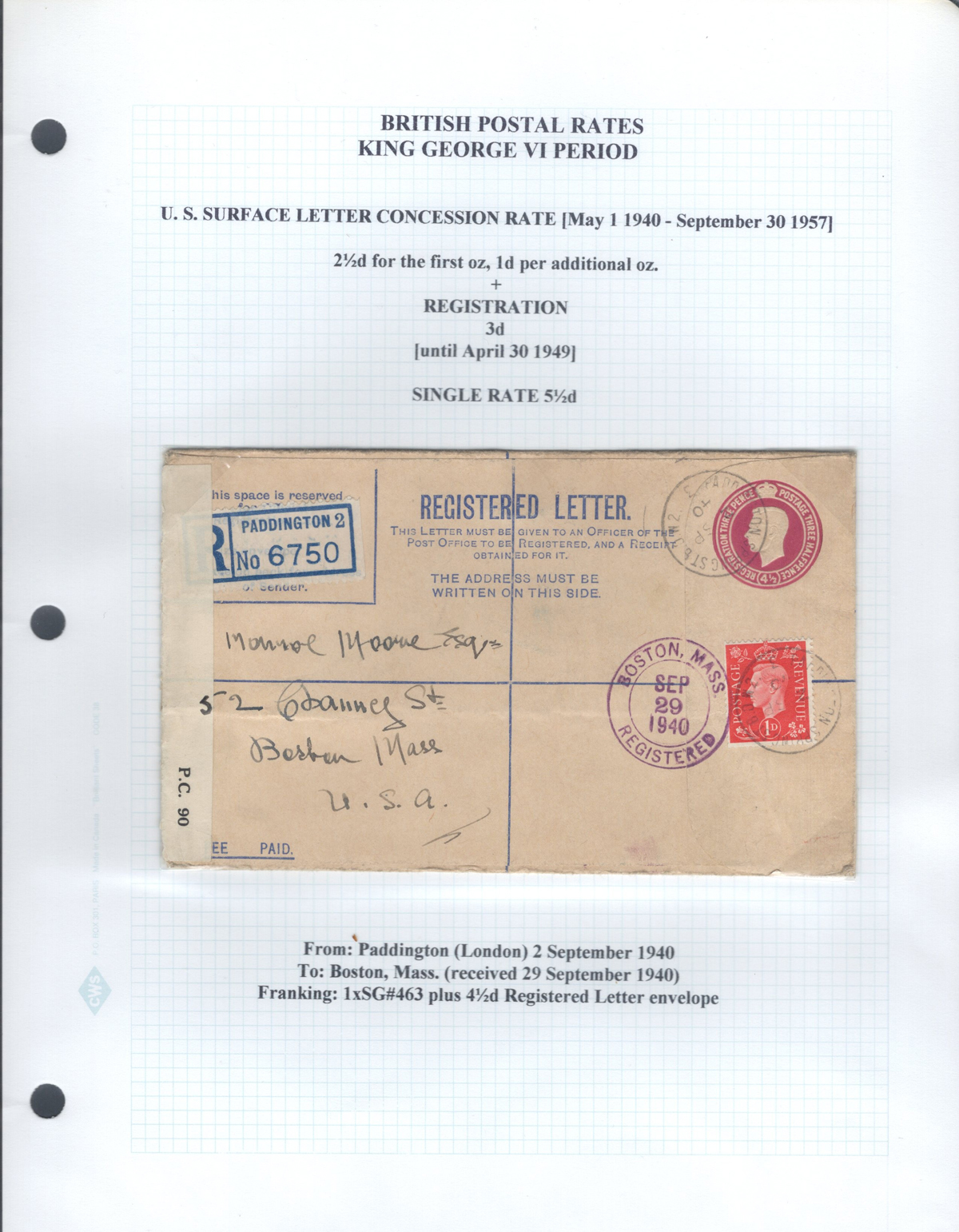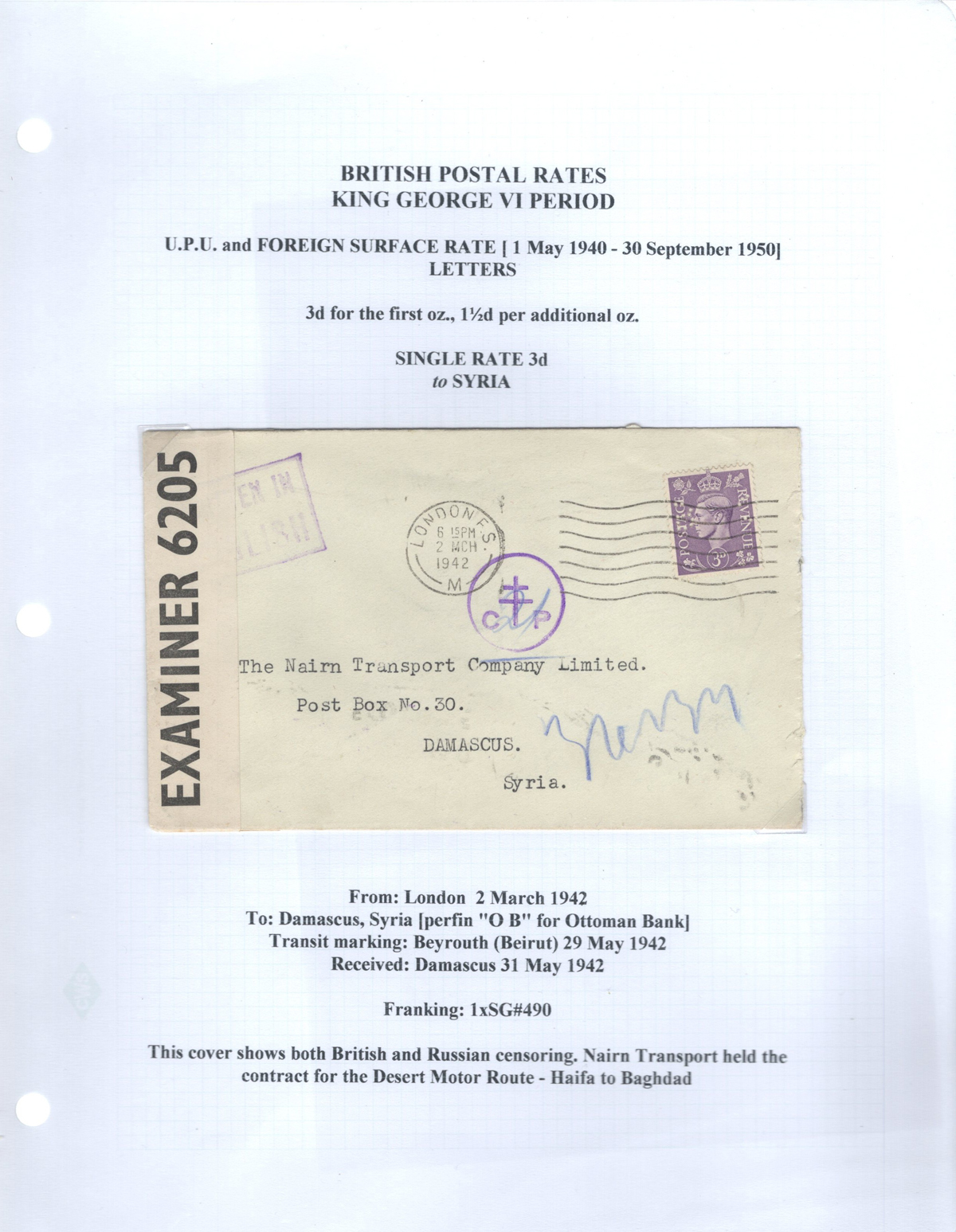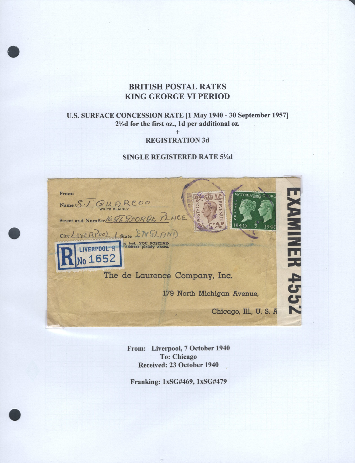 558 CVR/PC   imageCollection of 50 Great Britain Surface Mail Covers and Cards to Foreign Destinations, 1937-1951, all neatly displayed and written-up on pages in two binders. Destinations include France, Mexico, Spain, Argentina, Belgian Congo, Brazil, Greece, Russia, Syria, Uruguay, Cyprus, French West Africa, Japan, Austria, Iceland, Dutch West Indies, Egypt, Finland, USA, and more. Note censored and registered mail, postage due items, advertising covers, paquebot mail and an officially sealed cover. We note a great selection of rates, etc. Some with minor faults, still overall very fine. (Scan 1) (Scan 2) (Scan 3) (Scan 4) (Scan 5) (Scan 6) (Scan 7) (Scan 8) (Scan 9) (Scan 10) (Scan 11) (Scan 12) (Scan 13) (Scan 14) (All Scans) (All Images)