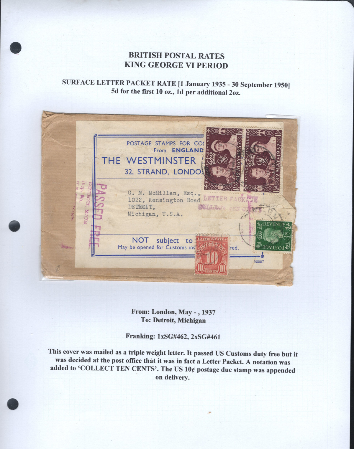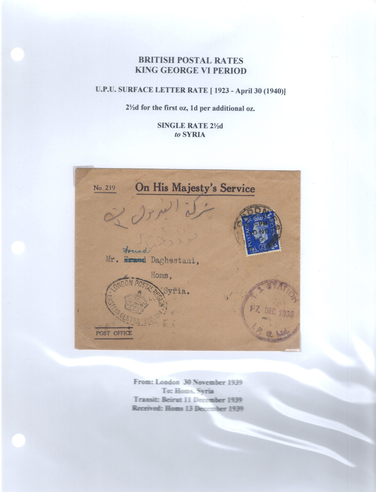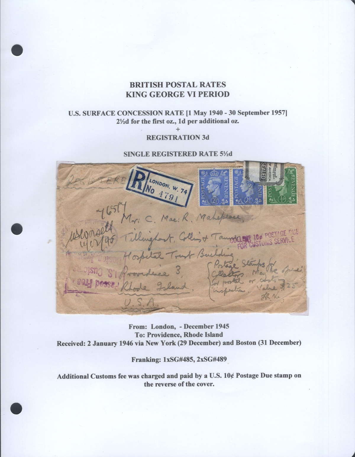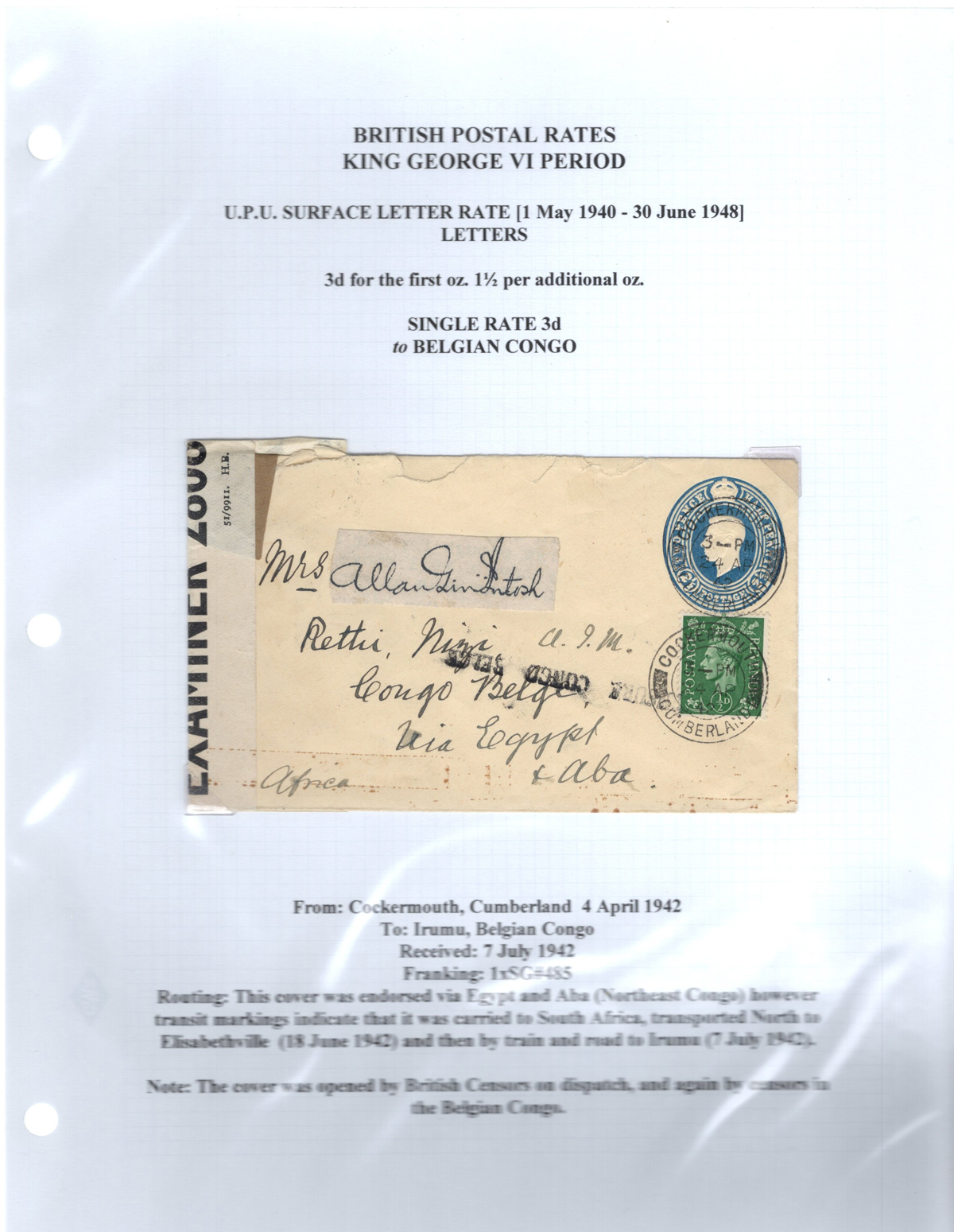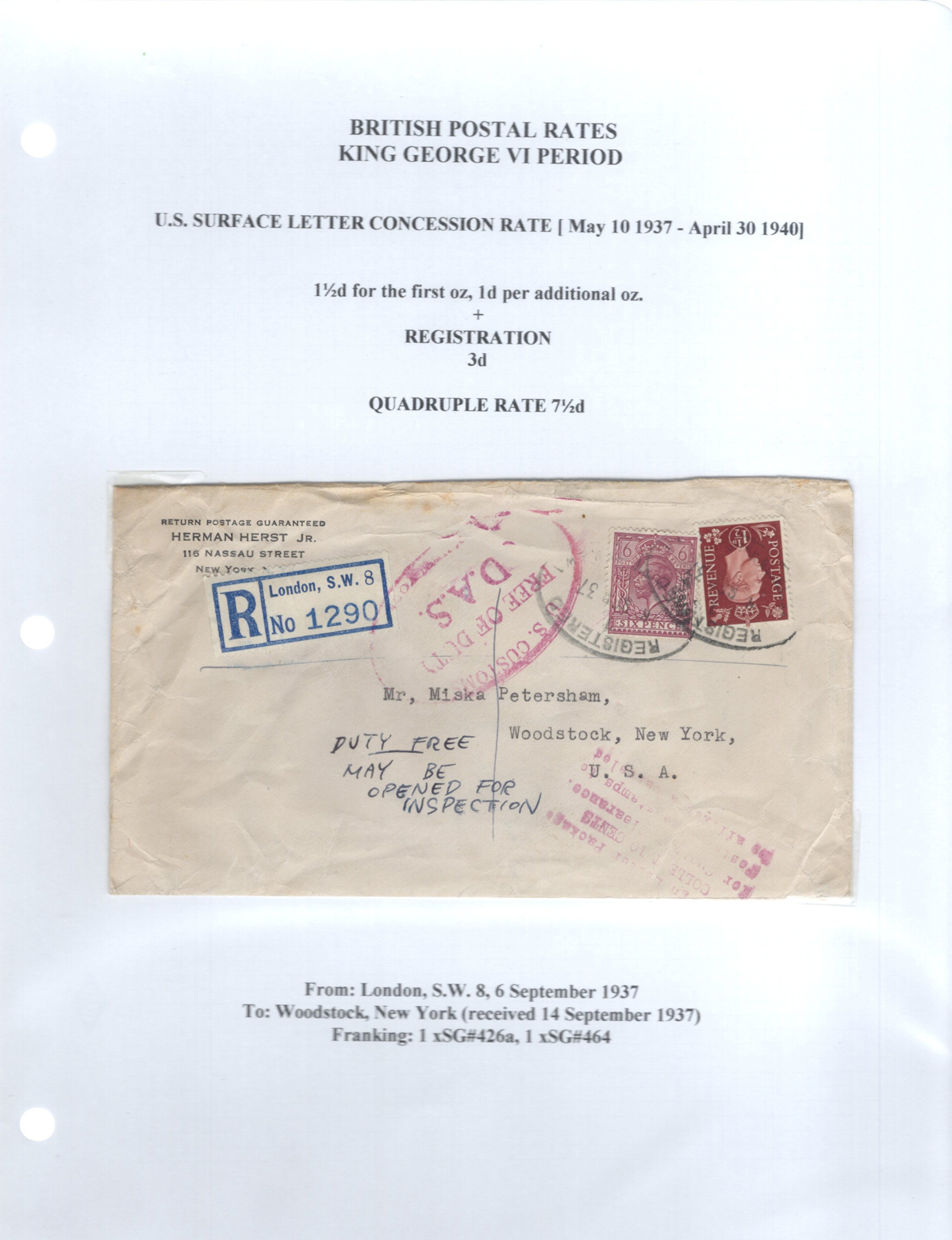 558 CVR/PC   imageCollection of 50 Great Britain Surface Mail Covers and Cards to Foreign Destinations, 1937-1951, all neatly displayed and written-up on pages in two binders. Destinations include France, Mexico, Spain, Argentina, Belgian Congo, Brazil, Greece, Russia, Syria, Uruguay, Cyprus, French West Africa, Japan, Austria, Iceland, Dutch West Indies, Egypt, Finland, USA, and more. Note censored and registered mail, postage due items, advertising covers, paquebot mail and an officially sealed cover. We note a great selection of rates, etc. Some with minor faults, still overall very fine. (Scan 1) (Scan 2) (Scan 3) (Scan 4) (Scan 5) (Scan 6) (Scan 7) (Scan 8) (Scan 9) (Scan 10) (Scan 11) (Scan 12) (Scan 13) (Scan 14) (All Scans) (All Images)
