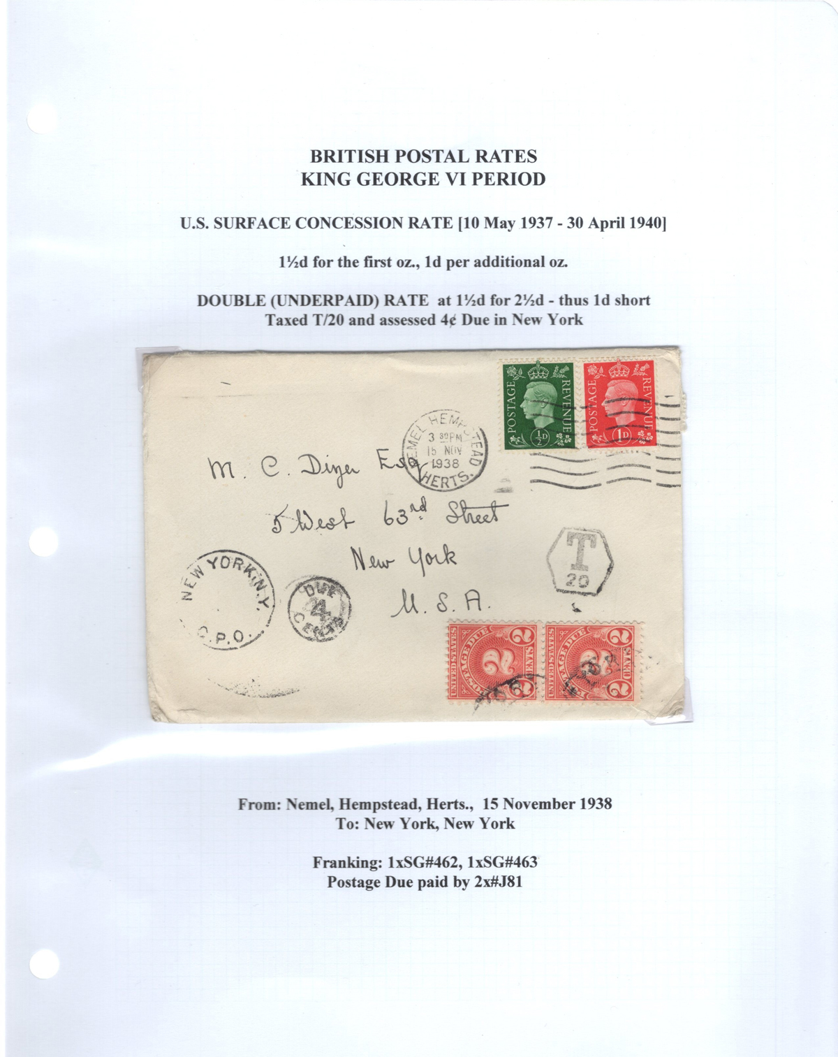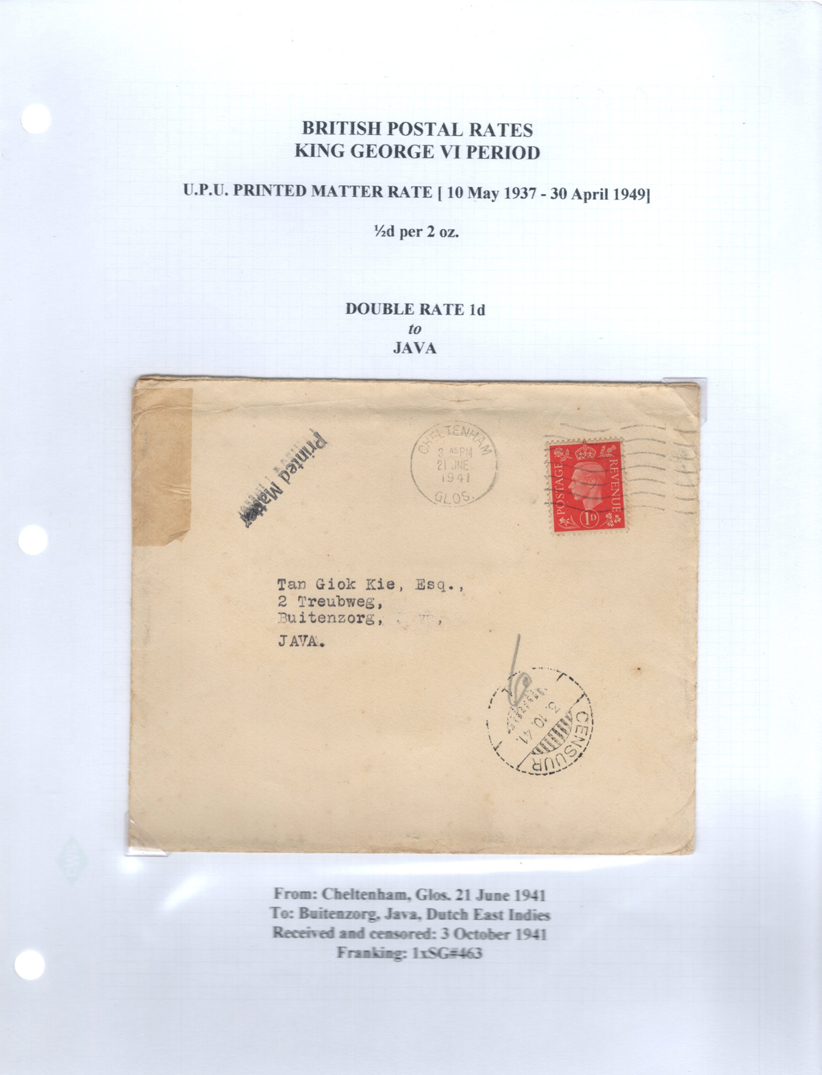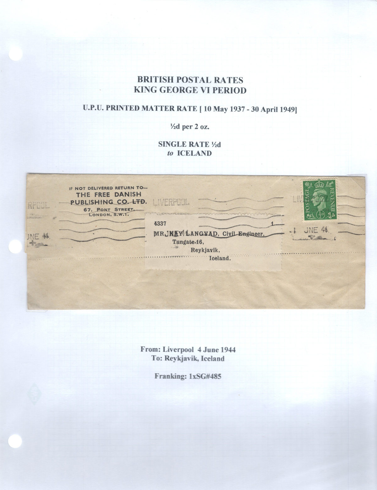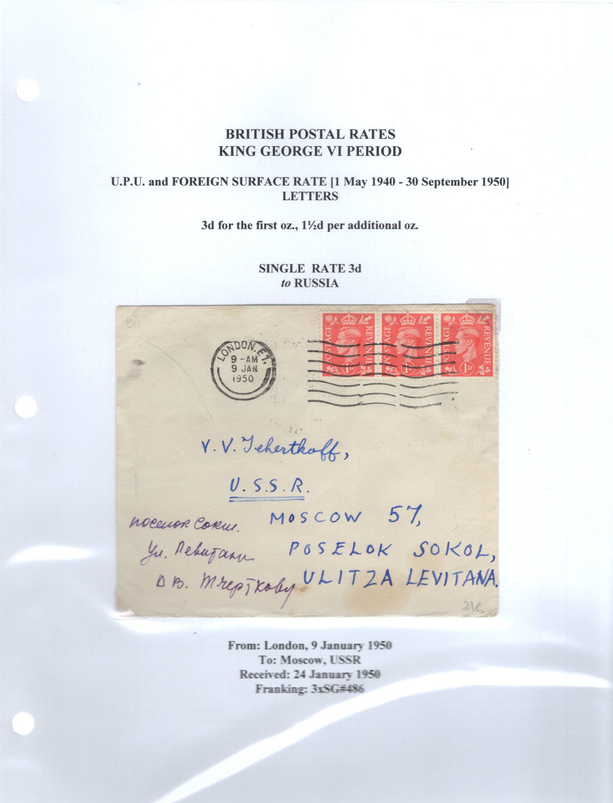 558 CVR/PC   imageCollection of 50 Great Britain Surface Mail Covers and Cards to Foreign Destinations, 1937-1951, all neatly displayed and written-up on pages in two binders. Destinations include France, Mexico, Spain, Argentina, Belgian Congo, Brazil, Greece, Russia, Syria, Uruguay, Cyprus, French West Africa, Japan, Austria, Iceland, Dutch West Indies, Egypt, Finland, USA, and more. Note censored and registered mail, postage due items, advertising covers, paquebot mail and an officially sealed cover. We note a great selection of rates, etc. Some with minor faults, still overall very fine. (Scan 1) (Scan 2) (Scan 3) (Scan 4) (Scan 5) (Scan 6) (Scan 7) (Scan 8) (Scan 9) (Scan 10) (Scan 11) (Scan 12) (Scan 13) (Scan 14) (All Scans) (All Images)