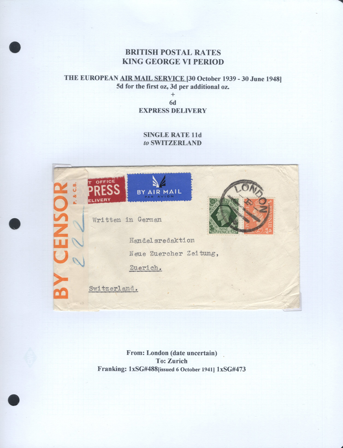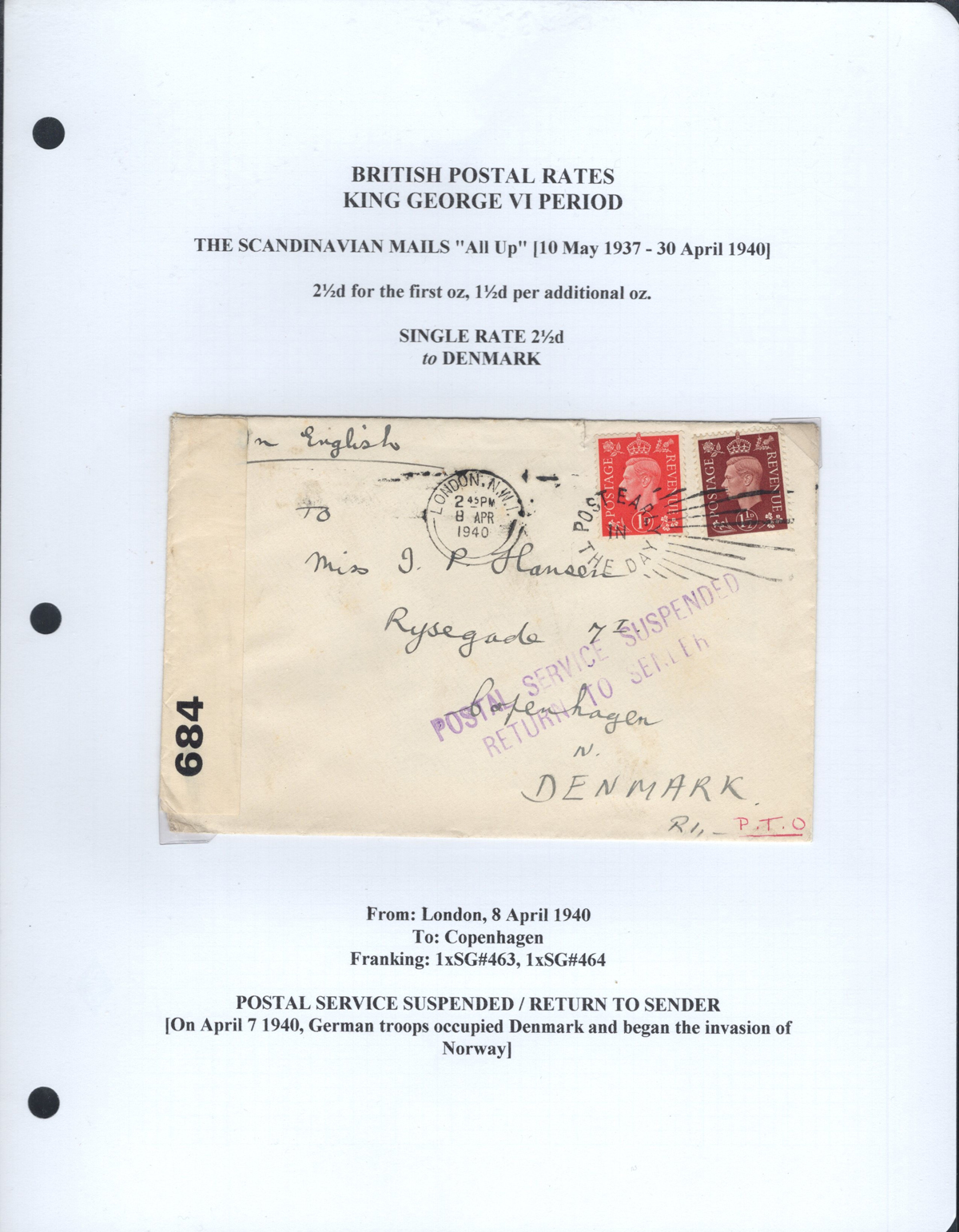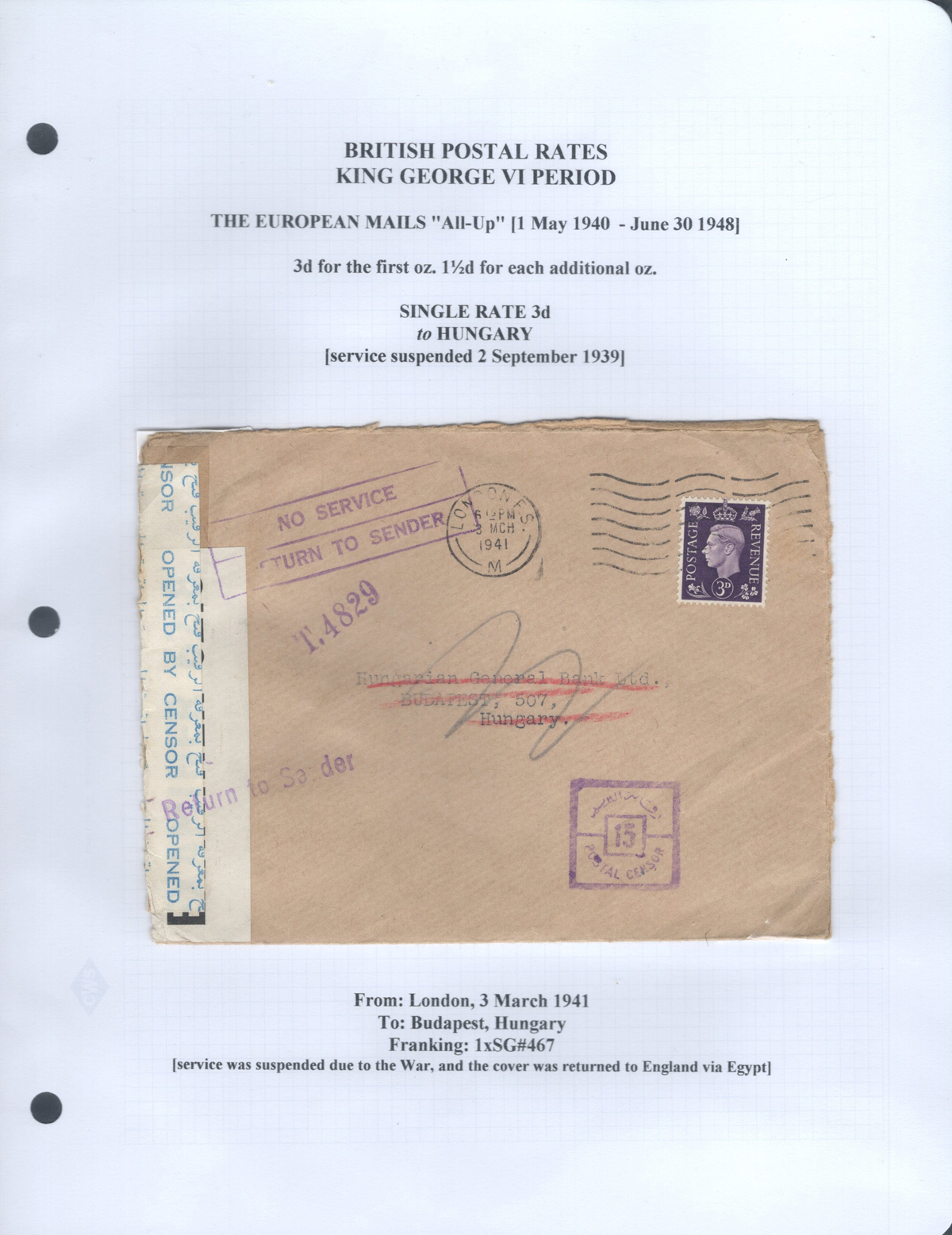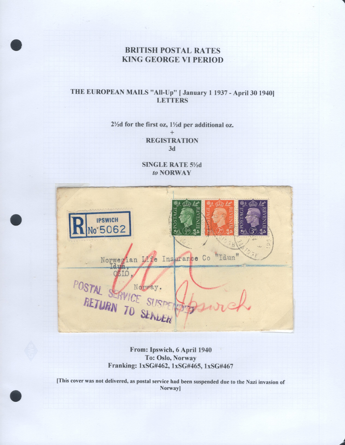 560 CVR/PC   imageSpecialized Collection of 49 G.B. George VI Covers and Cards Showing Surface and Airmail to Europe and Scandinavia, 1937-1953, all neatly written-up on exhibit pages in a binder. Includes surface mail rates to Denmark, Estonia, Finland, France, Germany, Hungary, Latvia, Norway, Poland, Spain, Switzerland, Sweden, Russia and more. Airmail rate covers are to Austria, Poland, Switzerland, Belgium, France, Gibraltar, Liechtenstein, Spain, Sweden, Germany, Portugal and more. Note censored mail, express and registered covers, U.K. railway mail, service suspended / return to sender and postage due covers, etc. Note the typical small edge, etc. faults, otherwise a very fine collection. (Scan 1) (Scan 2) (Scan 3) (Scan 4) (Scan 5) (Scan 6) (Scan 7) (Scan 8) (Scan 9) (All Scans) (All Images)