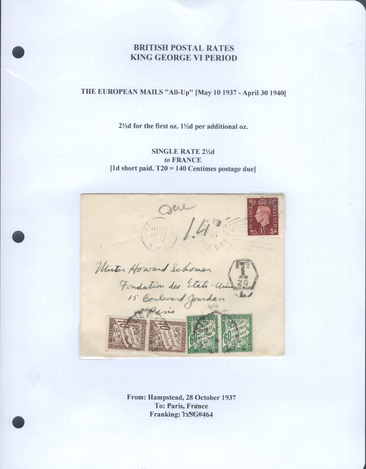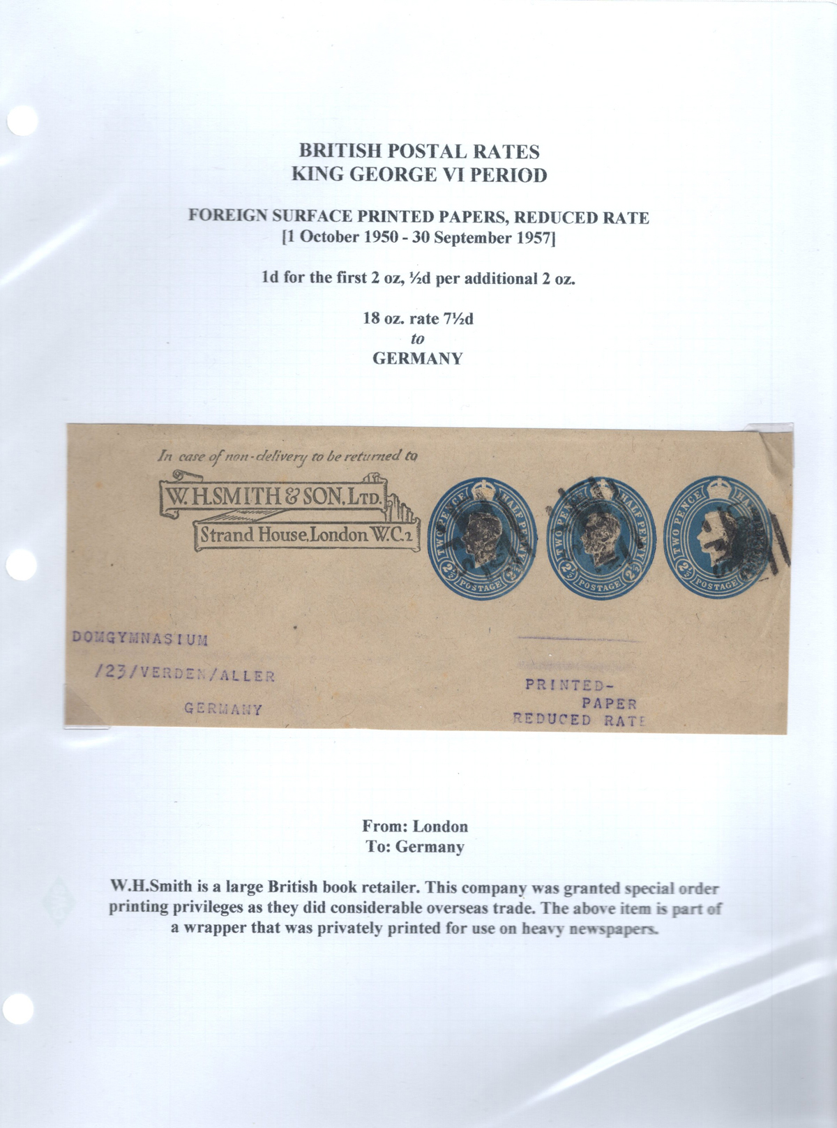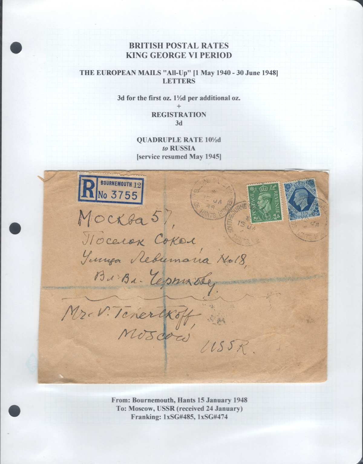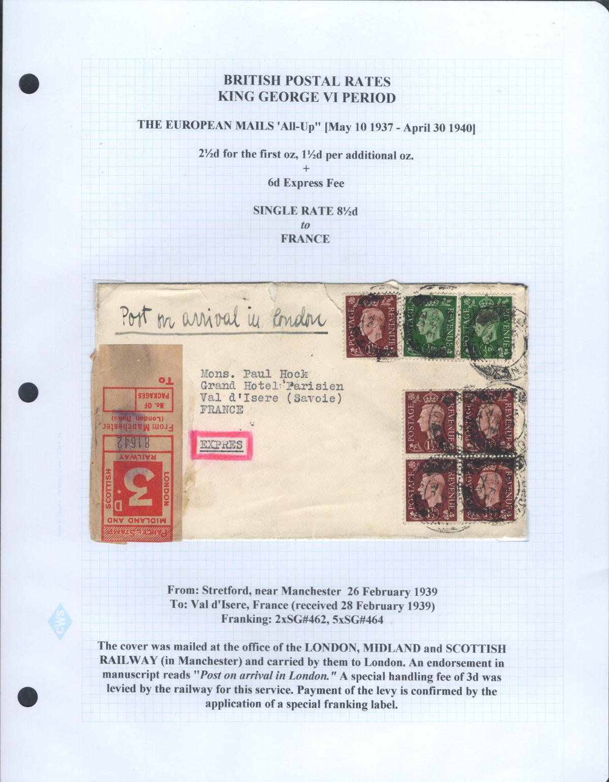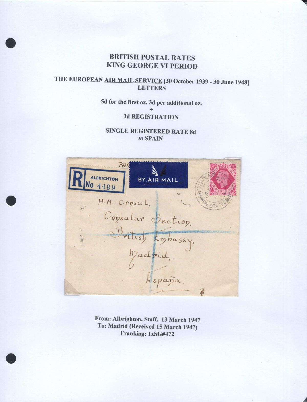 560 CVR/PC   imageSpecialized Collection of 49 G.B. George VI Covers and Cards Showing Surface and Airmail to Europe and Scandinavia, 1937-1953, all neatly written-up on exhibit pages in a binder. Includes surface mail rates to Denmark, Estonia, Finland, France, Germany, Hungary, Latvia, Norway, Poland, Spain, Switzerland, Sweden, Russia and more. Airmail rate covers are to Austria, Poland, Switzerland, Belgium, France, Gibraltar, Liechtenstein, Spain, Sweden, Germany, Portugal and more. Note censored mail, express and registered covers, U.K. railway mail, service suspended / return to sender and postage due covers, etc. Note the typical small edge, etc. faults, otherwise a very fine collection. (Scan 1) (Scan 2) (Scan 3) (Scan 4) (Scan 5) (Scan 6) (Scan 7) (Scan 8) (Scan 9) (All Scans) (All Images)