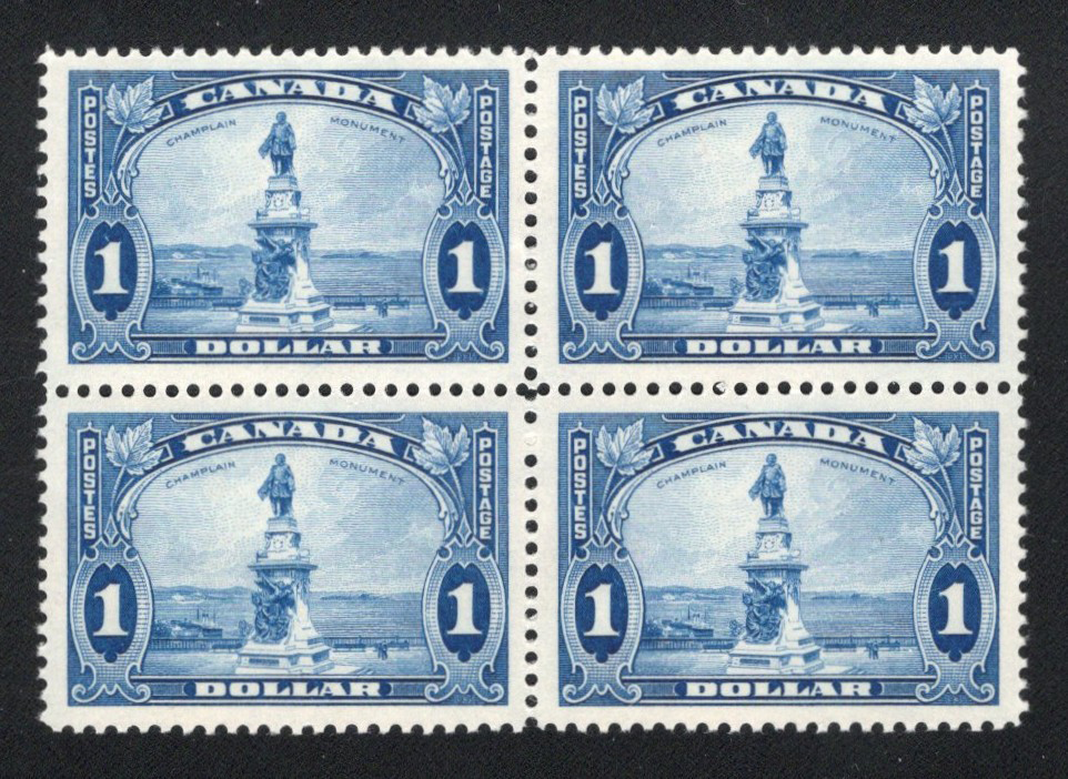 42 nh 227 image1935 $1 Blue Champlain Statue, a mint never hinged block of four, all centered and very fine.