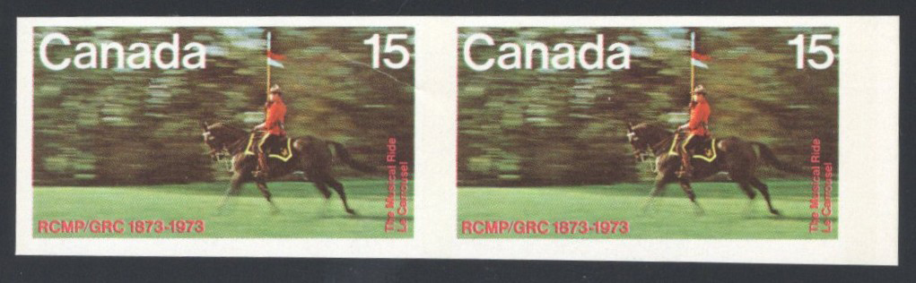 52 nh 614a image1973 15c RCMP Musical Ride Imperforate, a mint never hinged horizontal sheet margin pair, with a light internal wrinkle on one stamp, else very fine.