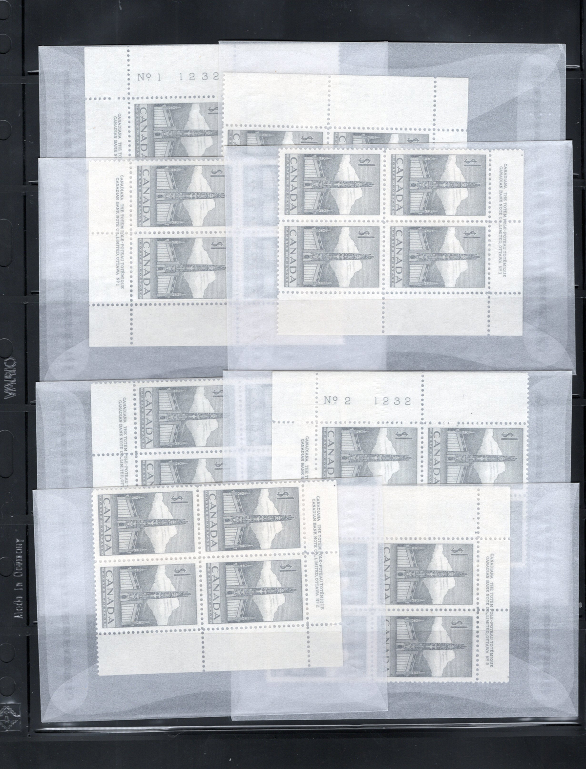 46 nh 321 image1953 $1 Grey Totem Pole, a plate 1 and plate 2 matched set of four corner plate blocks of four, mint never hinged and very fine.