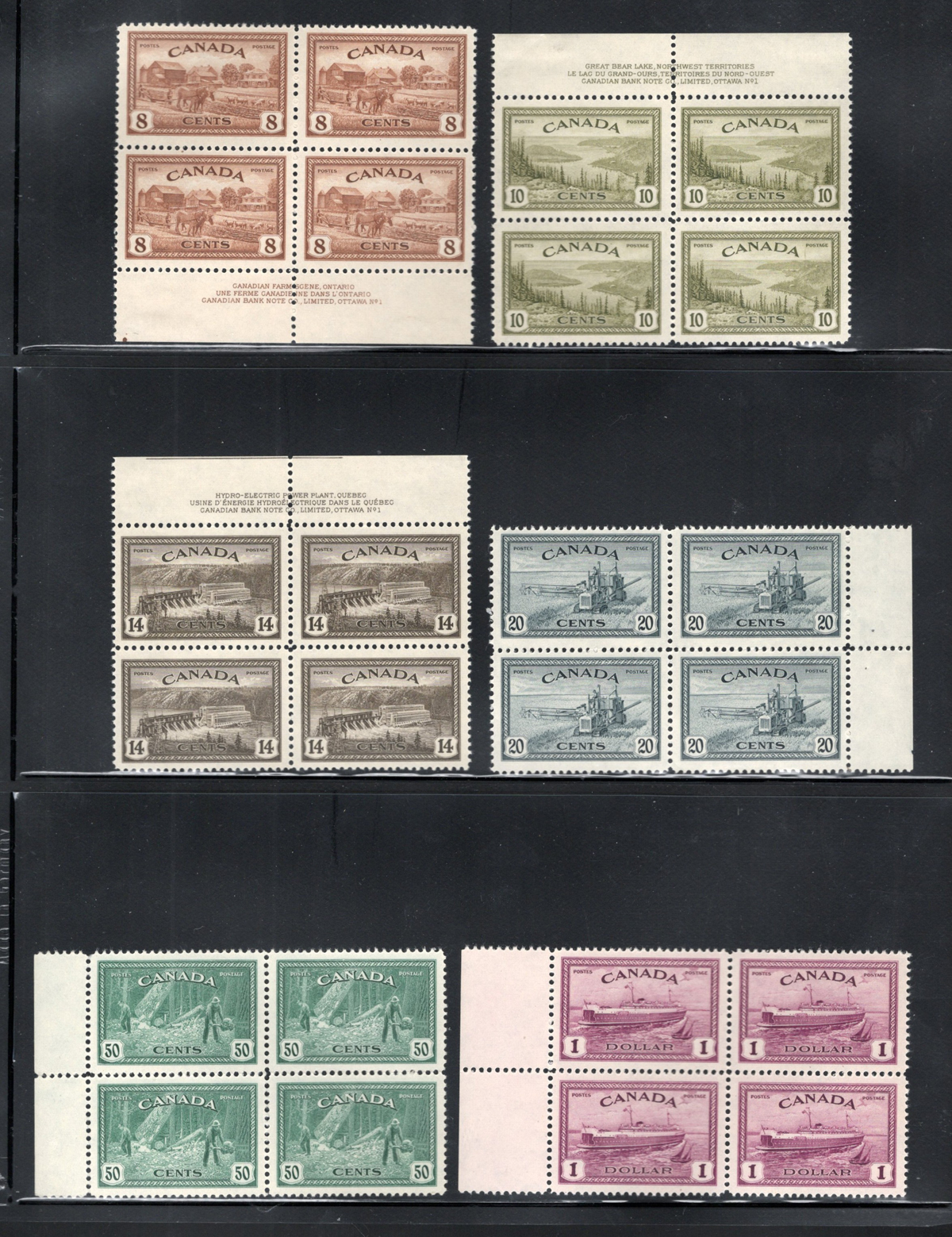 44 nh 268-273 image1946 8c to $1 King George VI Peace Set, each value in a mint never hinged block of four with sheet selvedge, with the three low values having plate inscriptions. Generally very fine, a few of the selvedges are hinged, so catalogue value is for the stamps only.