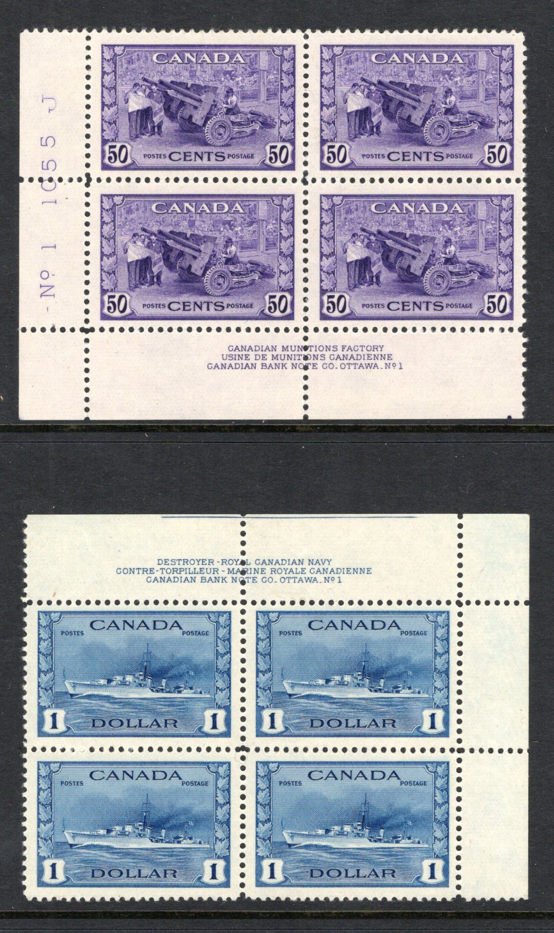 43 nh 261, 262 image1942 50c and $1 King George VI War Issues, both are mint never hinged plate blocks of four, (50c is LL and $1 is UR), each with insignificant natural tiny spots on the gum (only mentioned for the fussiest collectors), still fresh and very fine.