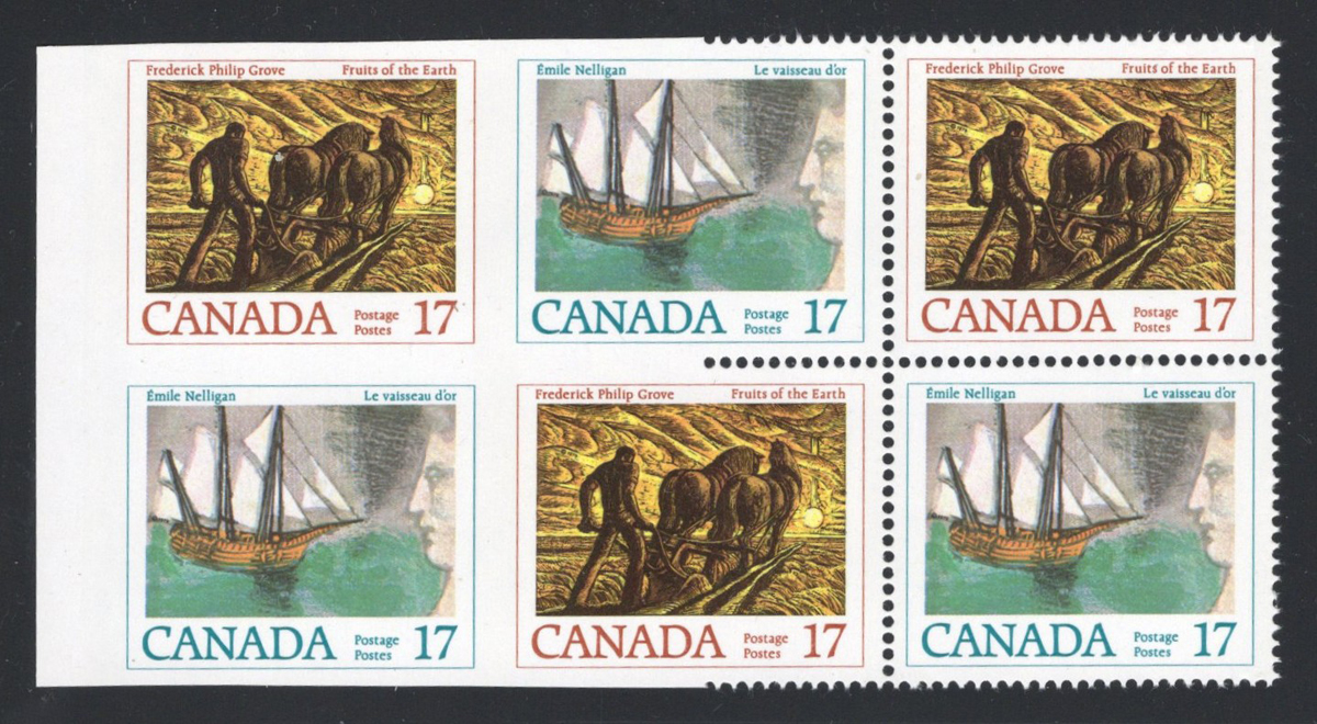 58 nh 818c image1979 17c Canadian Authors Block of Six, with Left Pair Imperforate, a mint never hinged se-tenant block of six, with left vertical pair completely imperforate, middle pair part-perforate and right pair normally perforated. A pristine example of this rare perforation variety.