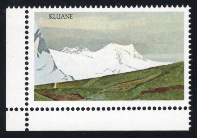 56 nh 727a image1979 ($2) Kluane National Park, with Silver Inscriptions Omitted, a mint never hinged lower left sheet corner single, fresh and very fine. Unitrade states "approx. 500-600 exist".