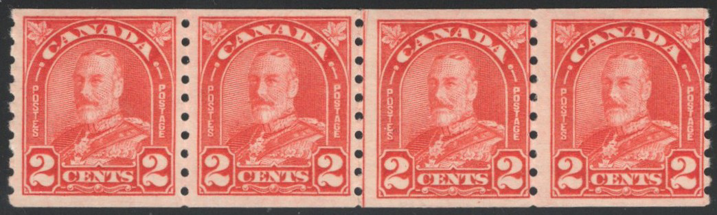 41 nh 181iii image1930 2c Deep Red King George V Arch Coil Line Strip with "Cockeyed King" Variety, a mint never hinged strip of four with balanced margins, very fine.