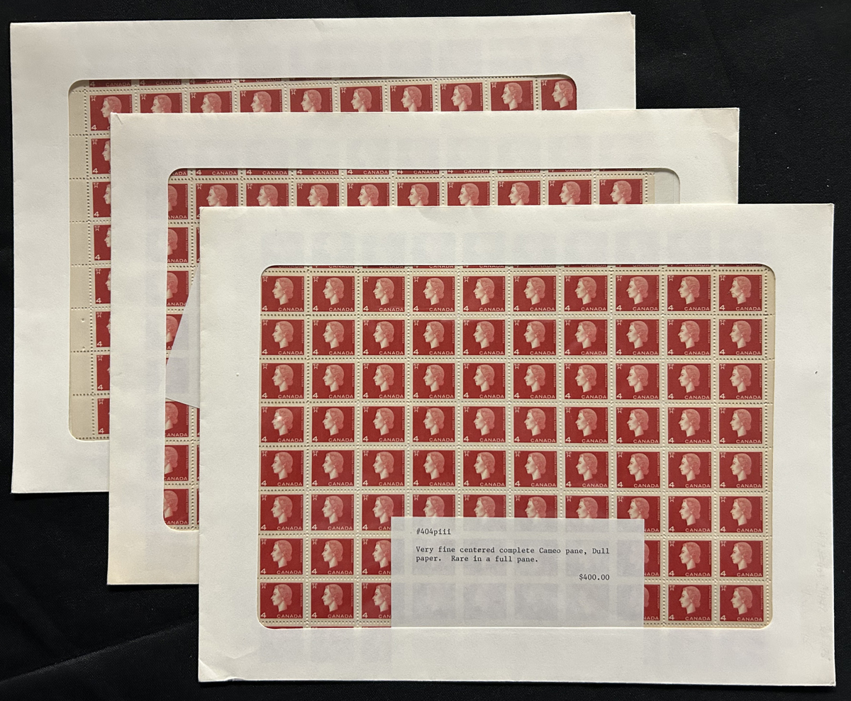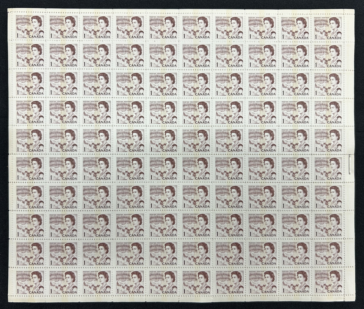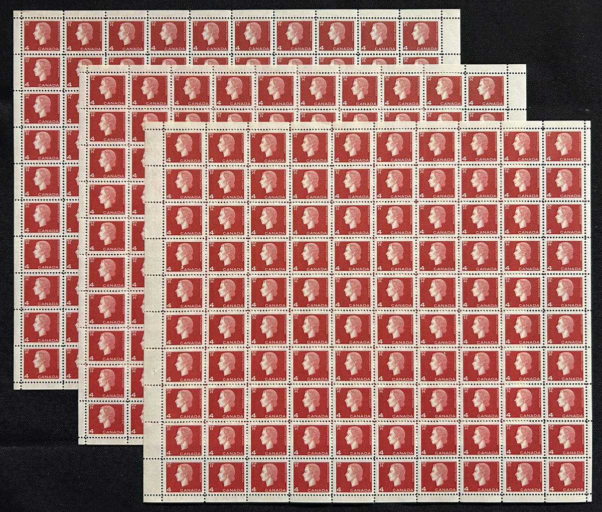 49 nh 404p, 404piii image1963-64 4c Carmine Queen Elizabeth II Cameo, Tagged, a lot of 60 complete tagged, field stock sheets of 100, starting off with a Bileski offering of three sheets of #404piii (WCB 8mm, catalogue value of $1,500 alone) and the rest appear to have a variety of tagging, including wide and narrow bars, centre or side, etc. (unchecked by us). Some sheets have parts of their selvedge missing, else an overall fine to very fine group, and a great opportunity for further study. At a minimum of $1 per stamp the low catalogue value would be $6,000 but many will catalogue more. Photos only show a small sampling. (Scan 1) (Scan 2) (All Scans) (All Images)