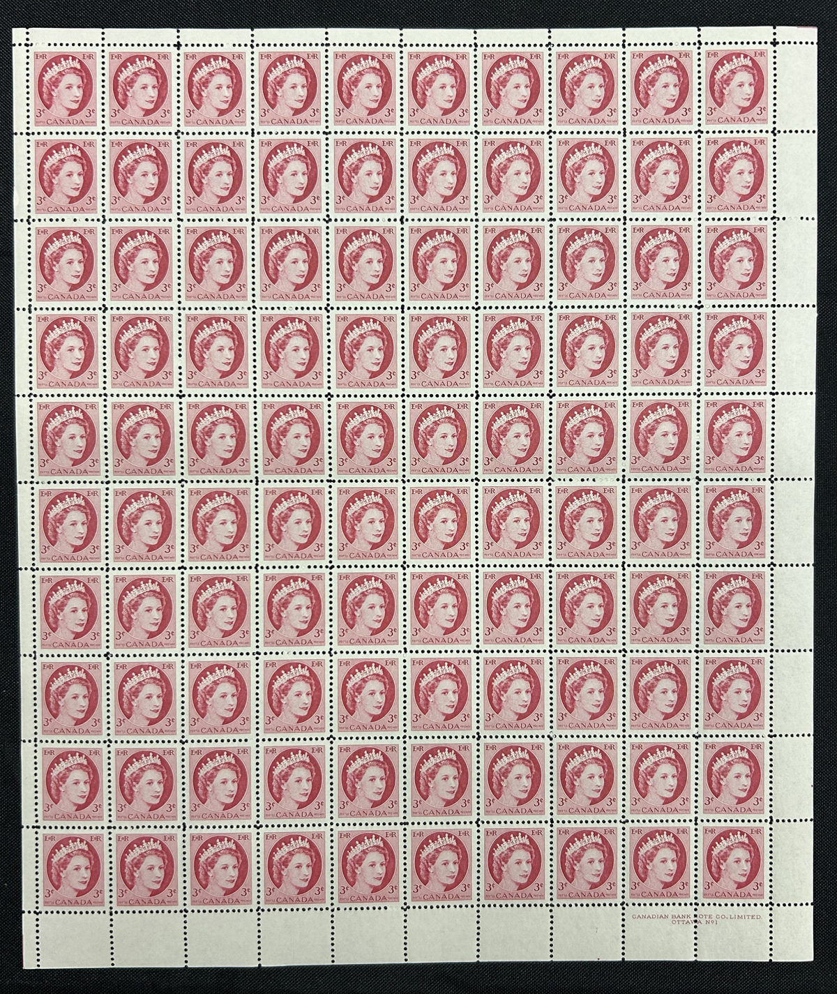 47 nh 339iii image1954 3c Carmine Rose Queen Elizabeth II Wilding, Hibrite Paper, a complete mint never hinged sheet of 100, with plate 1 inscription at lower right, folded horizontally, still quite fresh, very fine and scarce.