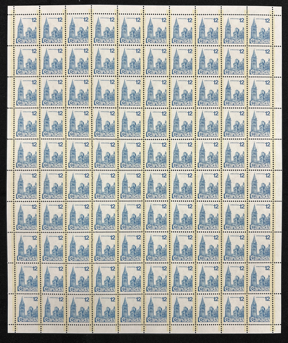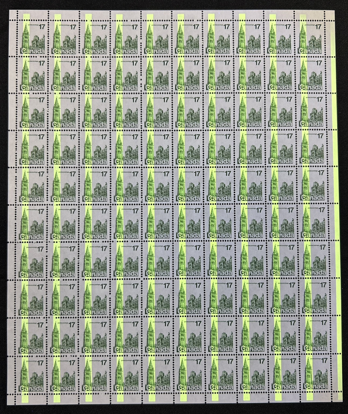 57 nh 790 T3 image1979 17c Green Parliament with Single Bar Tagging, a complete mint never hinged sheet of 100, with G2aL tagging (one bar at left only) on all stamps. A fresh and never previously folded sheet, very fine. Catalogue value is from the Adminware Online Tagging Database.