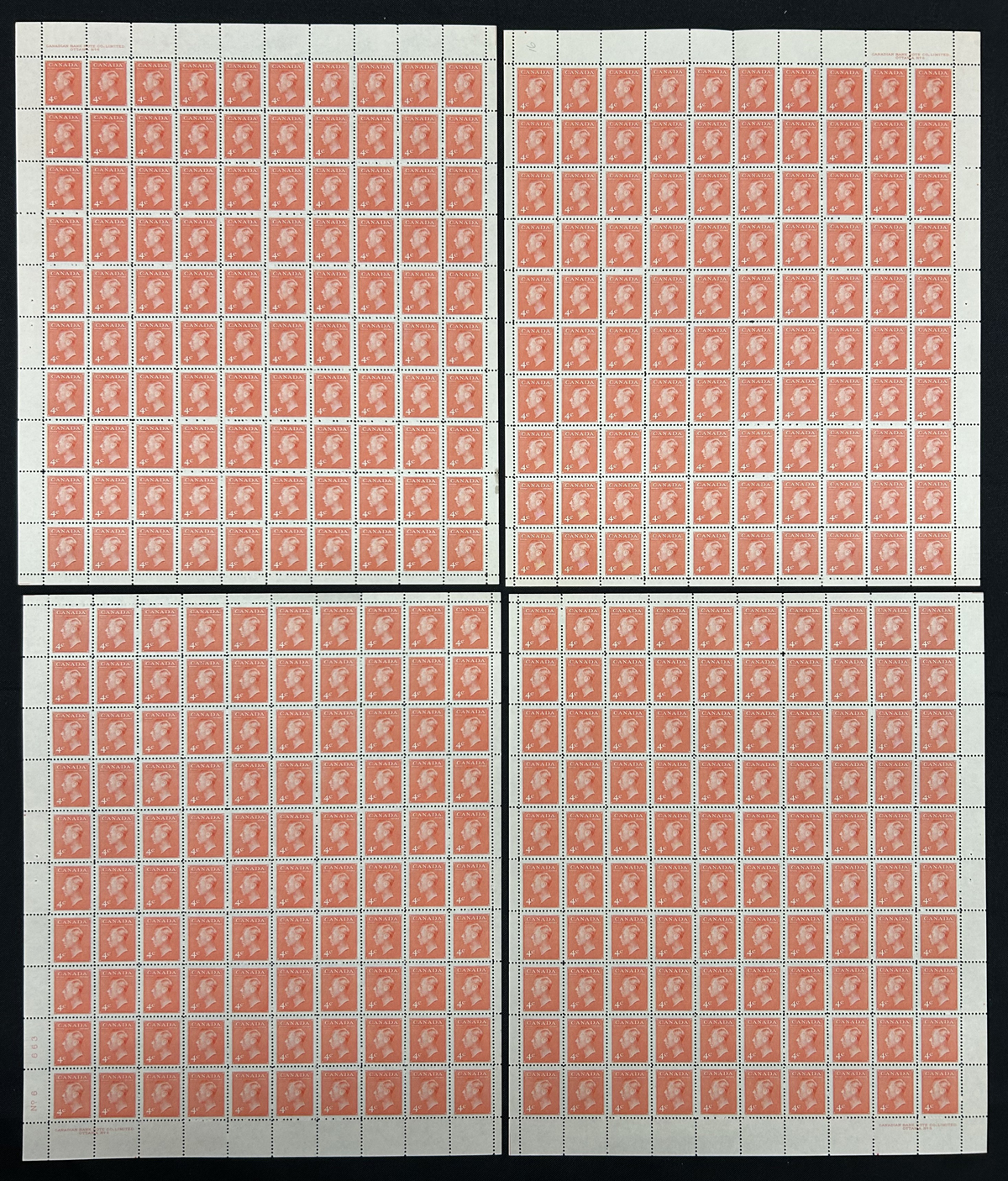 45 nh 306 image1951 4c Orange Vermillion King George VI, a matched set of four complete plate 6 full sheets of 100, with the lower left also showing hairlines in the left margin. Fresh and very fine, almost certainly one of the last remaining plate 6 matched sets of four corner sheets.