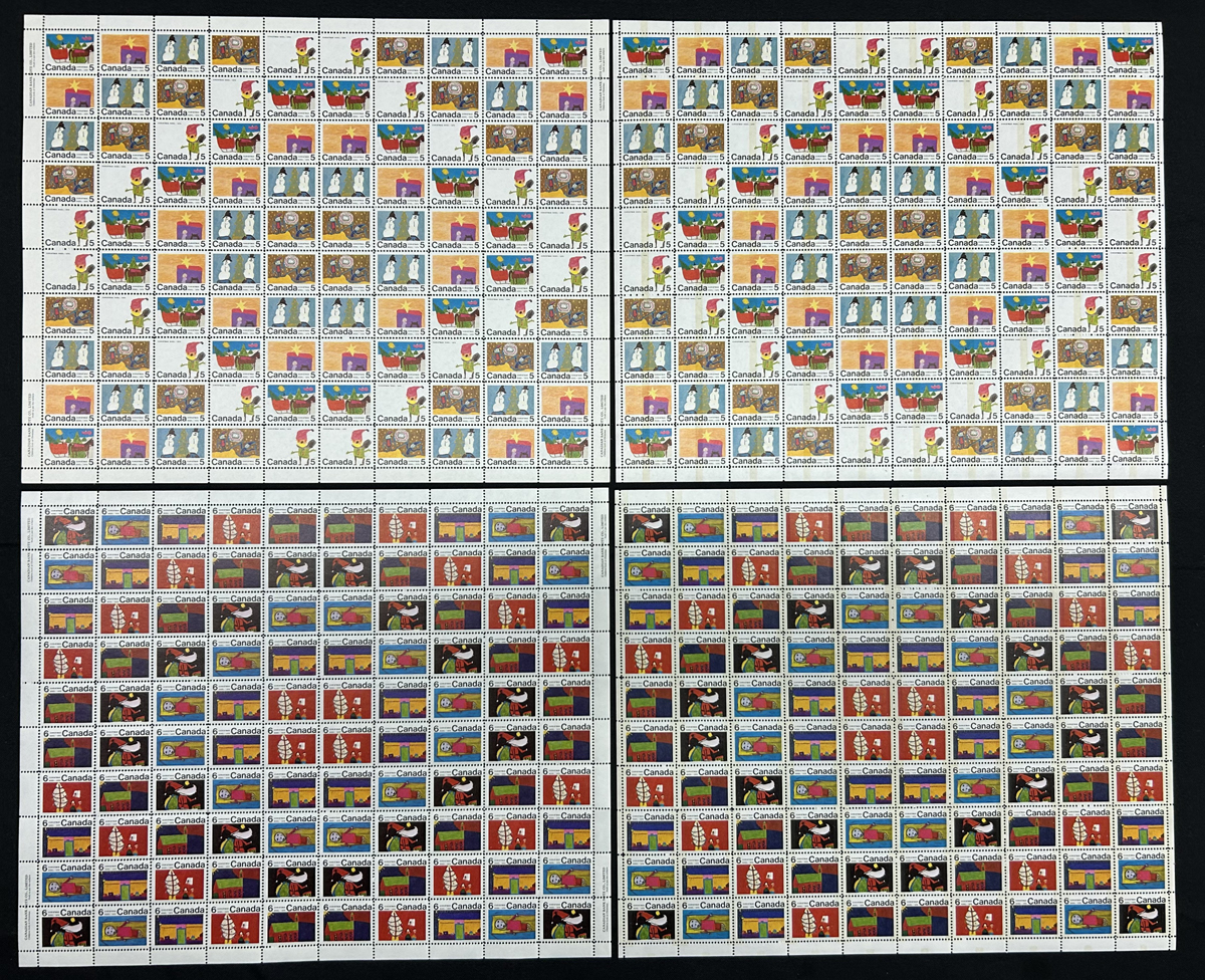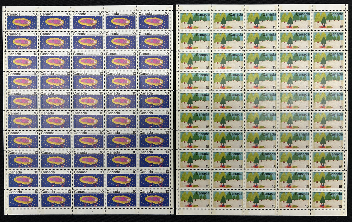51 nh 519-530 image1970 5c to 15c Christmas Issue Set, of 6 complete sheets (of 100 for the low values and 50 for the 10c and 15c), including two tagged and two untagged 5c and 6c sheets, plus a tagged 10c sheet (529p) and a tagged 15c sheet (530p). the 5c and 6c sheets show all sorts of printing flaws, such as #s 522iii, 522iv, 523i, 523pii, 523piii, 525ii and of course both tagged centre blocks ($200 each). Mint never hinged and fresh, rarely offered with the high values included, very fine. (Scan 1) (Scan 2) (All Scans) (All Images)