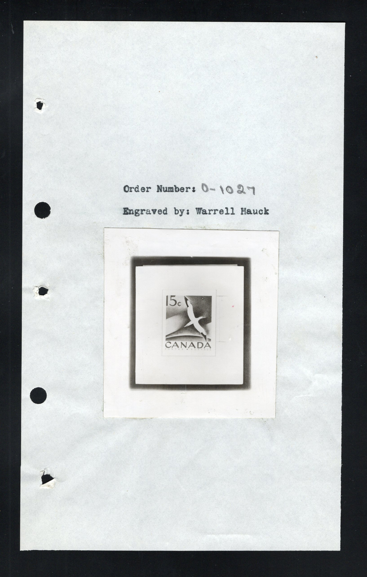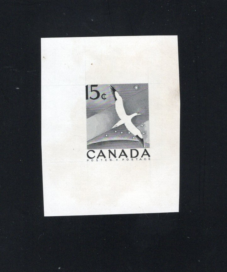 48 E/P 343DP imageTwo Pre-Production Items for the 1954 Gannet Issue, with a large progressive die proof in colour of issue printed on thin glazed card measuring 37 x 48mm. Also a photographic print of a different progressive proof mounted on a card mounted on an index sheet with order number and engraver's name. Both differ from the original with minute differences, such as an extra star in front of the Gannet's beak on the die proof, different shading around the "15c", etc. Very fine and scarce. Would be a great accompaniment to the 15c Gannet rates collection offered in our postal history section, perhaps as two great items for the title page of an exhibit. (Scan 1) (Scan 2) (All Scans) (All Images)