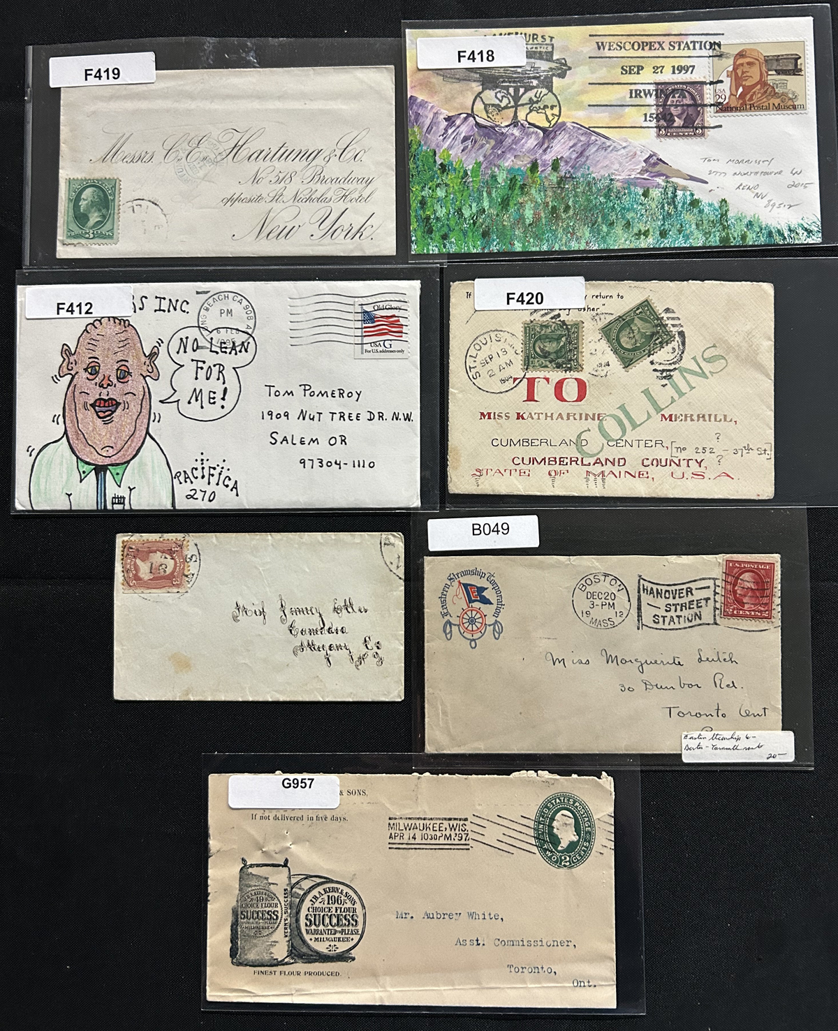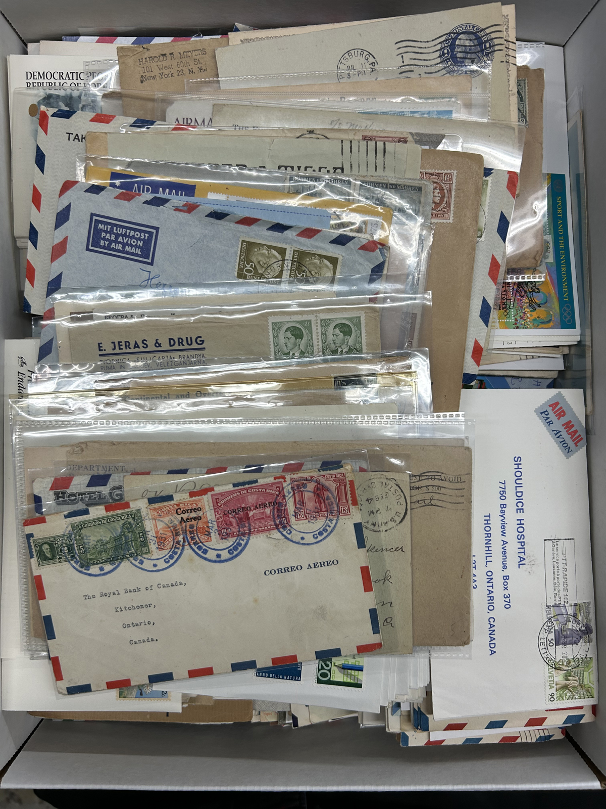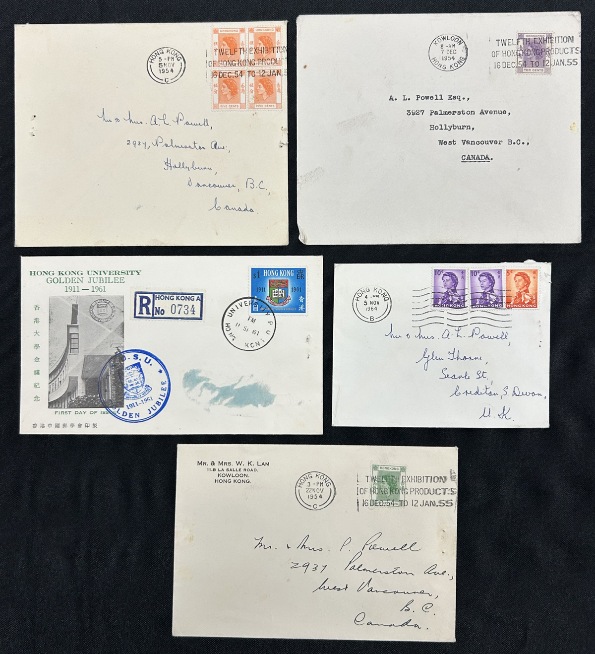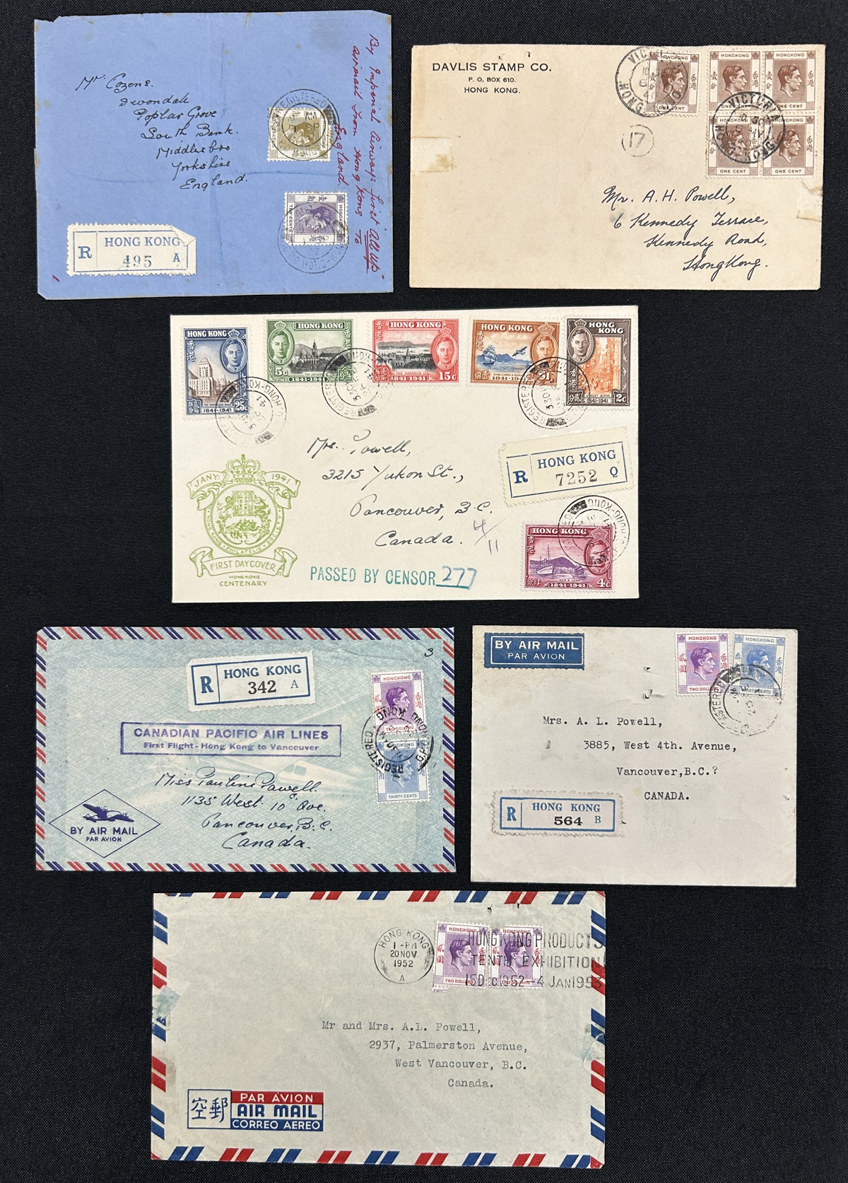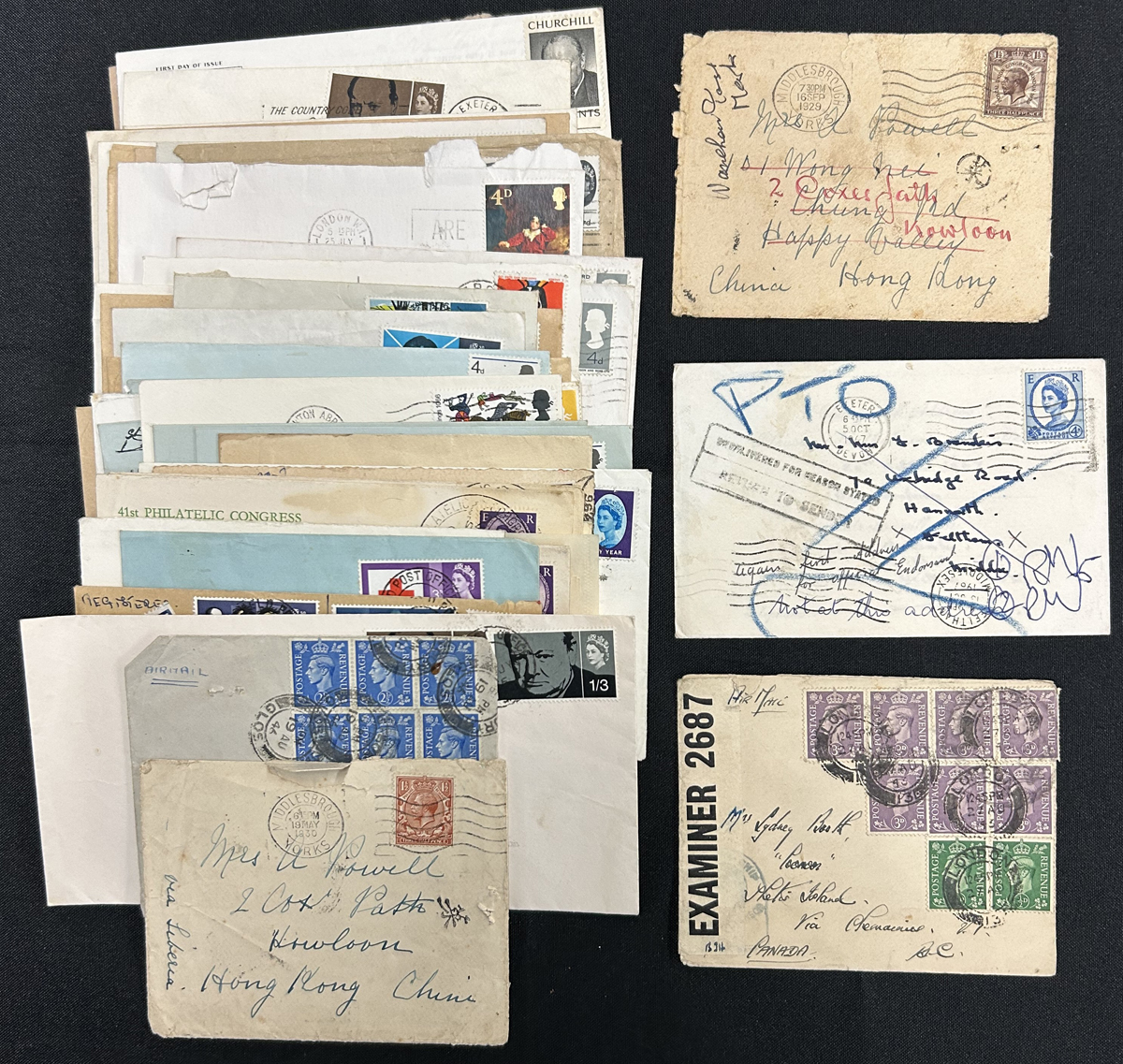 586 CVR   imageGroup of 184 Covers from Hong Kong, England etc., the accumulation of a collector having lived in Vancouver BC, Hong Kong and England, the majority are addressed to him, but there are others included. The group includes Hong Kong covers (x39, between 1938 and 1966, mostly addressed to Canada or England), England group of 14 (1822 to 1867, many from Exeter), England group of 47 covers (1929 to 1960s), India (11 covers mailed to Canada between 1951 and 1952) as well as 73 covers from various countries such as USA, Malta, Germany, Belgium (1940s to 1960s), Many are roughly opened or have staple holes, still overall fine to very fine - see pictures for an idea. Includes 14 oversize covers not counted. (Scan 1) (Scan 2) (Scan 3) (Scan 4) (Scan 5) (Scan 6) (Scan 7) (Scan 8) (All Scans) (All Images)