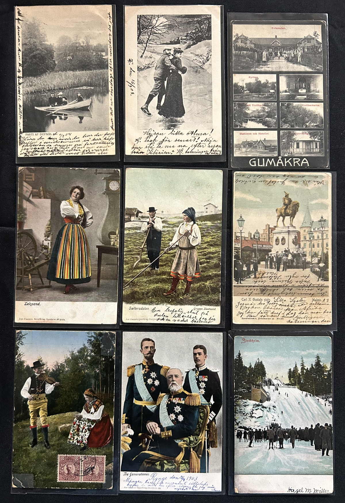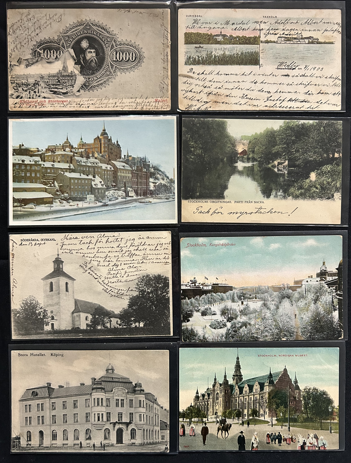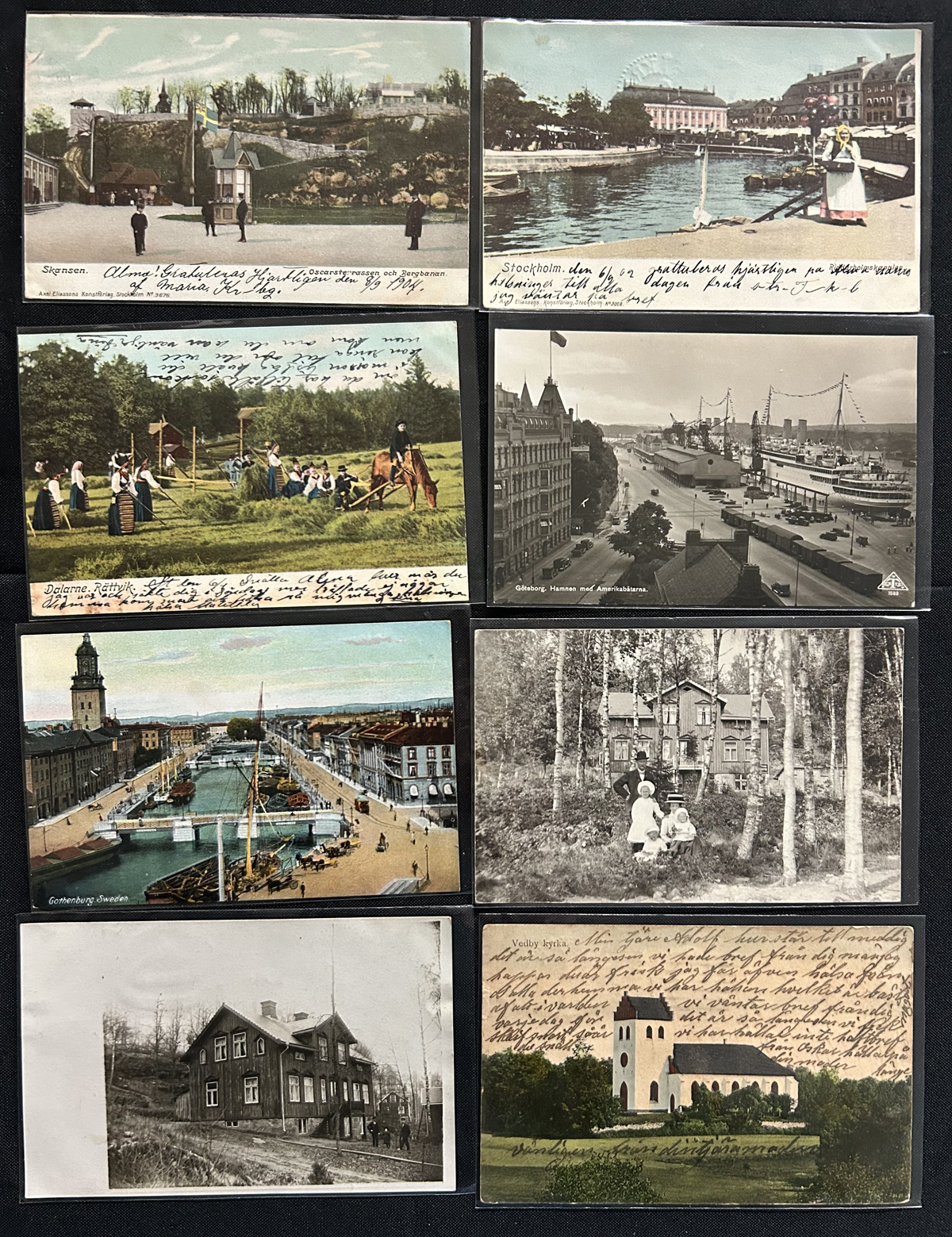 594 PC   imageGroup of Over 200 Early Picture Postcards from Sweden, with a good variety of town scenes, waterfronts, buildings, some patriotic-themed, farm scenes and much more. We estimate that over 80% of the cards were mailed from Sweden in the 1902 to 1919 period, franked either at the 5 ore (domestic) or 10 ore (foreign) rate. The message sides have interest as well, as we noted many dotted circular town cancels, etc. Quality is overall very nice and each card is individually sleeved. (Scan 1) (Scan 2) (Scan 3) (All Scans) (All Images)