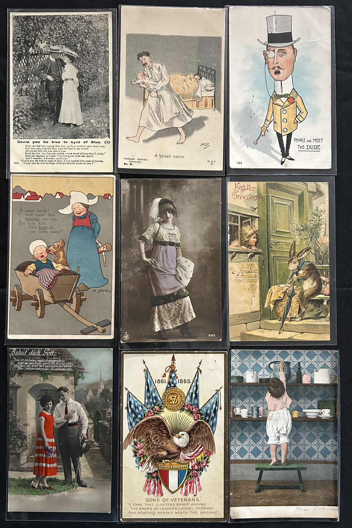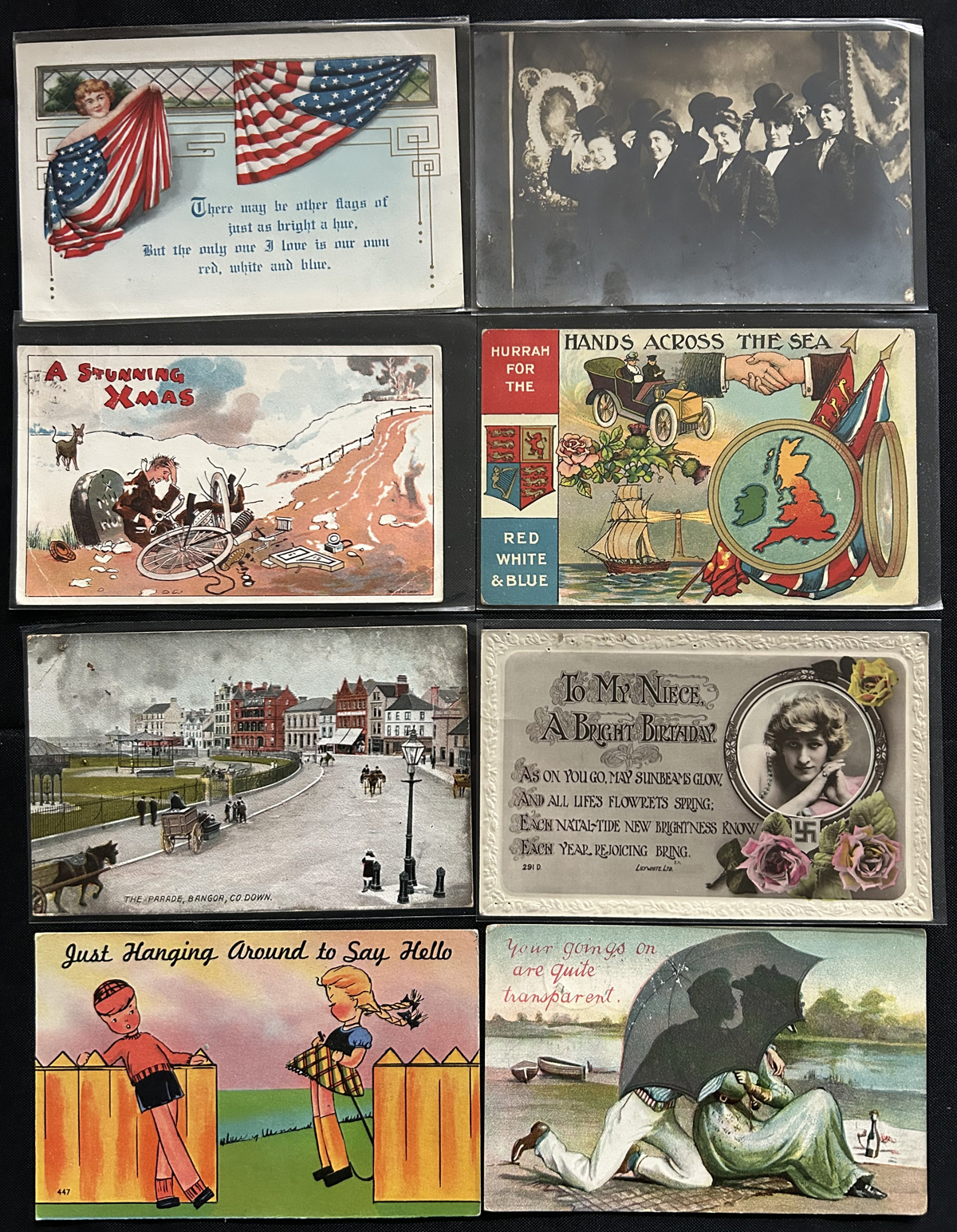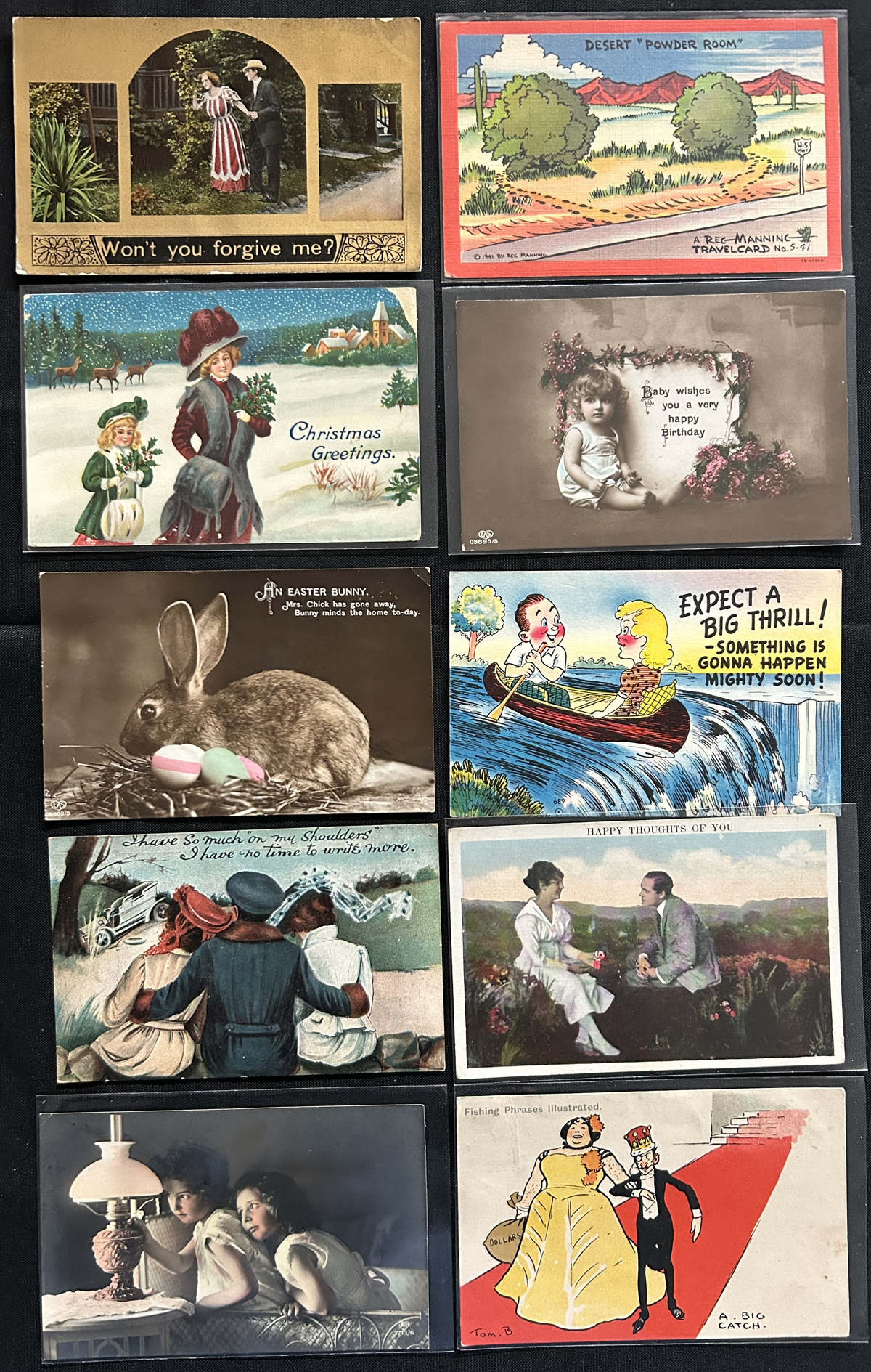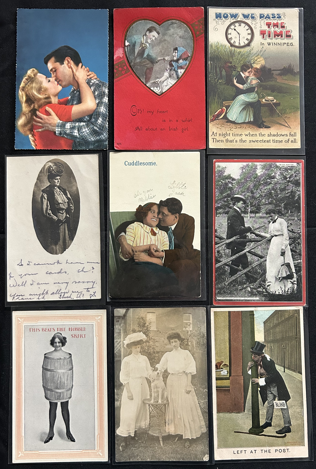 597 PC   imageGroup of About 500 Picture Postcards on Various Themes, including love themes (courting, dating, kisses, etc.), humourous, Christian religion, and events such as Christmas, Easter, Thanksgiving, New Year's Eve, St Patrick's Day, etc. Appear to be mostly from Canada, United States and England. We estimate that about half of the cards were mailed and date from the early 1900s to the 1920s period, and there appears to be some up to about the 1950s. Quality is overall average (with the odd fault, here and there) and many of the cards are individually sleeved. (Scan 1) (Scan 2) (Scan 3) (Scan 4) (All Scans) (All Images)